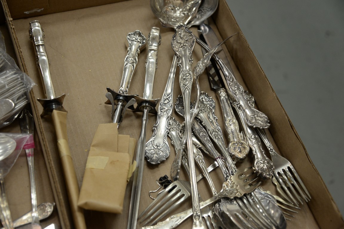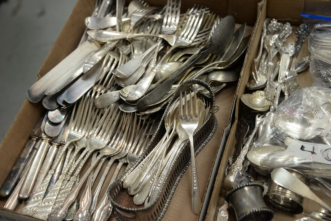 Three tray lots of silverplated flatware, serving pieces, napkin rings, etc.