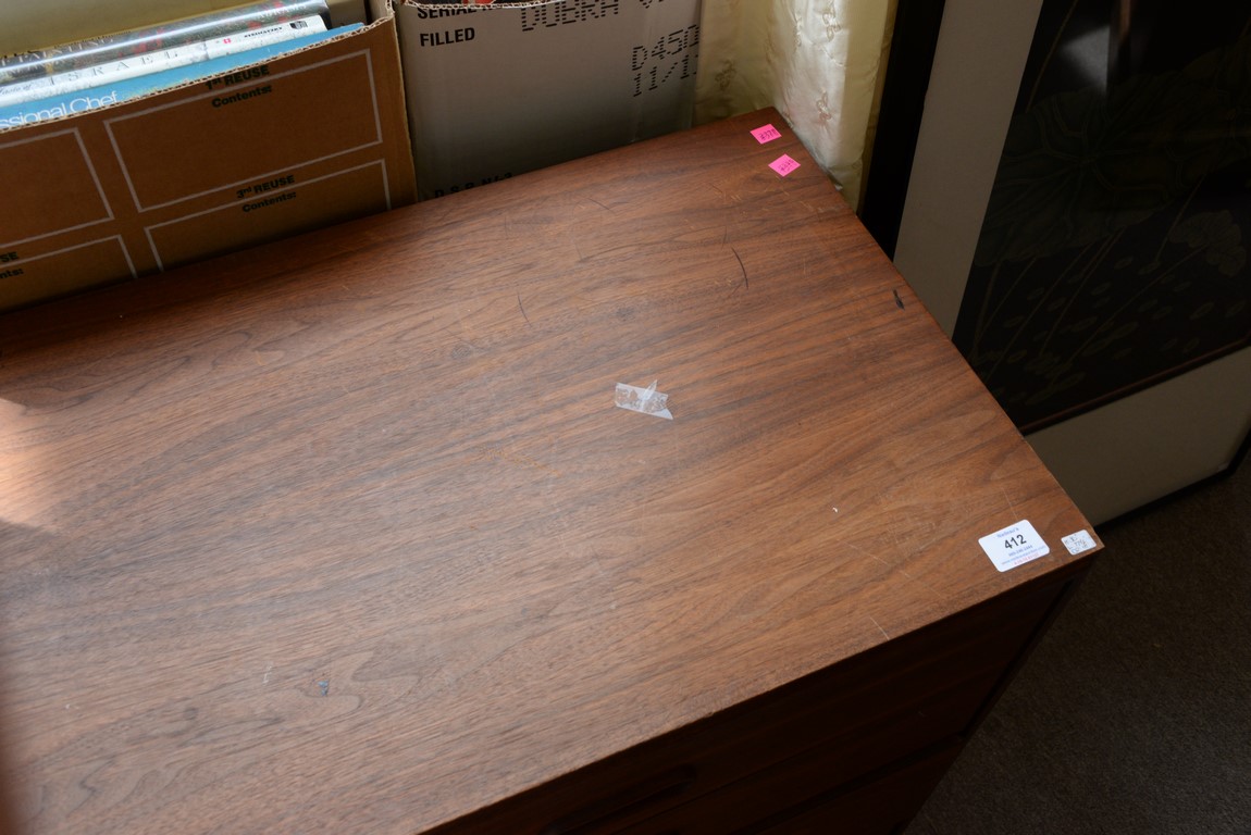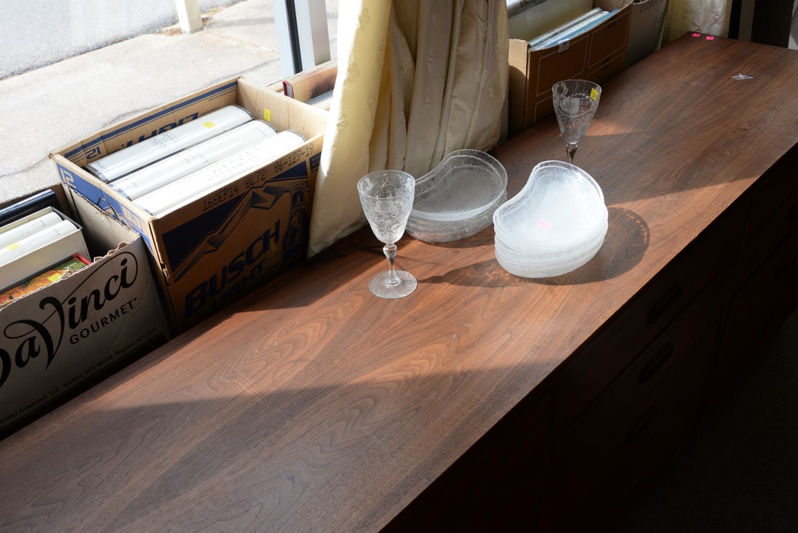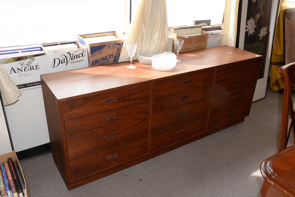 Lot 412: Twelve drawer walnut Mid-Century dresser with platform base, veneer. ht. 30 1/2 in. wd. 77 1/2 in. dp. 18 in.