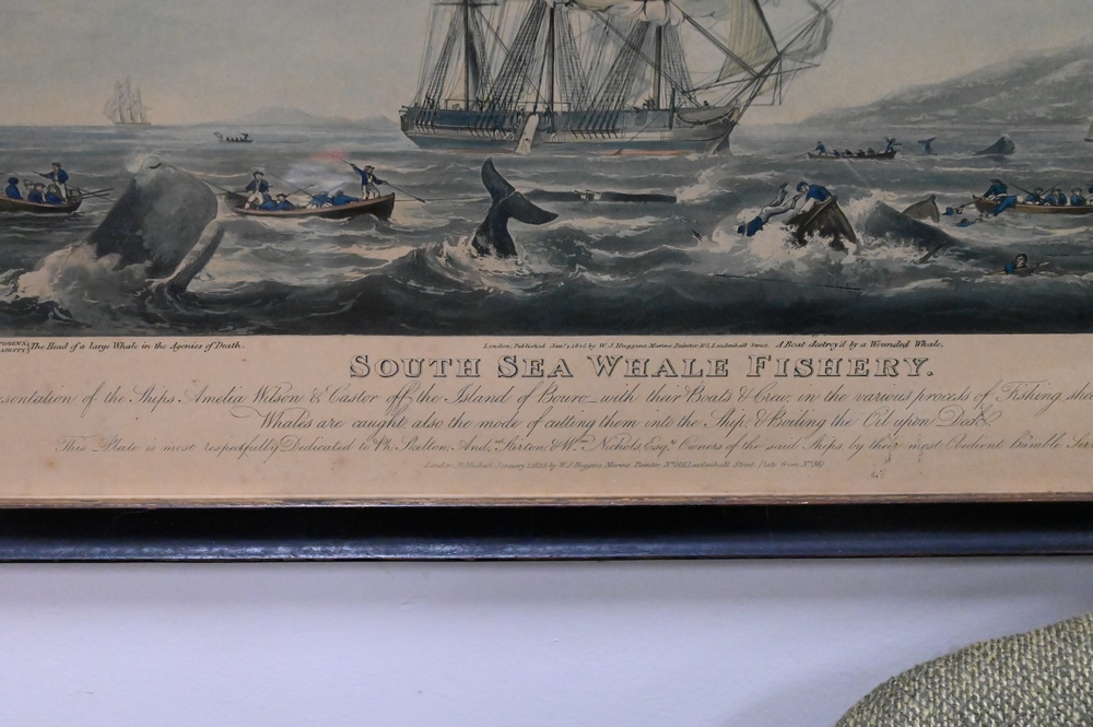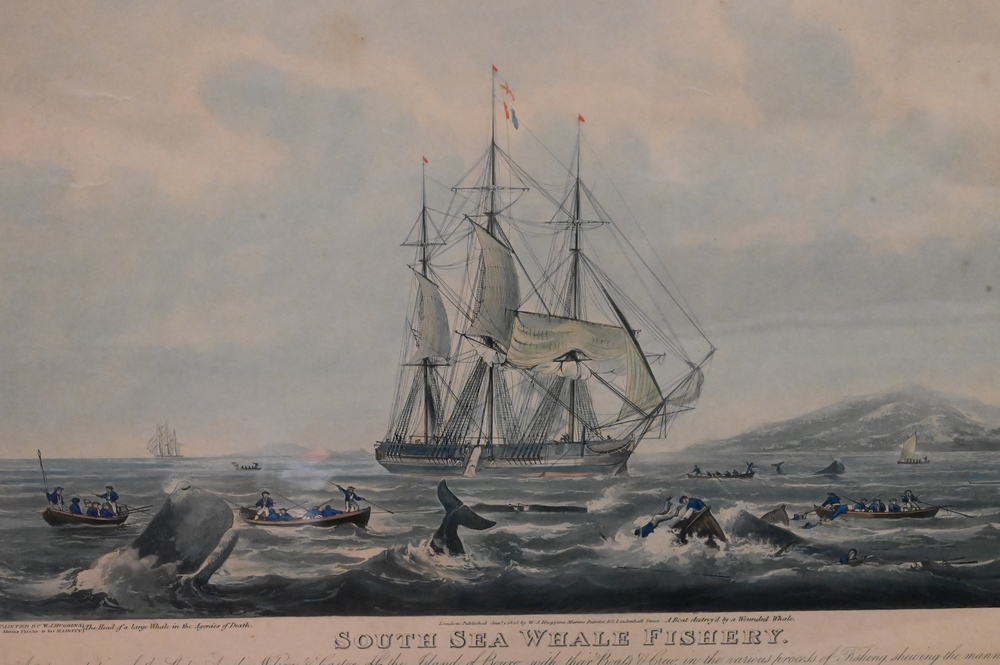Two 19th Century Nautical Hand Colored Engravings, to include “South Sea Whale Fishery” engraved by Tr. Sutherland, 17 1/2″ x 22 1/2″; along with “The Harbour of Port Cornwall’s” engraved by G. Hunt, 12″ x 16″.