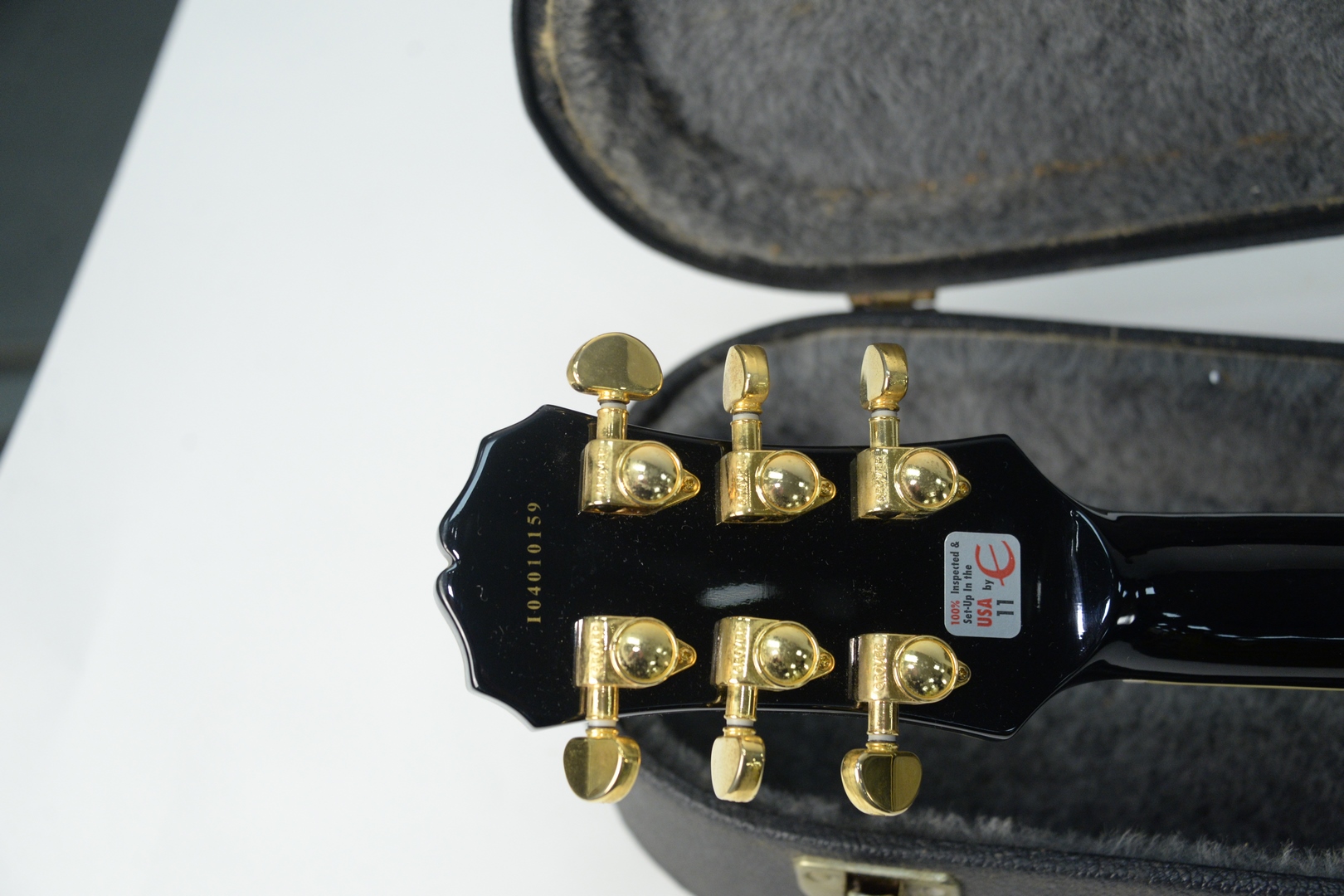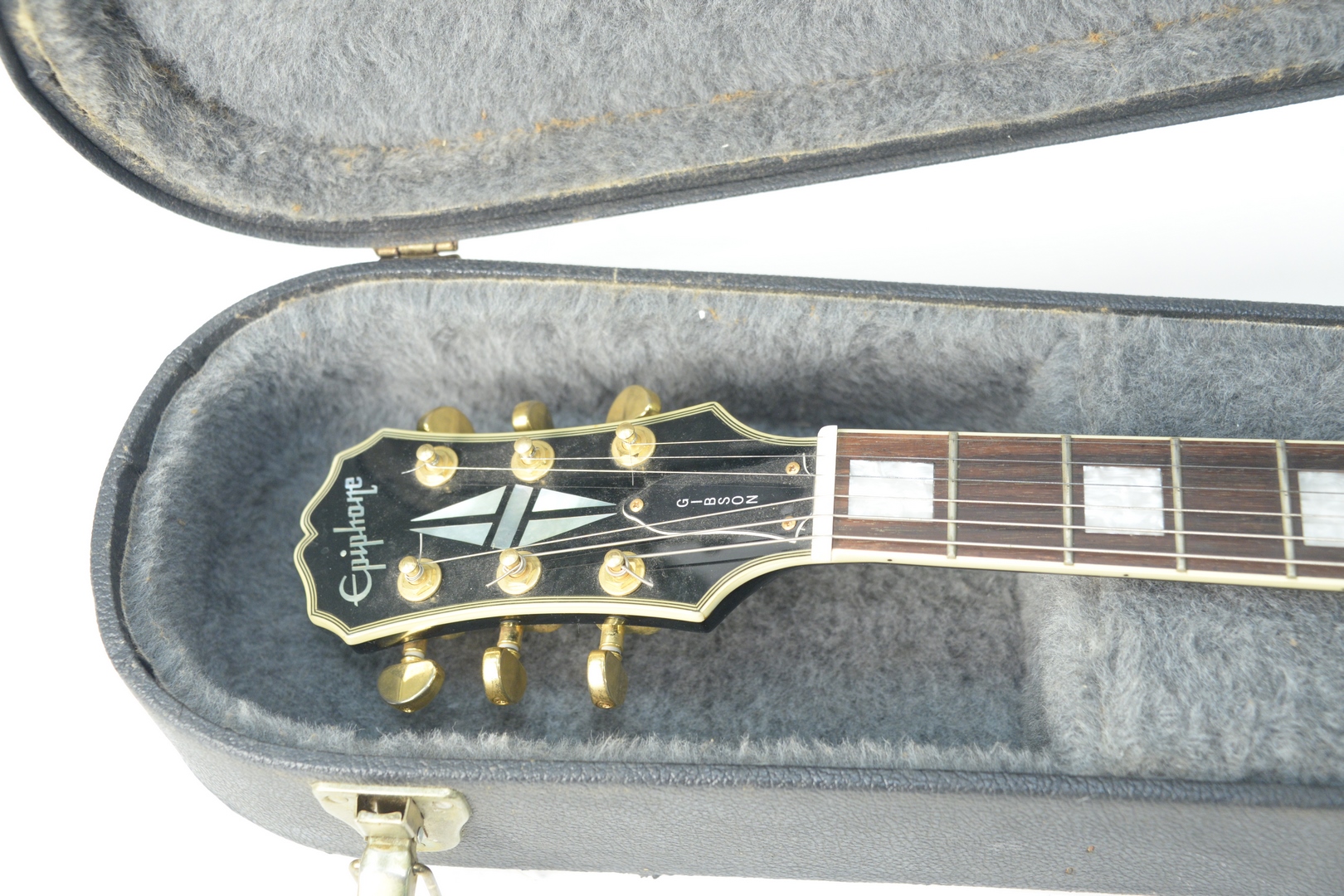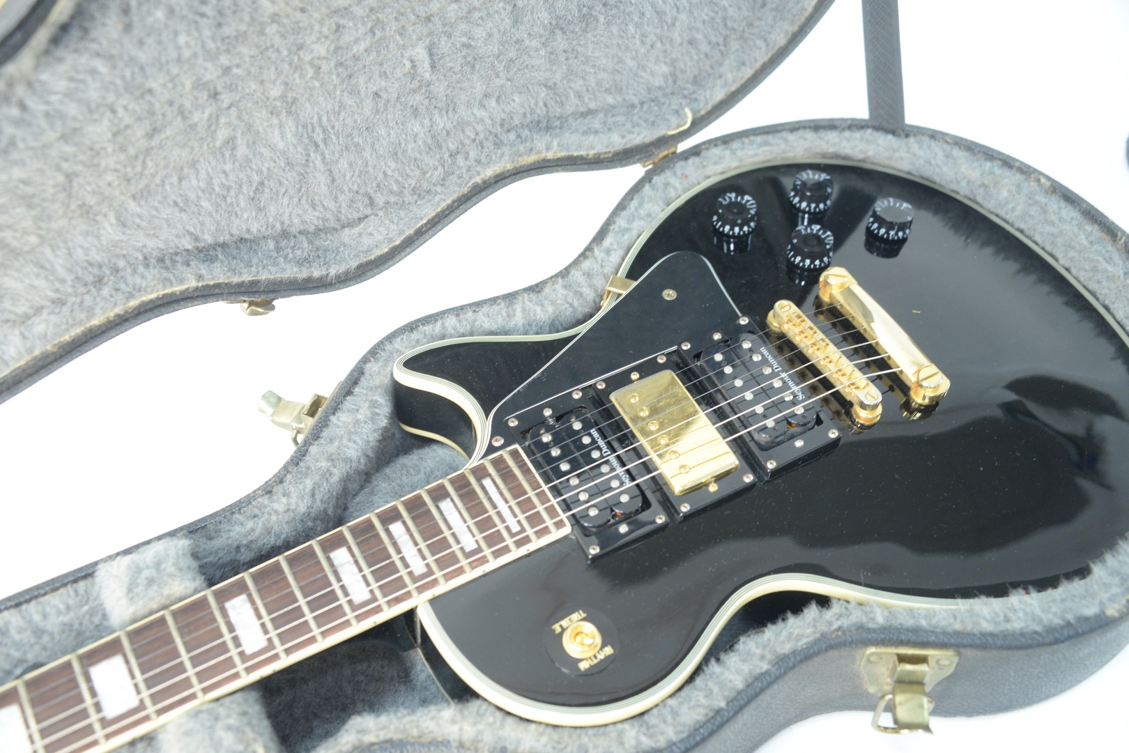 Lot 413: 2004 Epiphone Les Paul Guitar, serial # I1401059, three pick-up model, two Seymour Duncan bridge and neck, middle humbucker, with hard-shell case, length 30 1/2 inches.