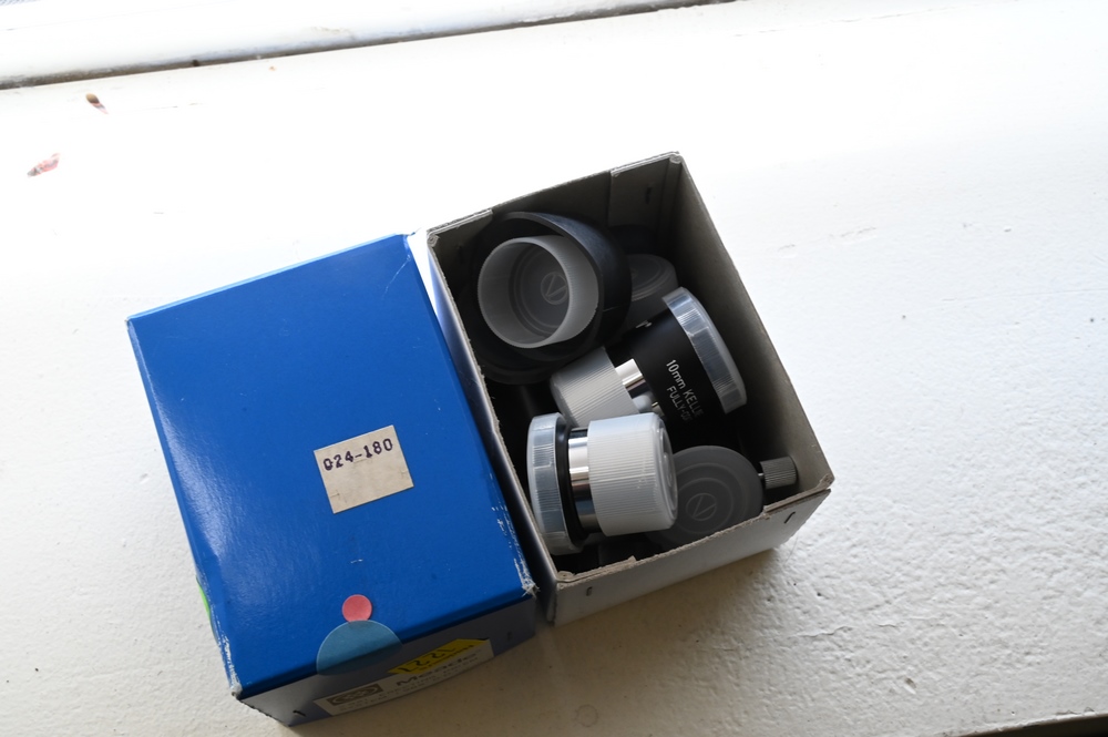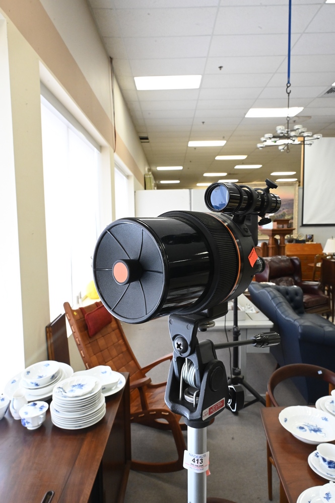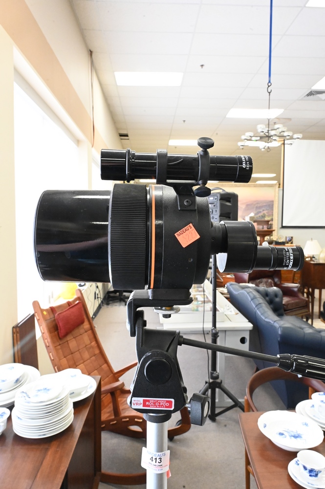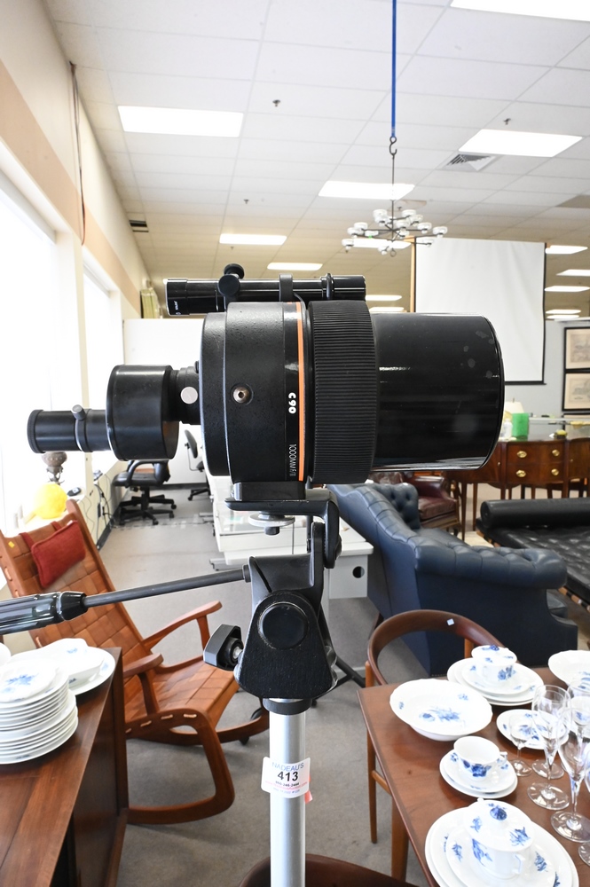 Lot 413: Celestron C90 Telescope, on adjustable tripod base, along with four eye pieces, hood, and instruction booklet.