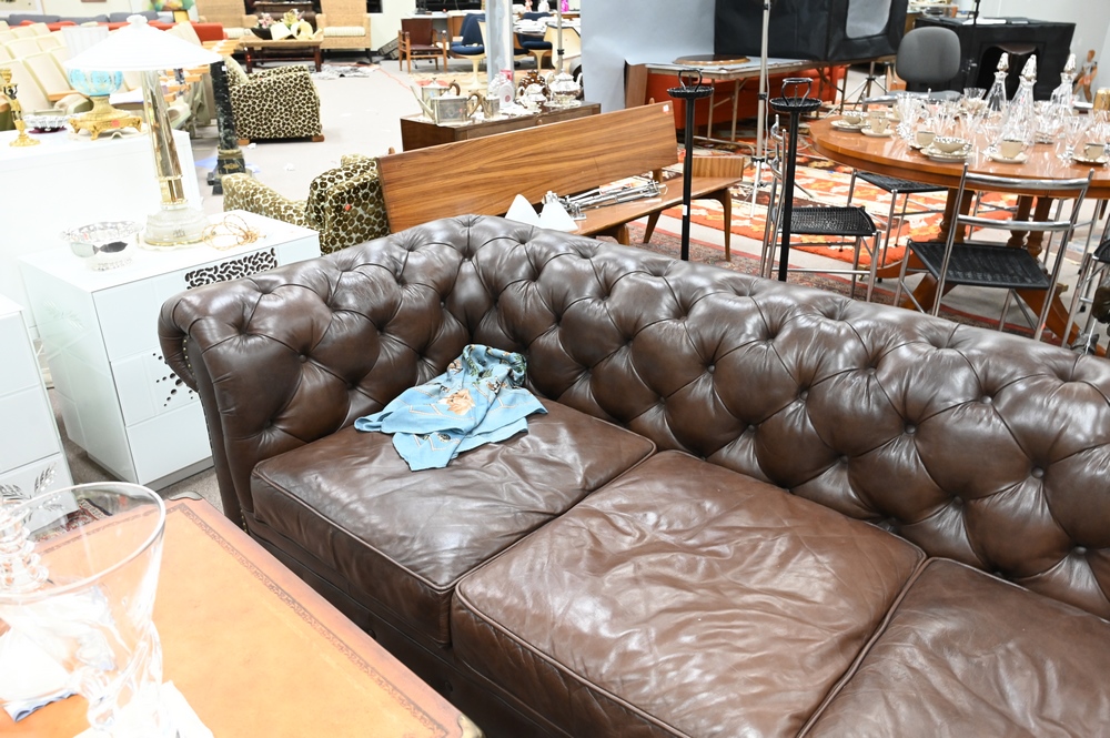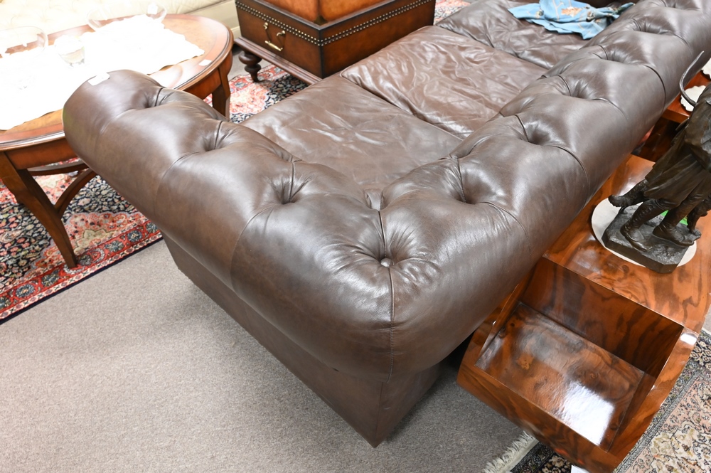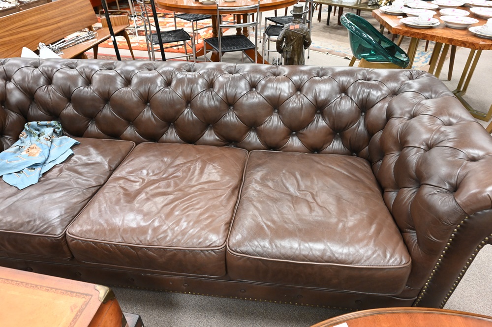 Lot 413: Chesterfield Style Brown Leather Sofa, height 29 1/2 inches, length 93 inches, depth 37 inches.