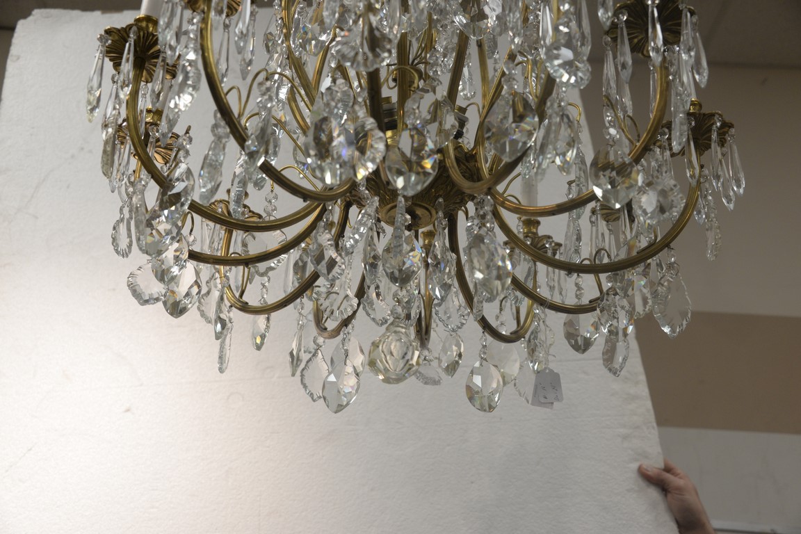 Lot 413: Crystal and brass chandelier having flat and faceted crystals with twelve outside lights and seven inside lights. ht. 36in., wd. 24in.