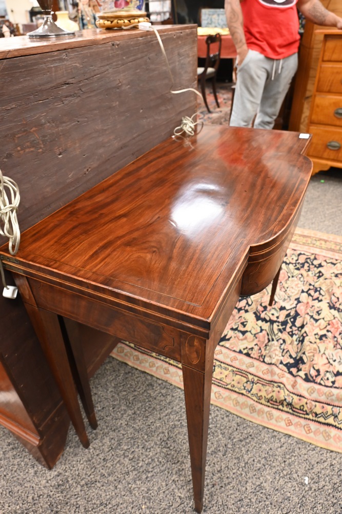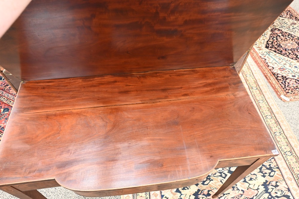 Lot 413: Federal Mahogany Game Table having panel inlays set on square tapered legs, impressed signature CLAY circa 1800 restored height 30 inches, width 36 inches, top 17 3/4 x 18 inches