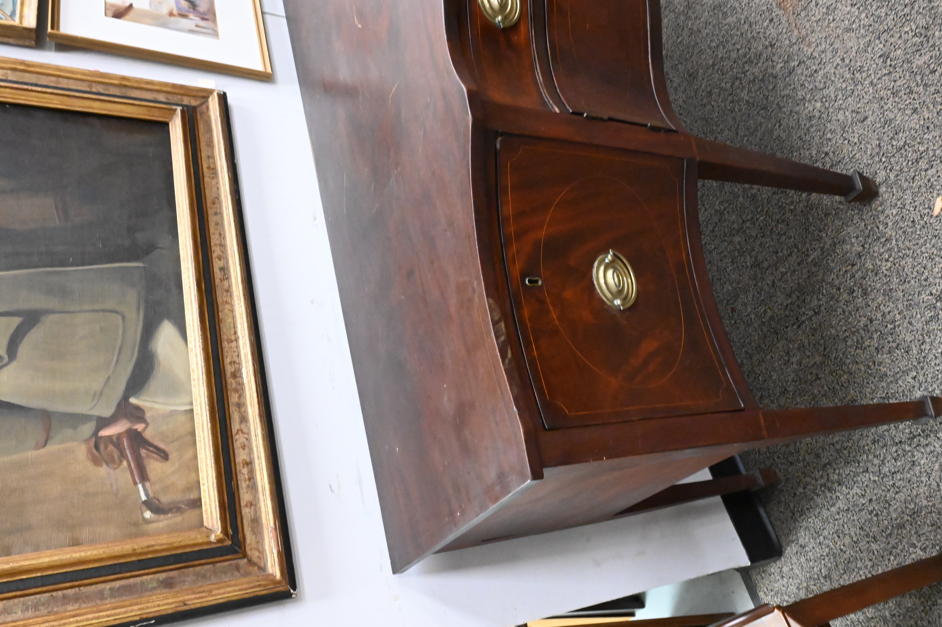 having shaped front on square tapered legs ending in spade feet, all with line inlays, repaired back leg, American circa 1800