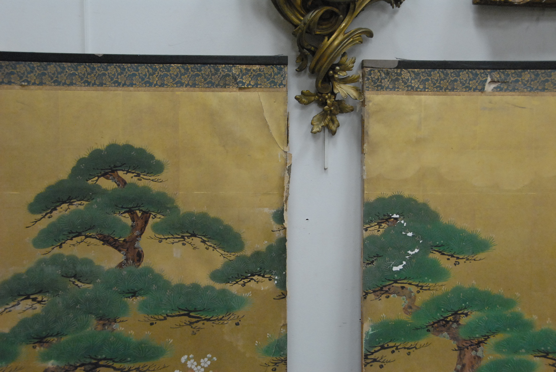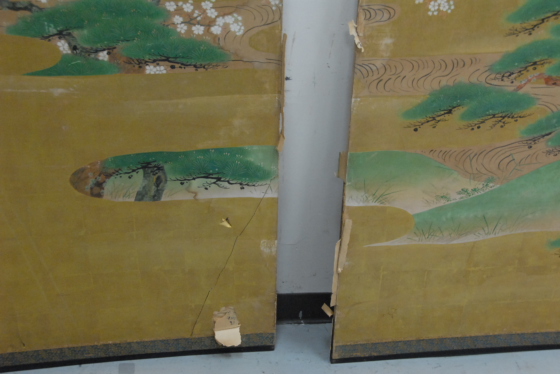 Japanese screen two fold landscape with trees separated and some damage 69 x 74