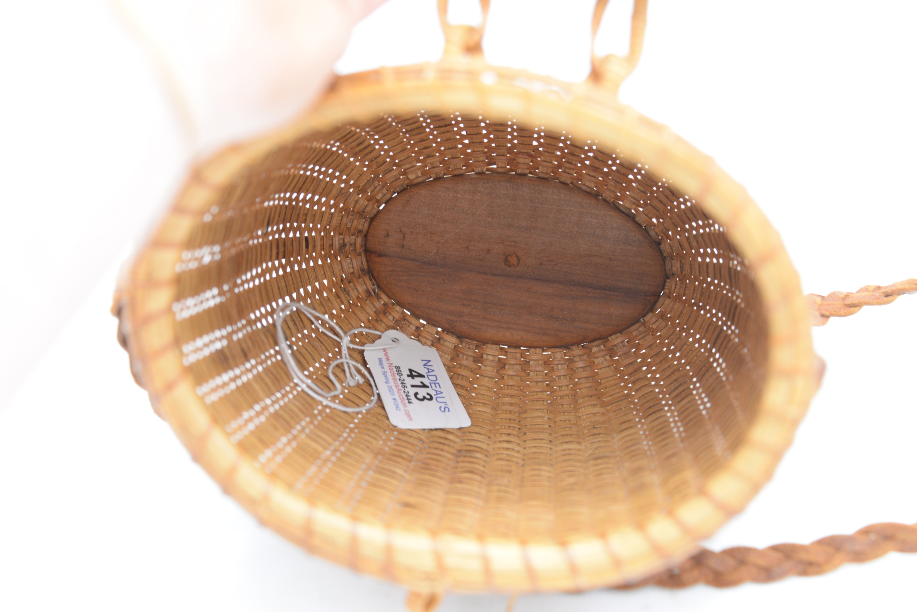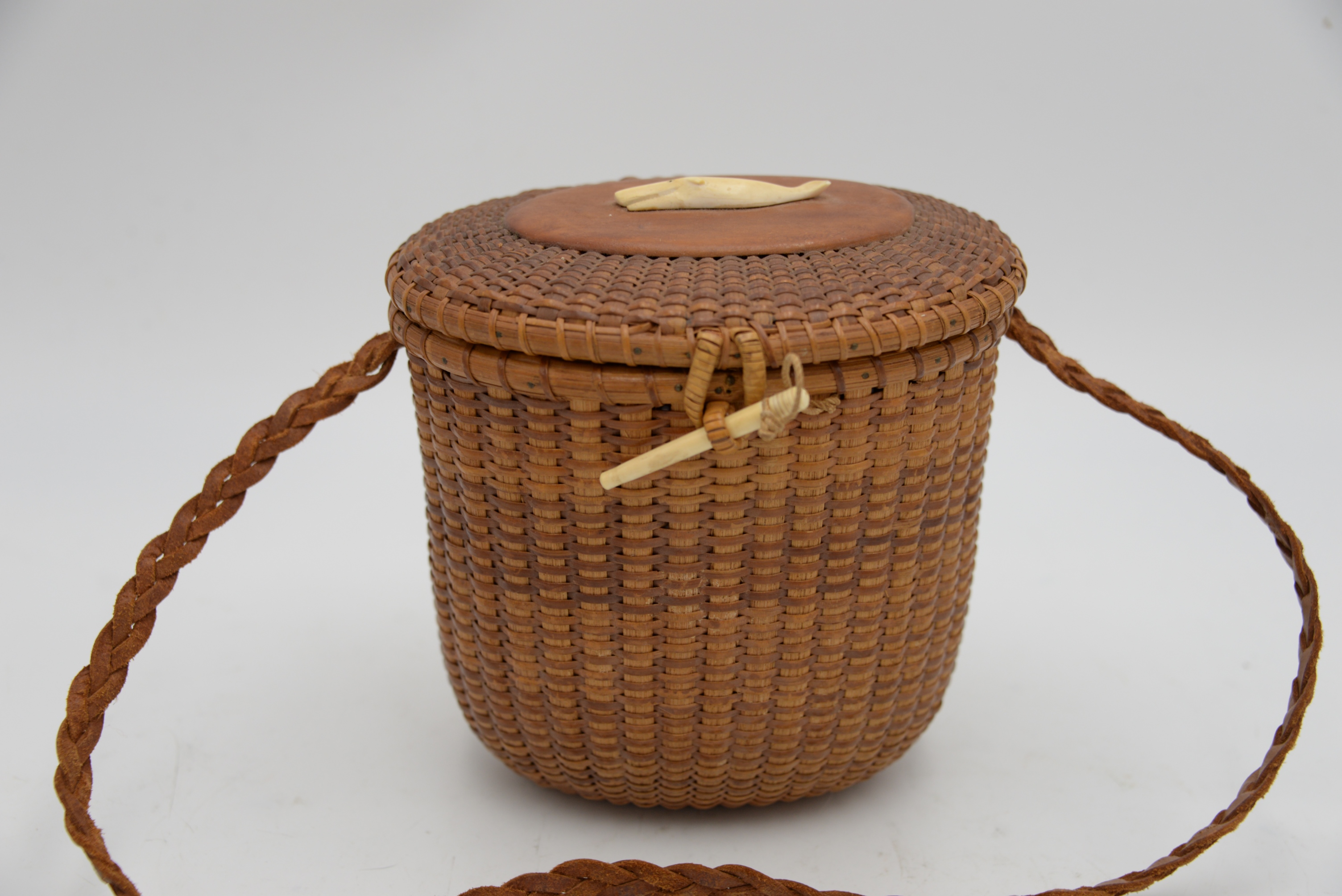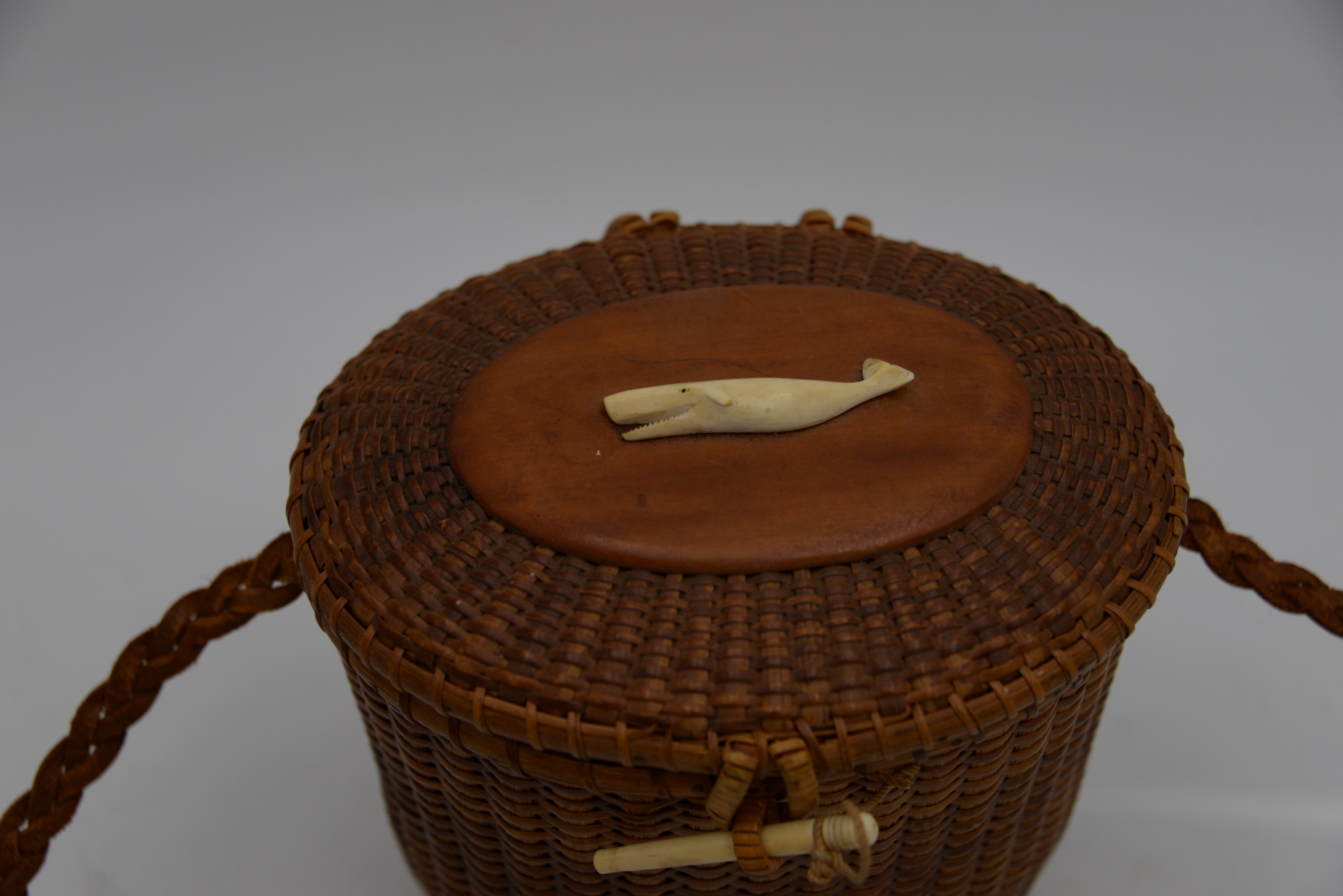 Jose Reyes Nantucket Friendship Basket/Purse, having carved whale on top, along with braided leather shoulder strap, signed and marked on bottom “Made in Nantucket, Jose Formoso Reyes”, height 7 inches.