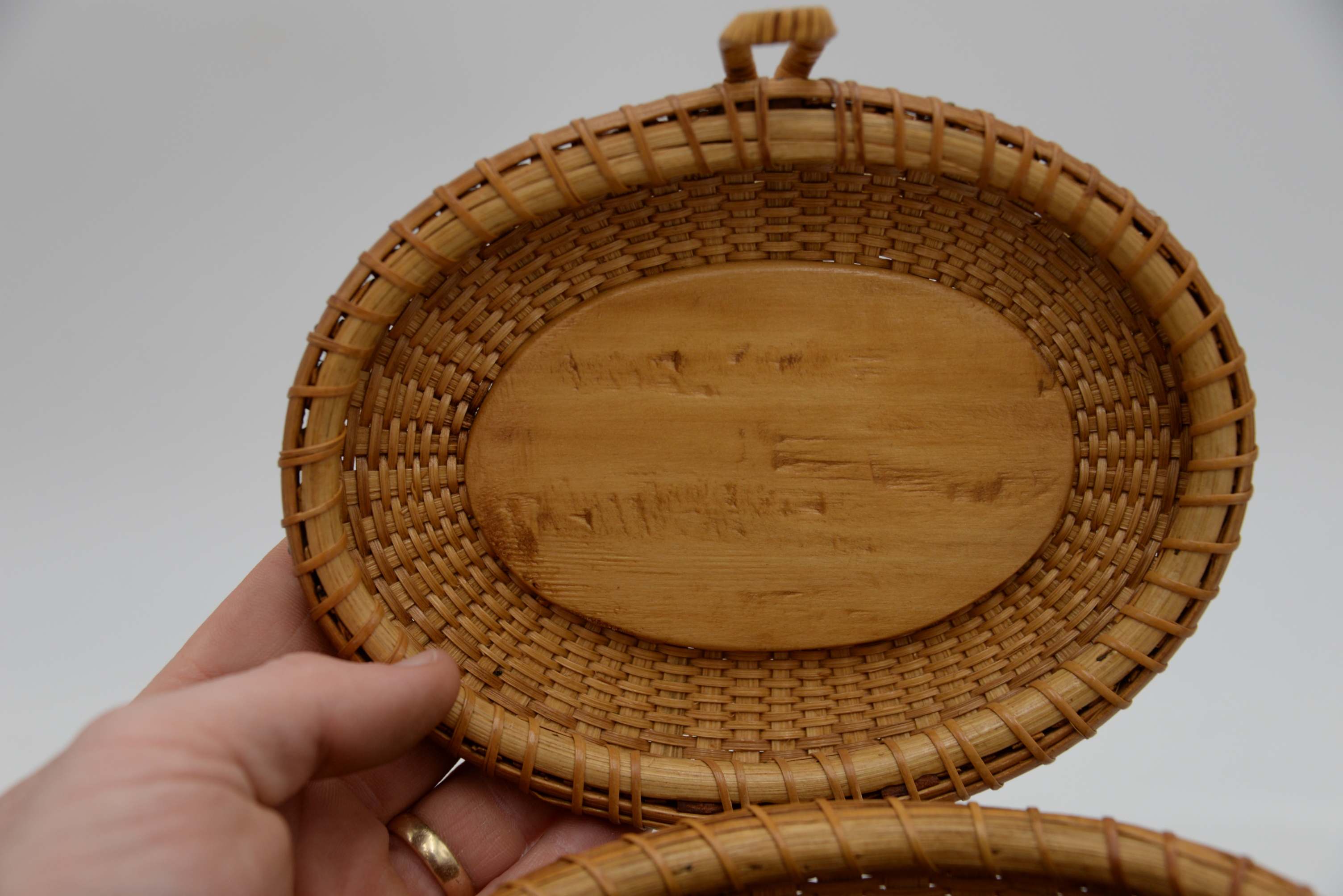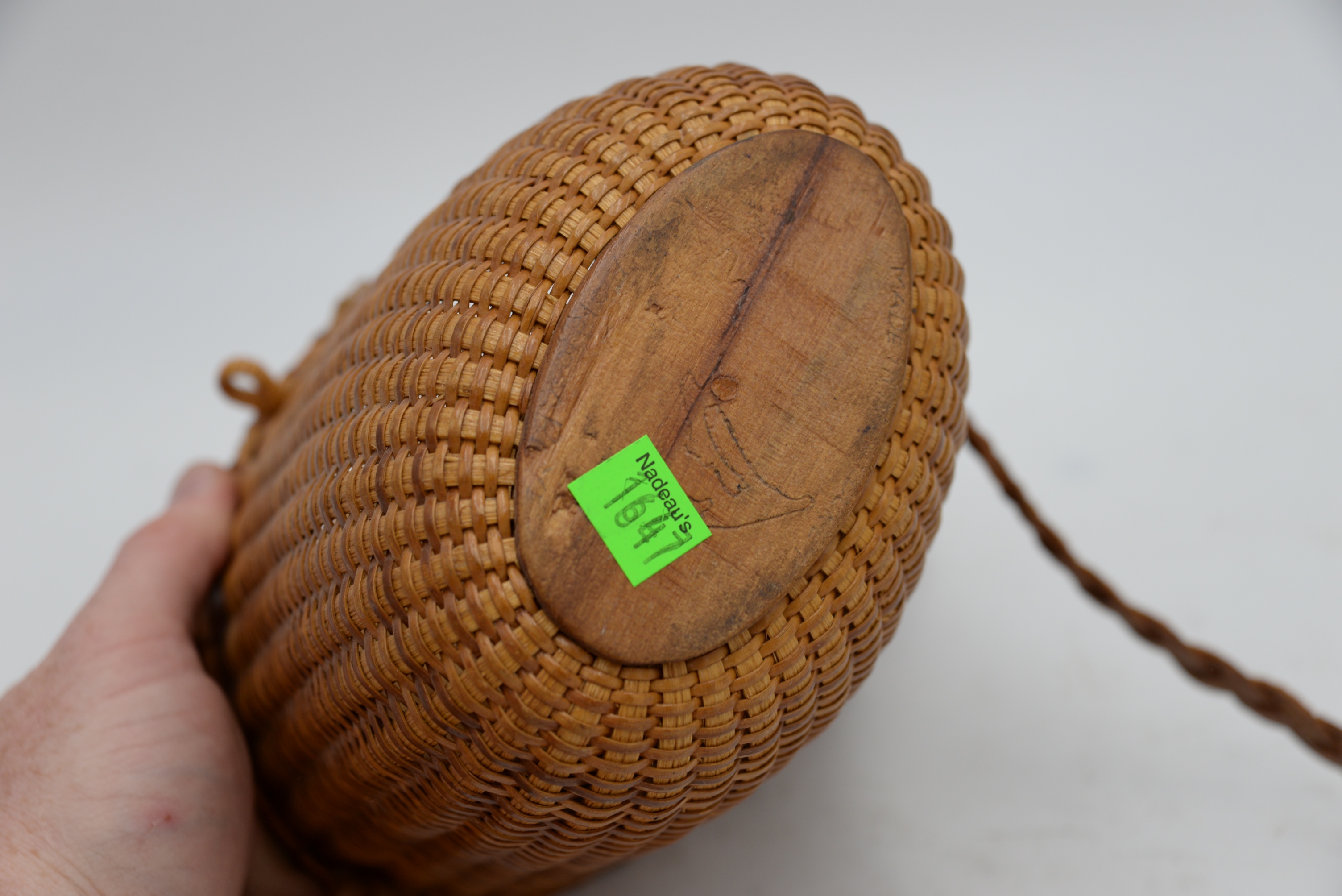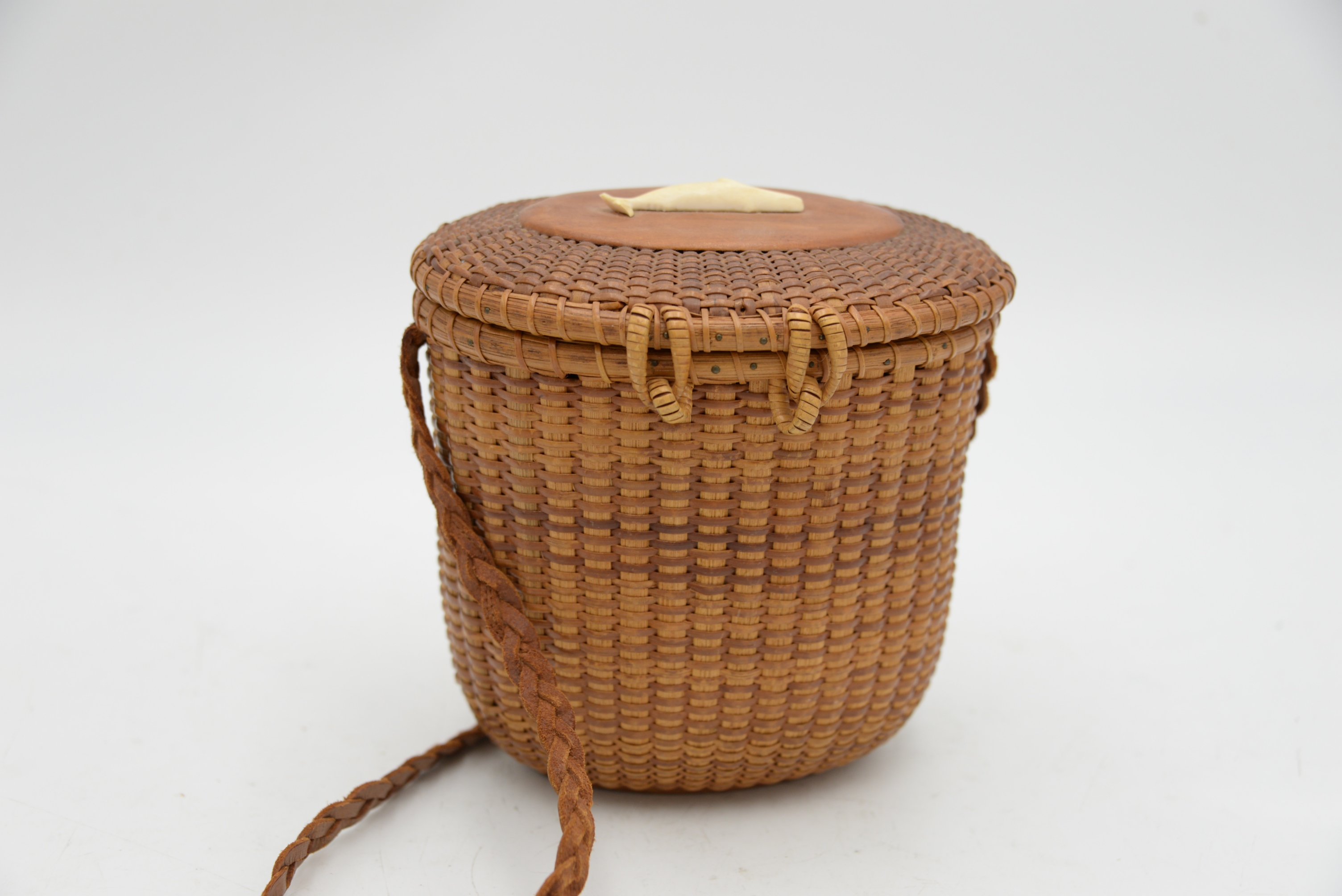 Jose Reyes Nantucket Friendship Basket/Purse, having carved whale on top, along with braided leather shoulder strap, signed and marked on bottom “Made in Nantucket, Jose Formoso Reyes”, height 7 inches.