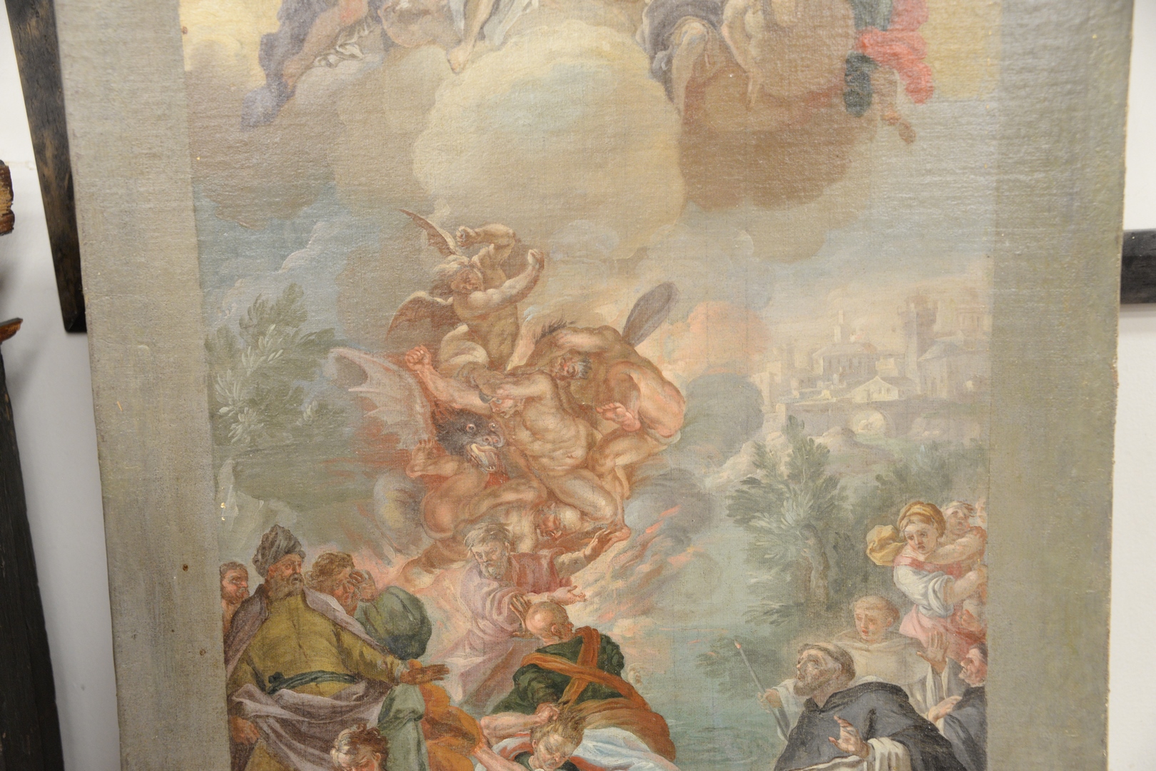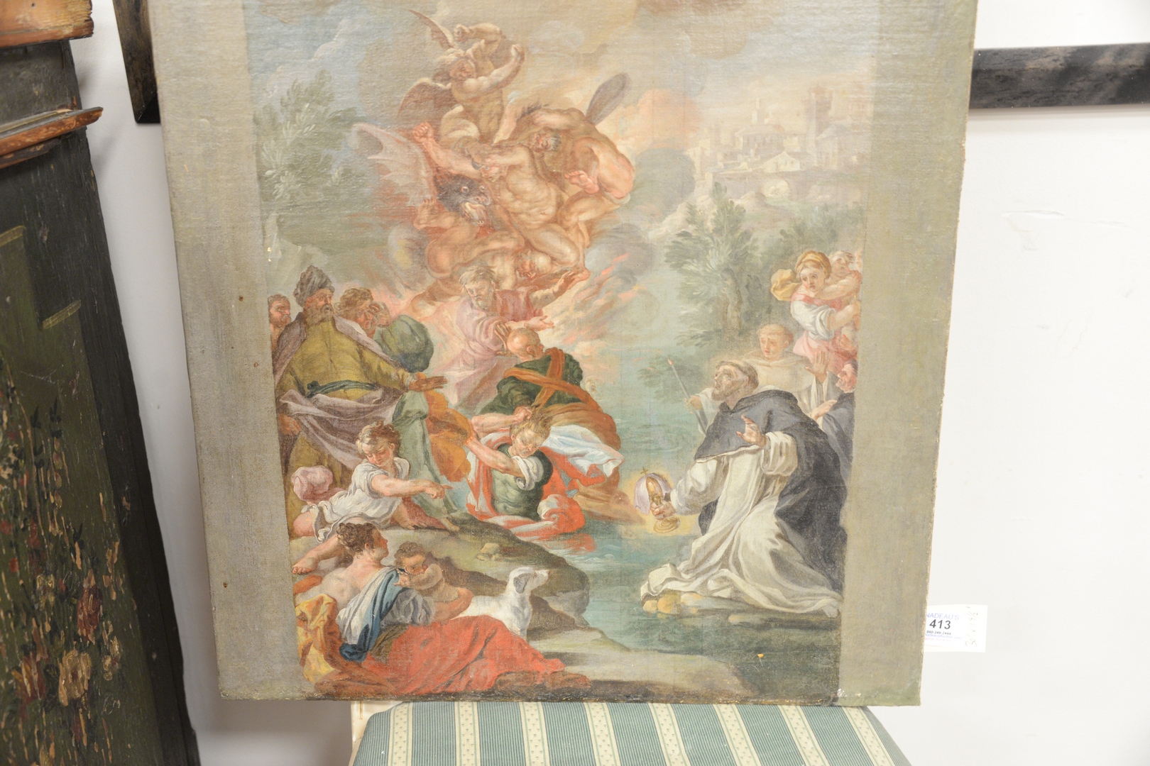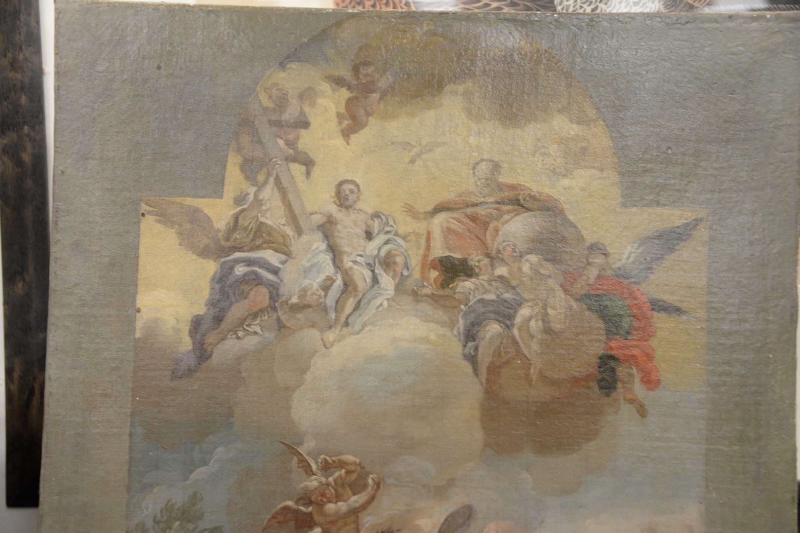 Lot 413: Modello Transfer Sketch with Gridding, oil on canvas, possibly Apotheosis St. Ignatius, Saint Nicholas Rescuing Adeodatus, old master with painted arch top, unsigned, possibly Francesco de Mura 1696 – 1782 or Daniel Gran 1694 – 1757, relined. 30