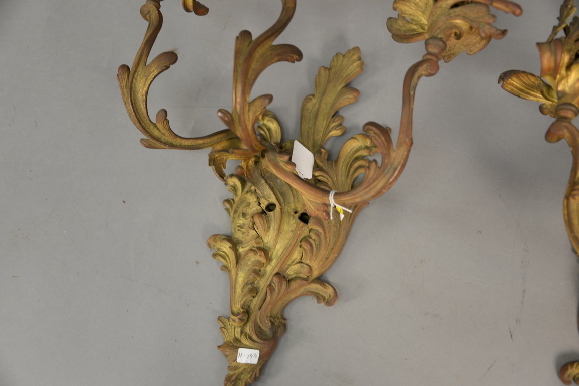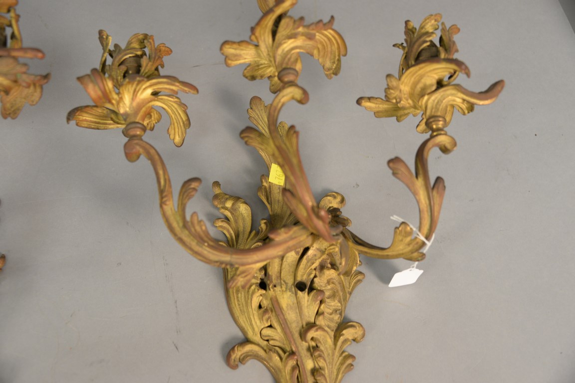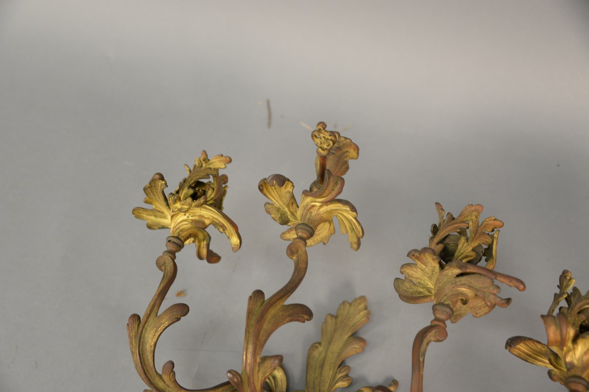 Lot 413: Pair of French bronze three light sconces, previous wax fixtures, partial gilt remaining, ht. 19 1/2 in.