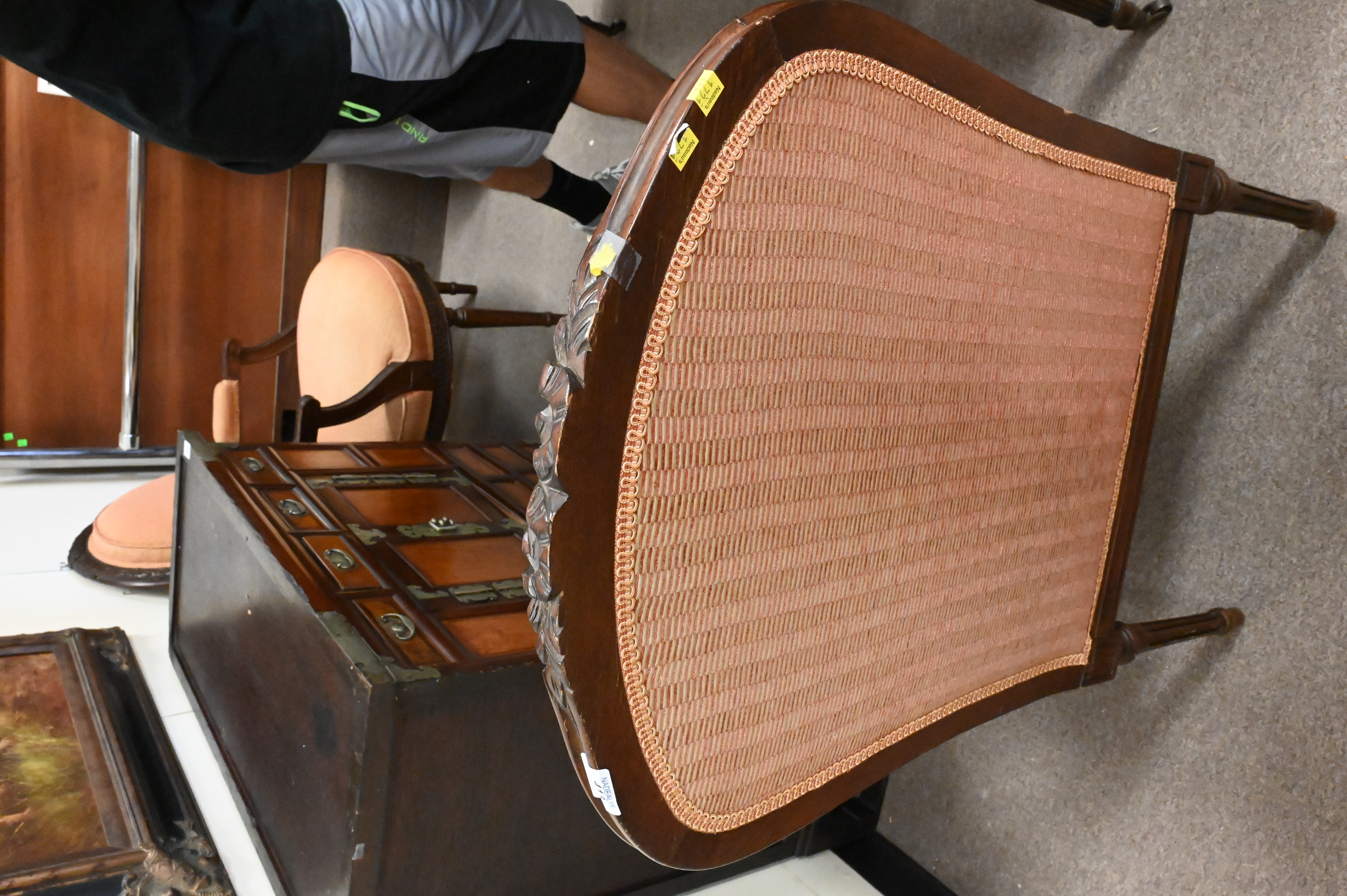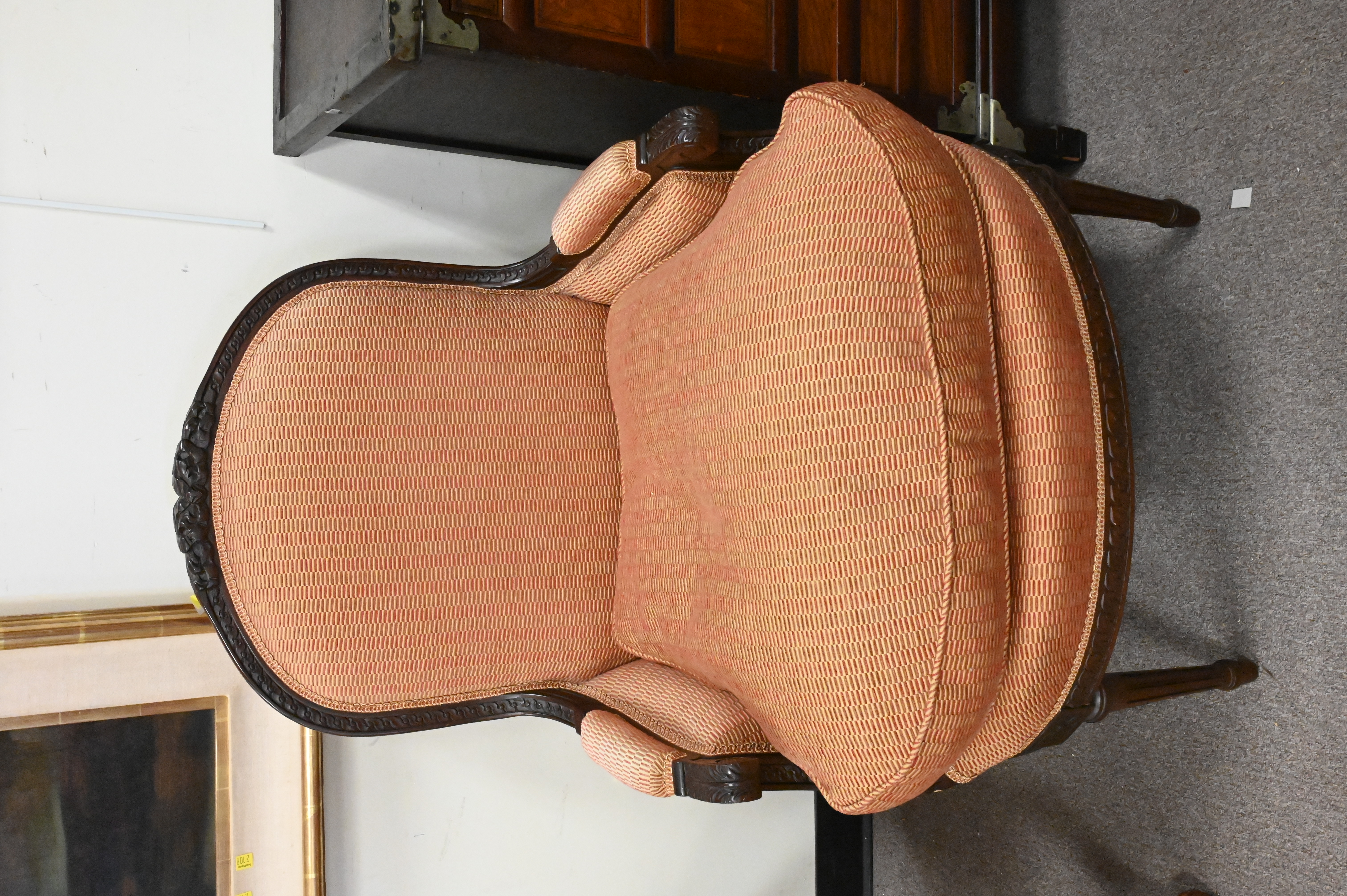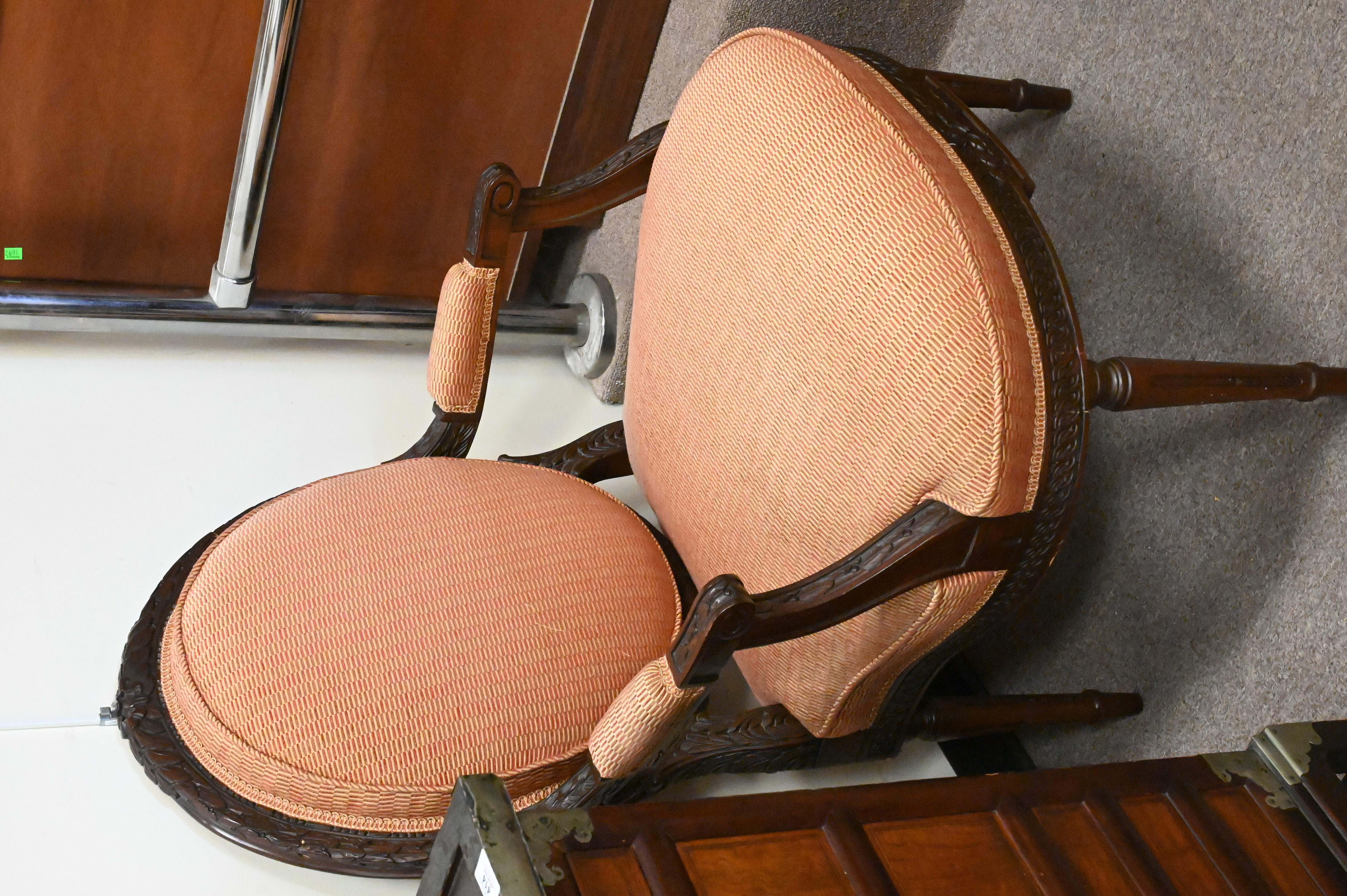 Pair of Louis XVI Style Armchairs Ladies and Gentleman’s, with custom Tiger Lily’s Upholstery, height 41 inches, width 28 inches.