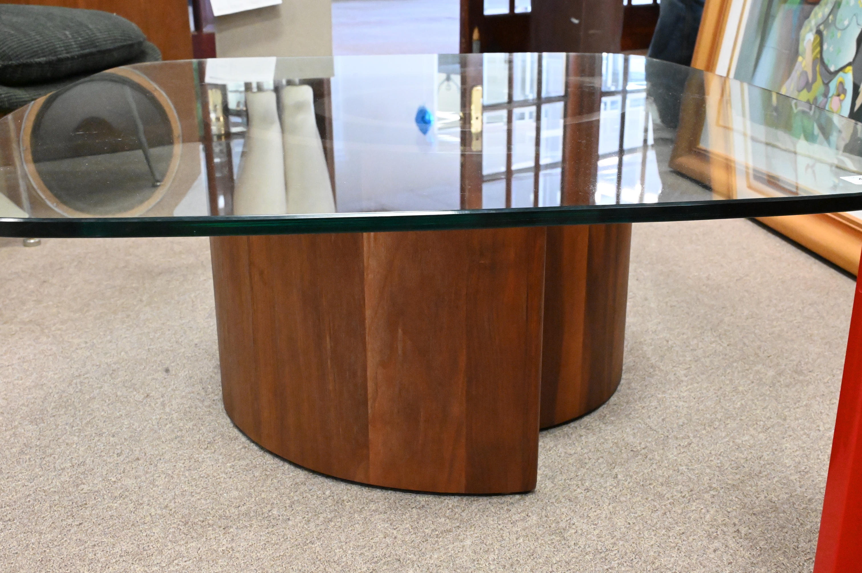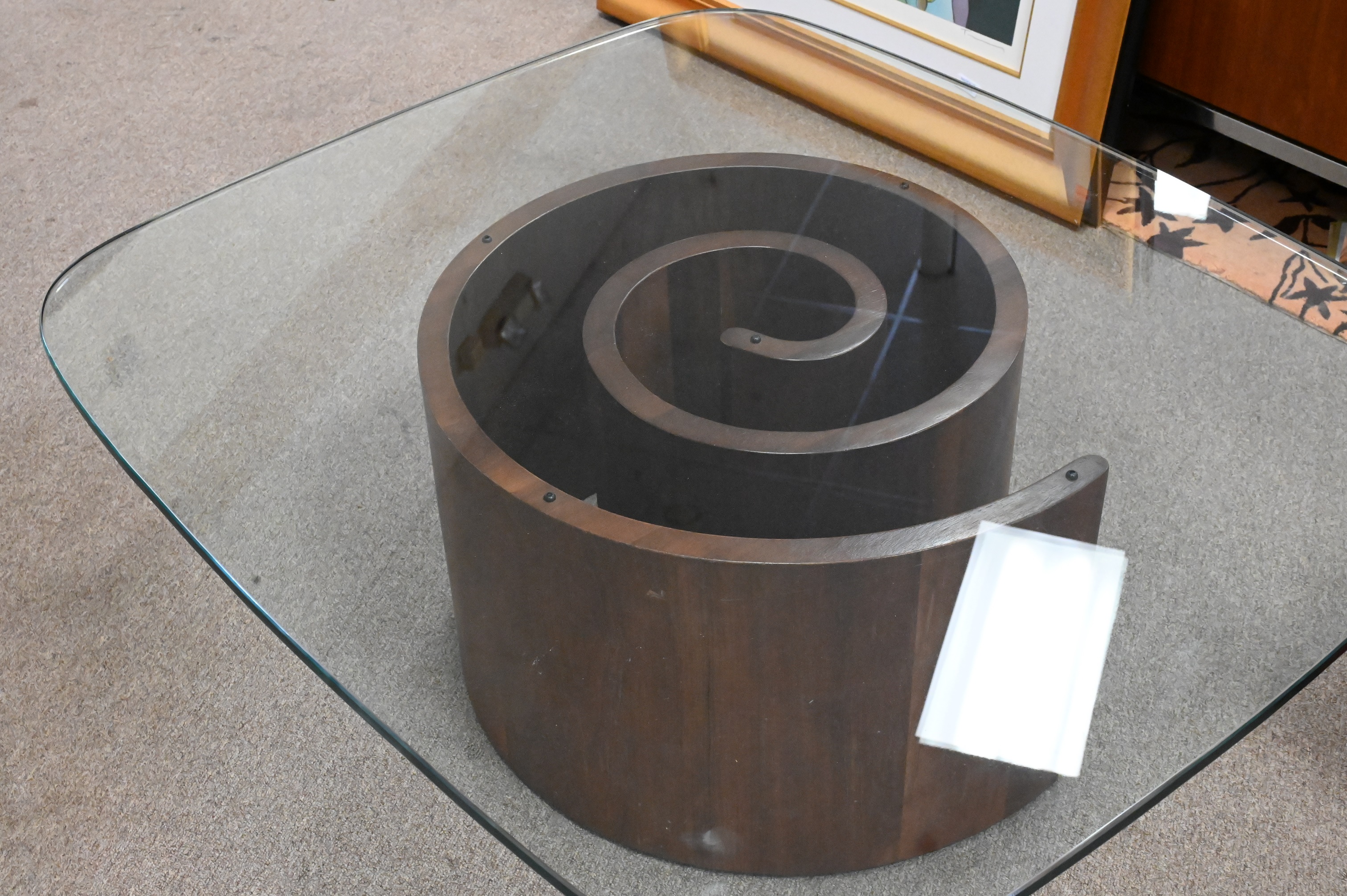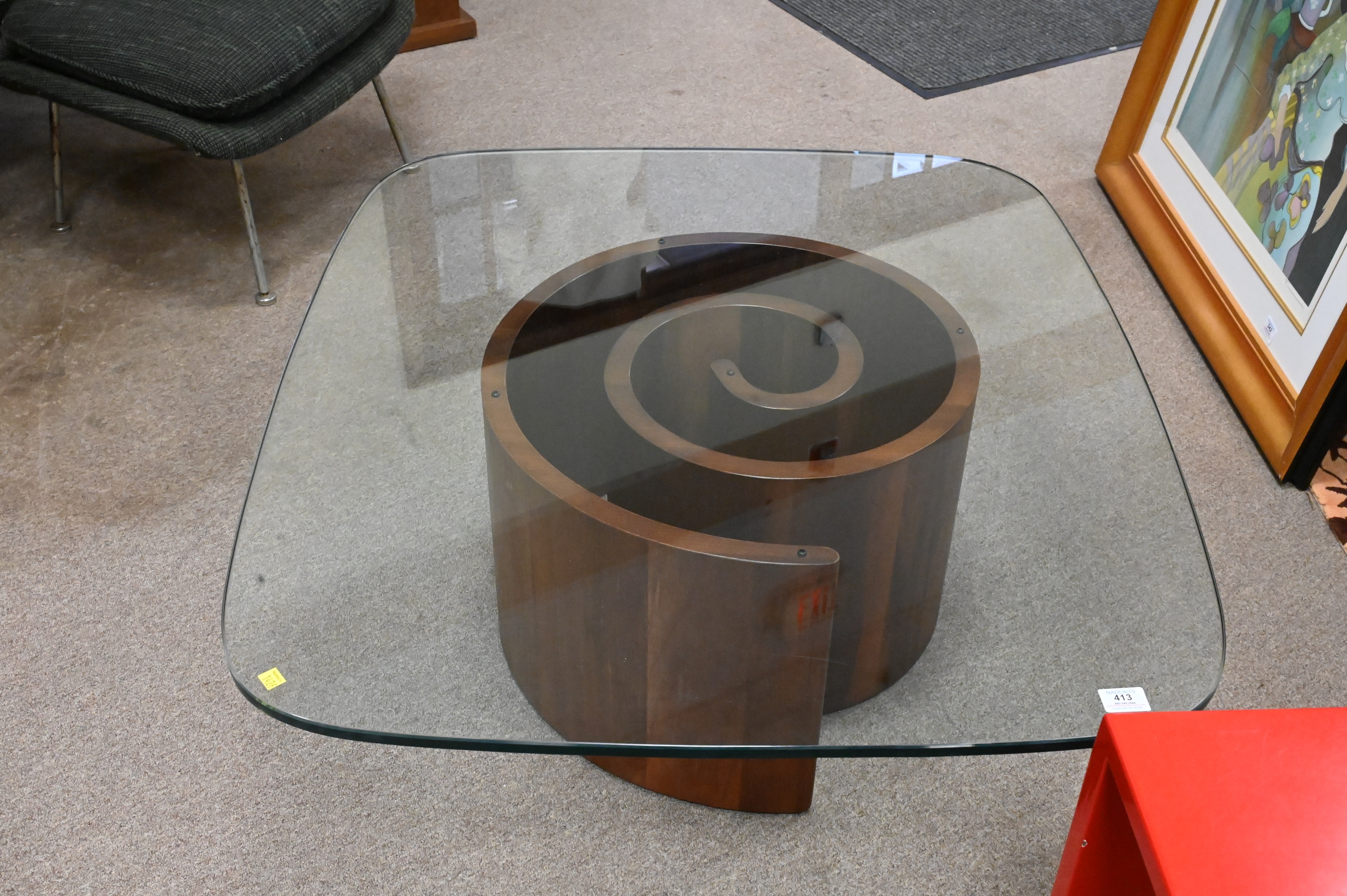 Vladimir Kagan Snail Coffee Table, having walnut base, height 15 inches, top 36 3/4″ x 41 3/4″.