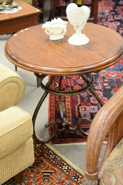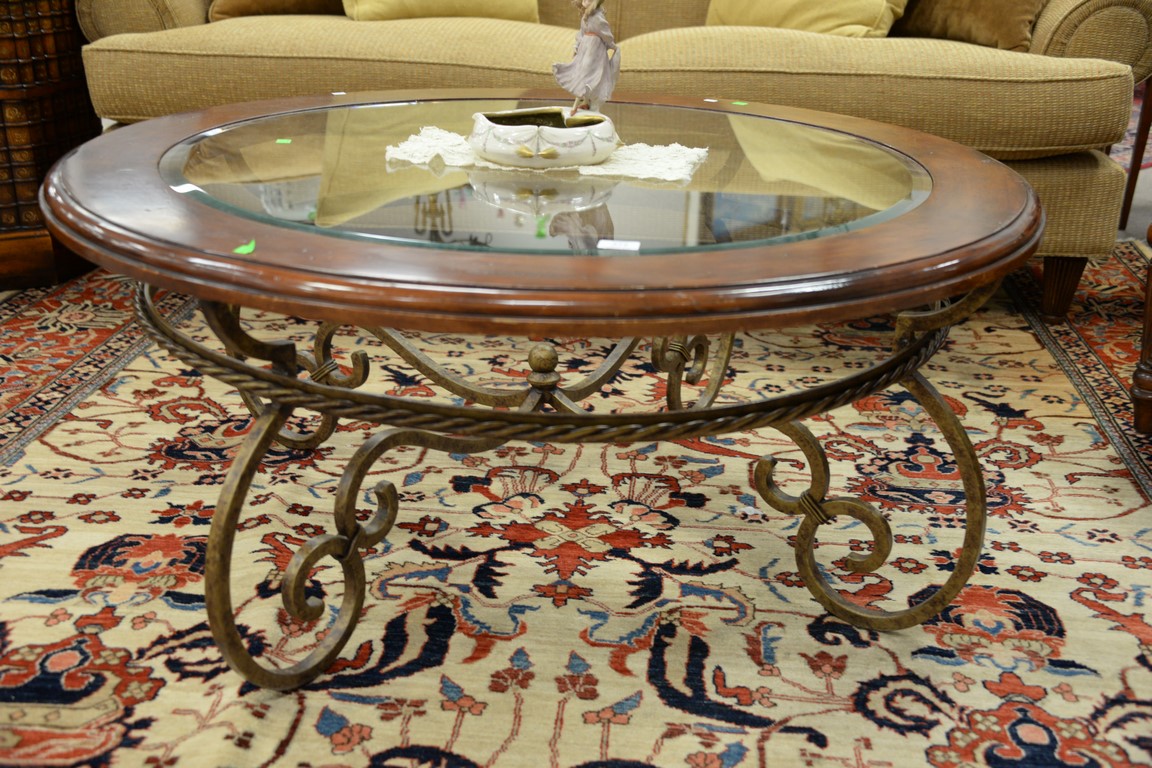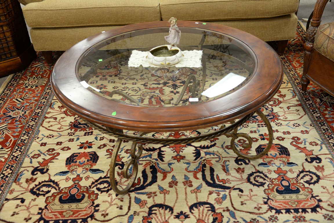 Circular glass top coffee table on iron base. ht. 22in., dia. 45in.
