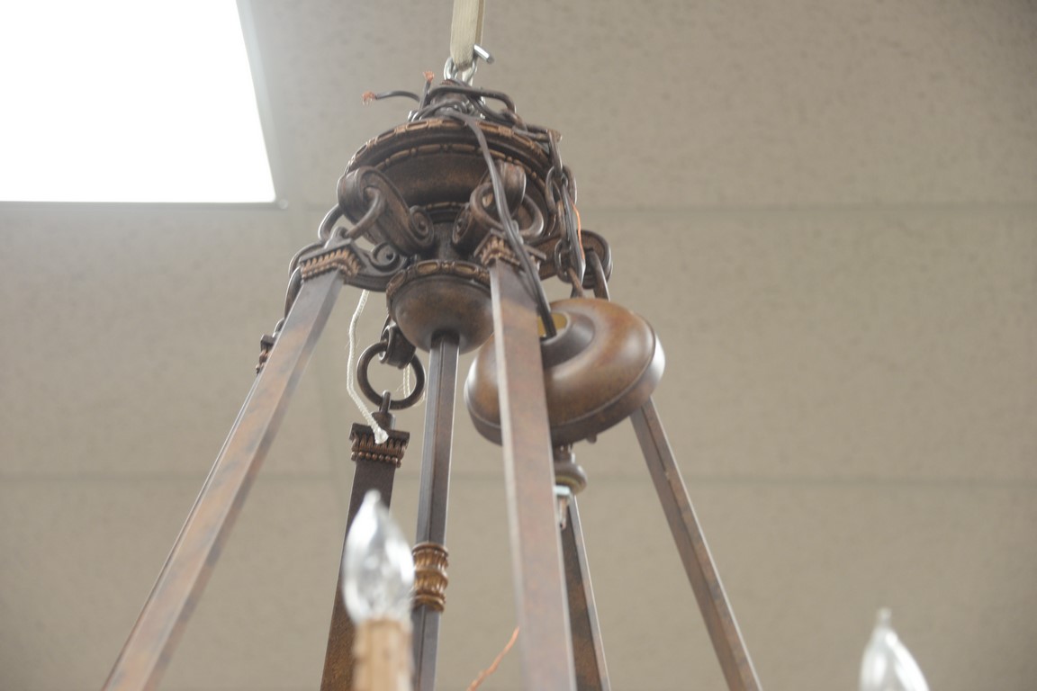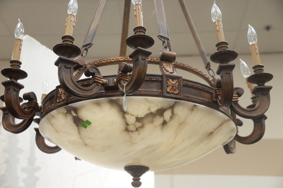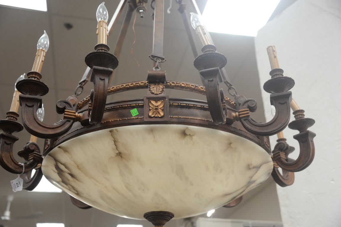 Lot 414: Contemporary bronzed color metal and alabaster hanging light, twelve lights. ht. 42in., dia. 36in.