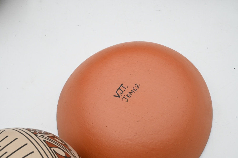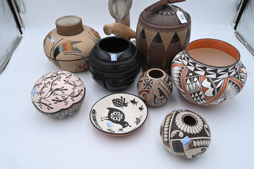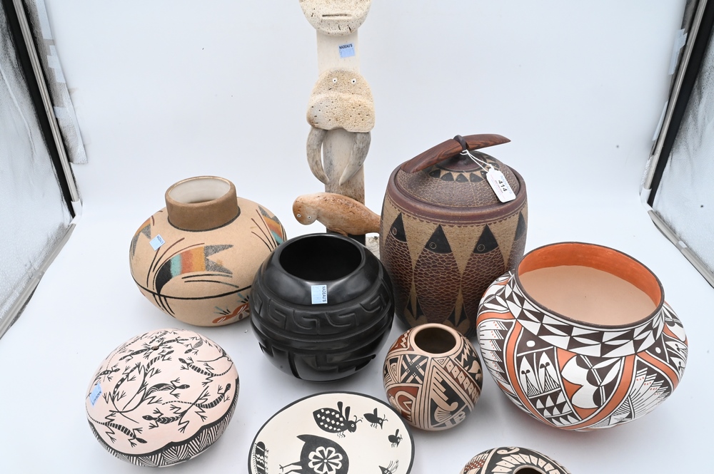 Lot 414: Group of Southwest Items, to include pottery vases, Ron Ekemo whale bone totem pole, Rose Lewis Santa Clara black pottery vase marke…