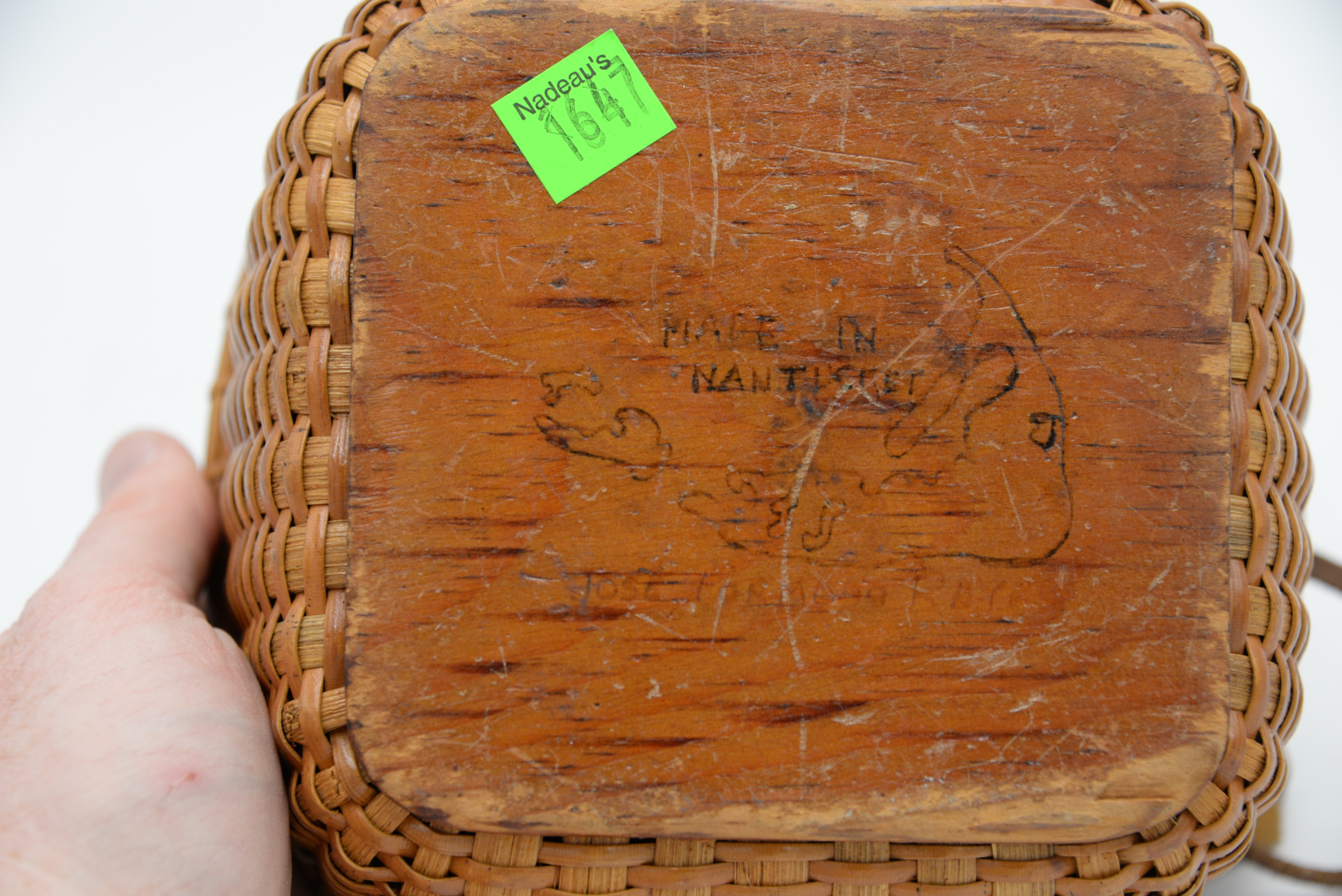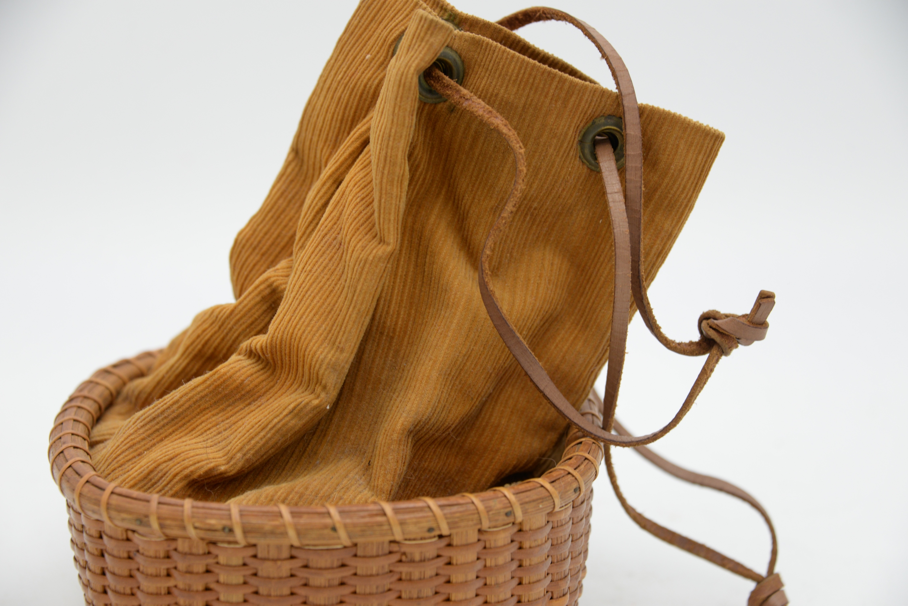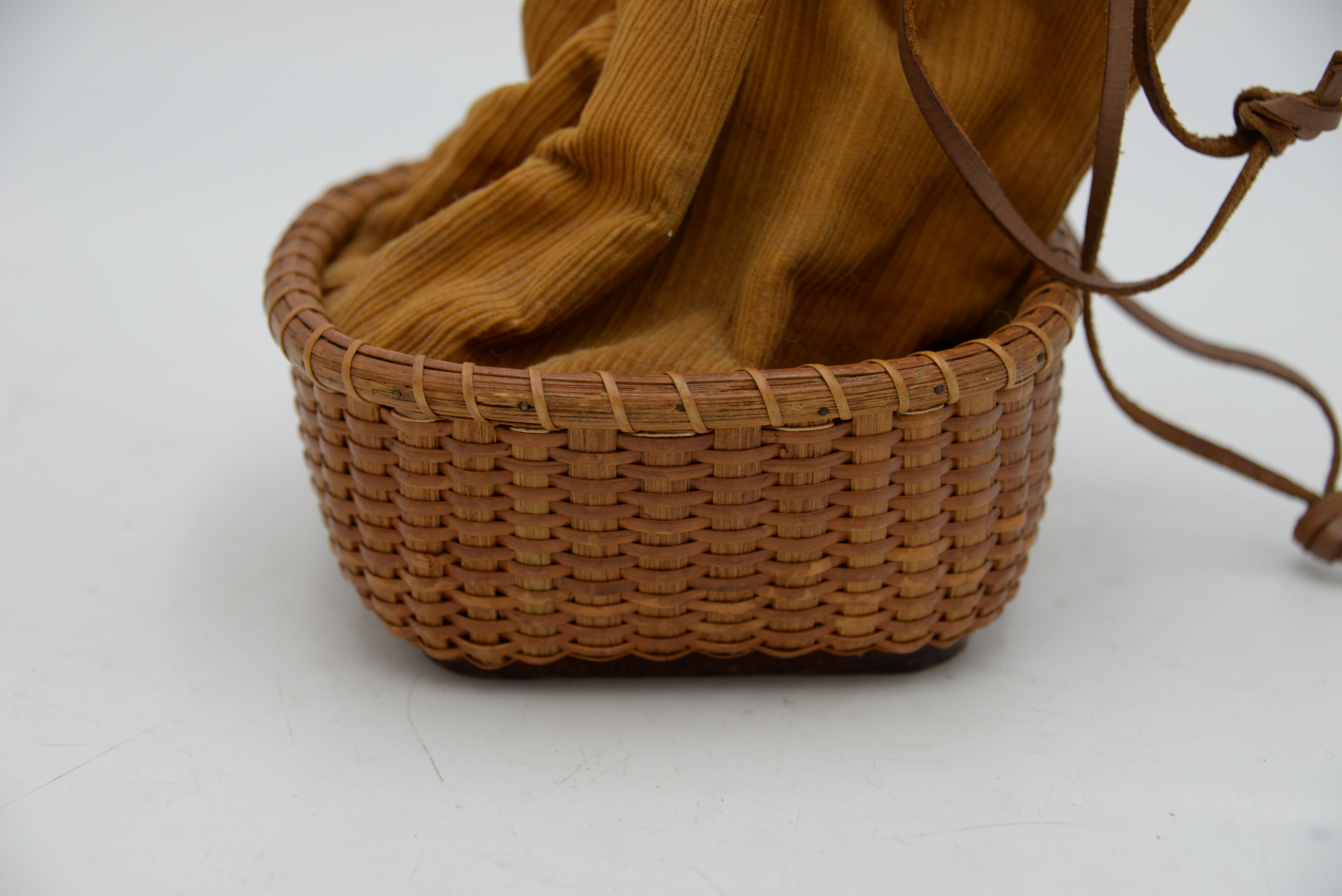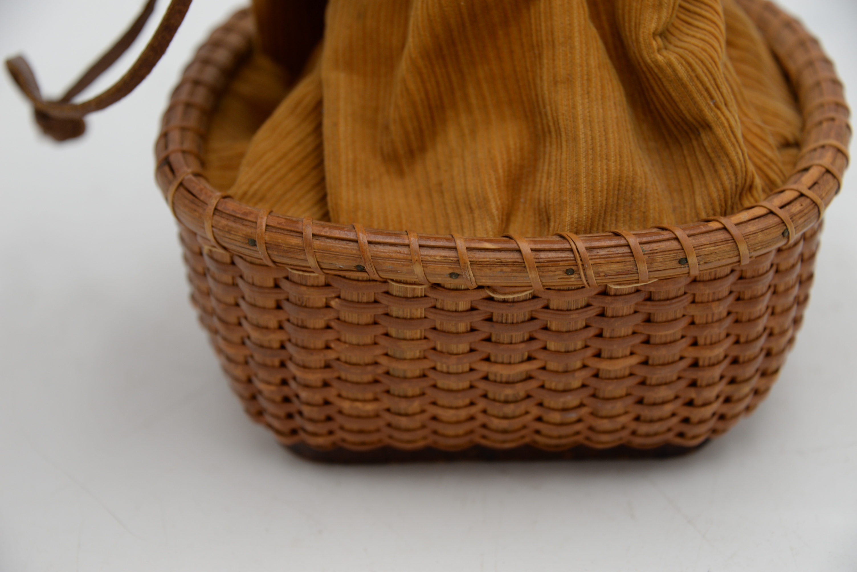 Jose Reyes Nantucket Basket/Purse, square with brown corduroy liner and leather drawstring, signed and marked on bottom “Made in Nantucket, Jose Formoso Reyes”, height 8 1/2 inches, diameter 7 inches.