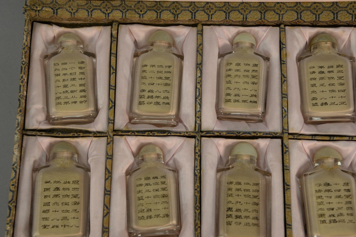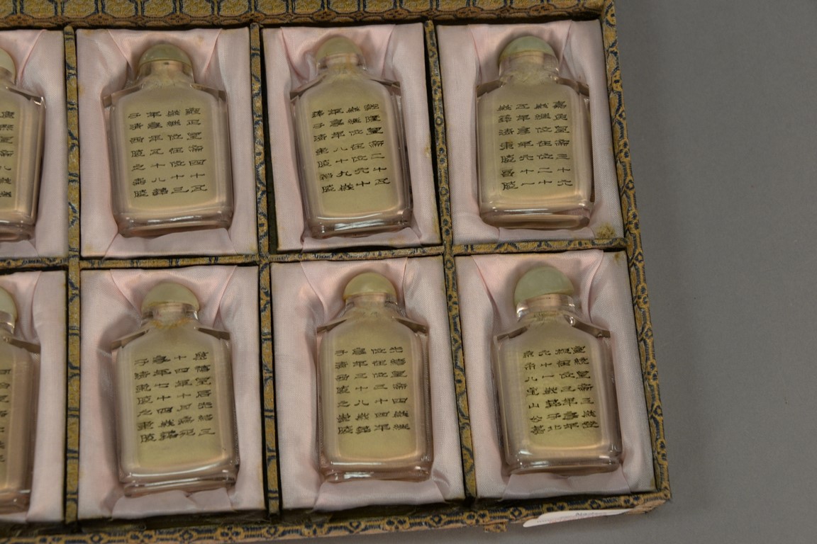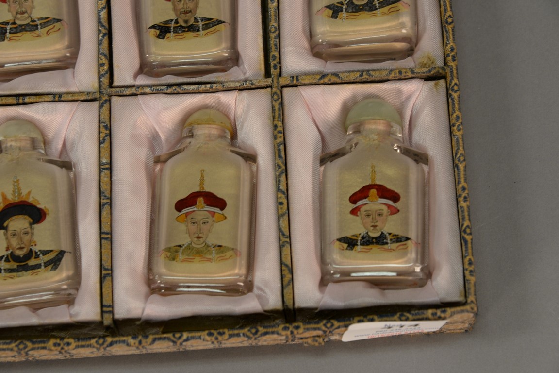 Lot 414: Set of twelve crystal reverse painted emperor and empress snuff bottles. hts. 3in. – 3 1/4in.