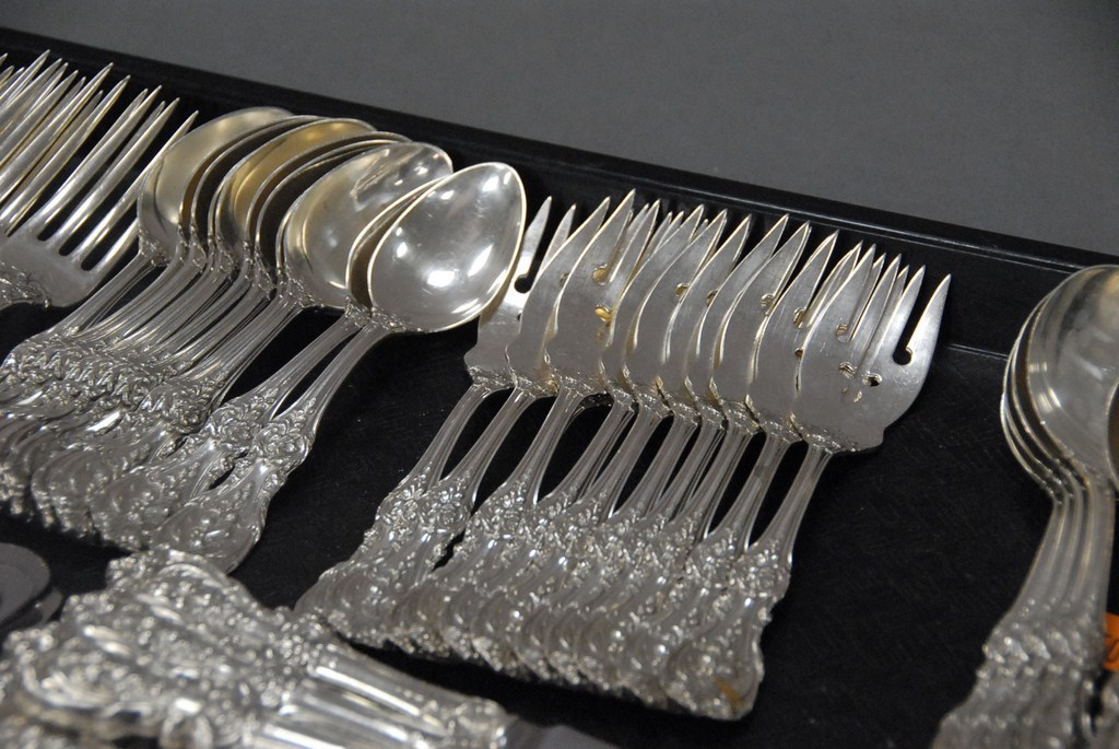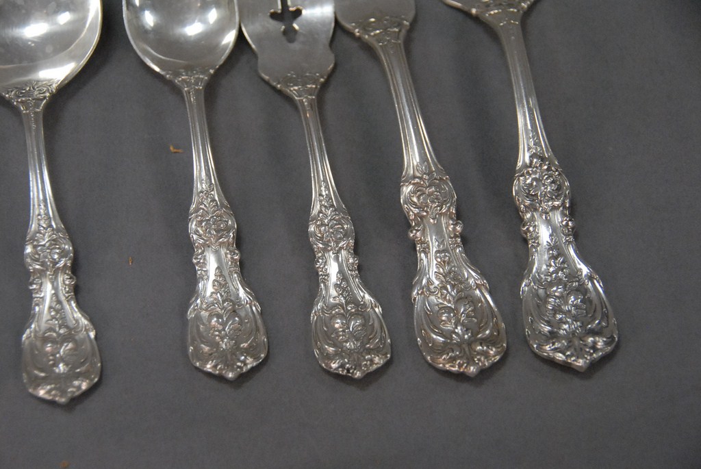 Sterling silver flatware Francis I setting for twelve consisting of 12 dinner forks, 12 salad forks, 12 teaspoons, 12 soup spoons, 12 dinner knives, 12 butter knives, 2 serving forks. Provenance: property from a home in Rockville Center, New York which was decorated by Iris Apfel. 71.9 t oz. plus 24 handles