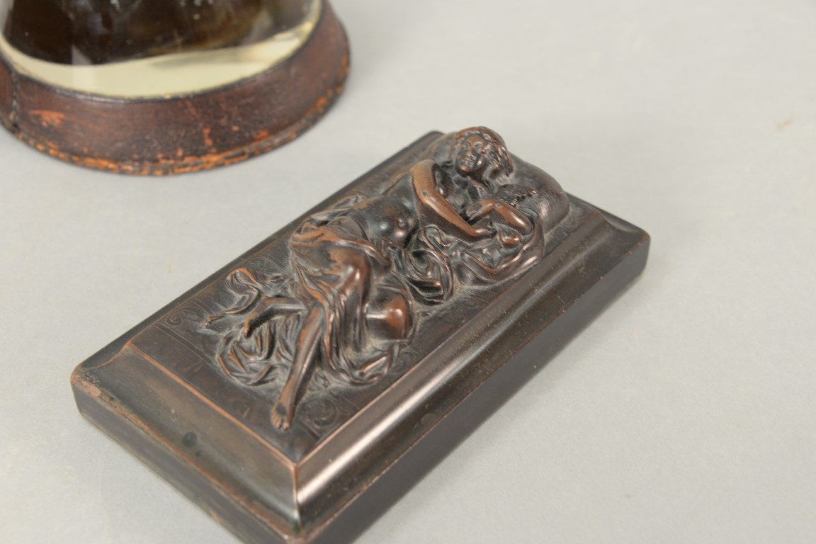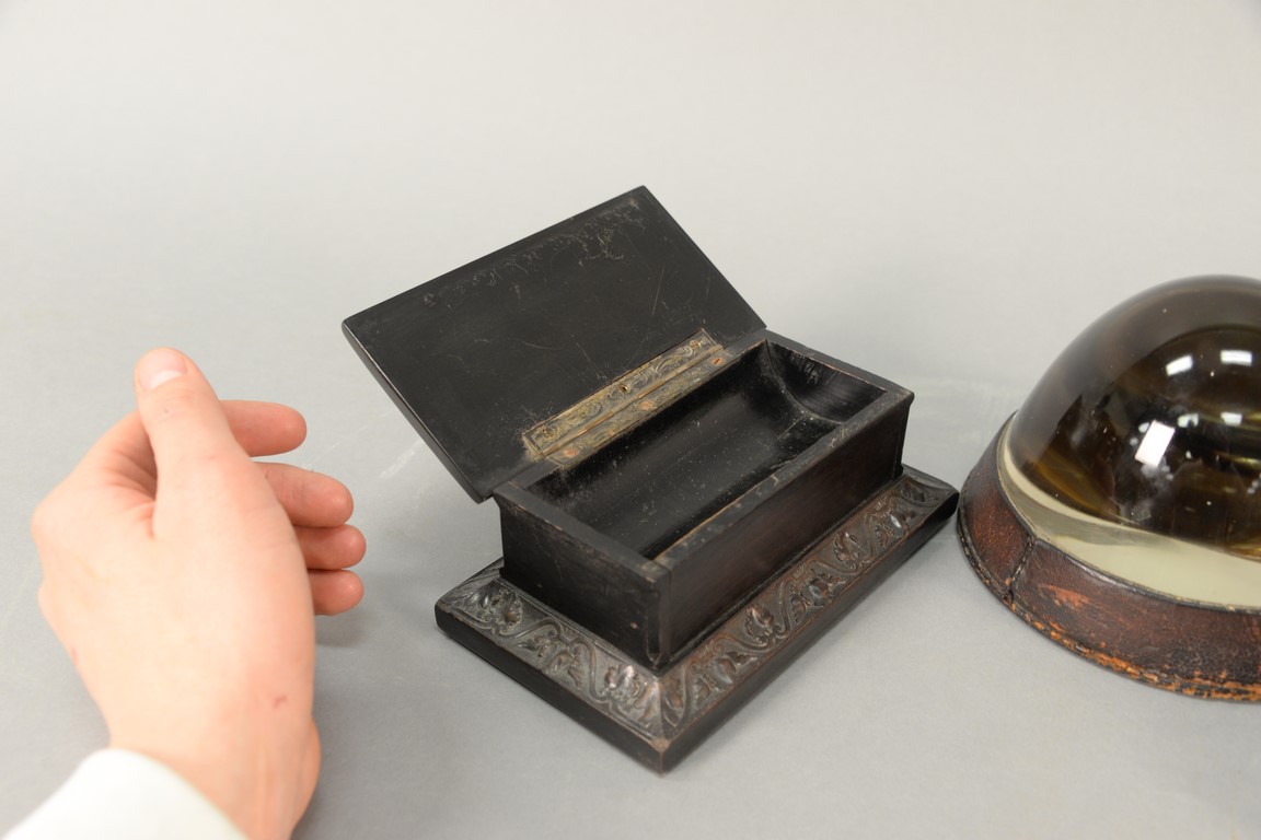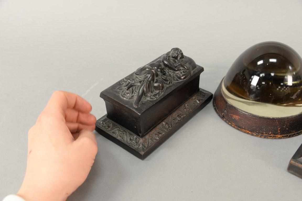 Three piece group to include large glass magnifying glass with leather trim along with two Victorian carved nude women lying with bird one with hinged cover. magnifying glass: diameter 6 1/4 inches figures: lengths 6 3/4 inches and 7 inches Provenance: Estate of Dr. Steve Leder