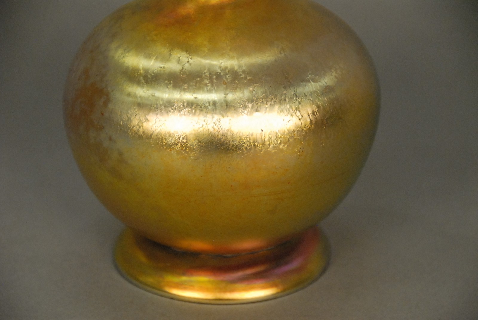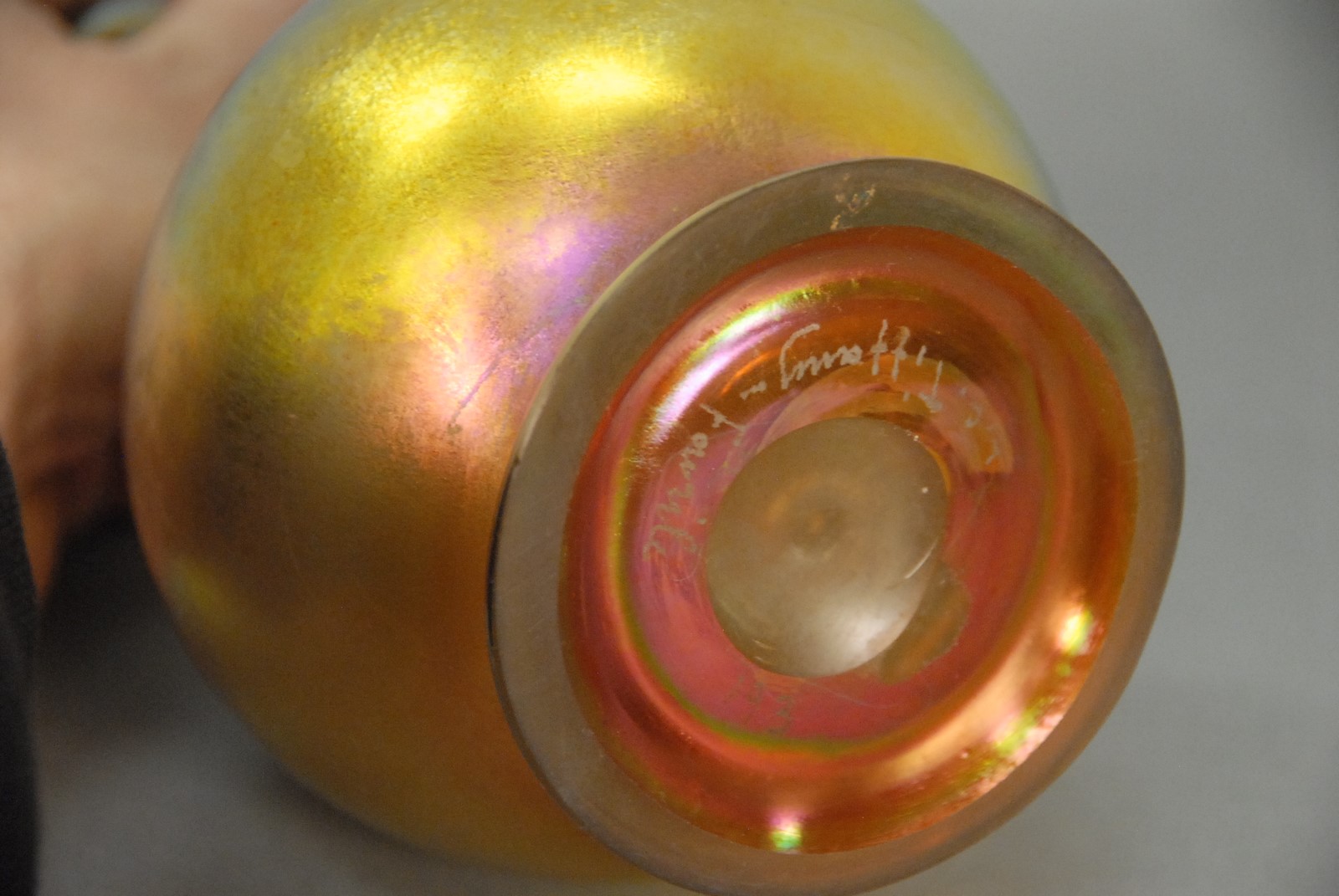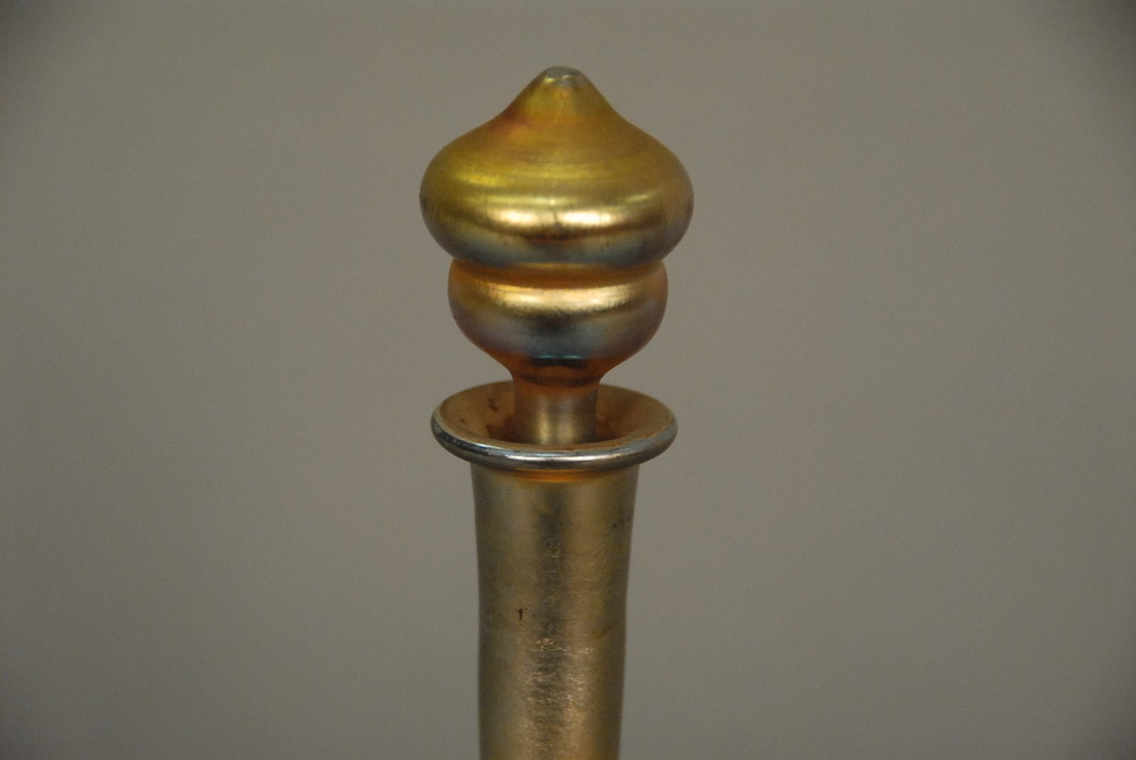 Lot 414: Tiffany gold iridescent Favrile glass decanter with stopper fitting the elongated neck of the conforming decanter flowing to the bulbous base, marked L.C. Tiffany Favrile 193, stopper marked 193. ht. 10 in.