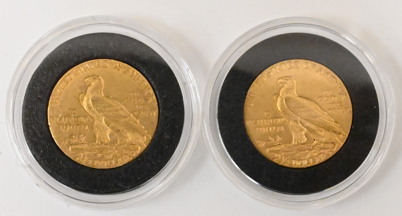Two 2 1/2 Gold Indian Coins, to include 1908 2 ½ Indian AU, along with a 1911 2 1/2 Gold Indian XF