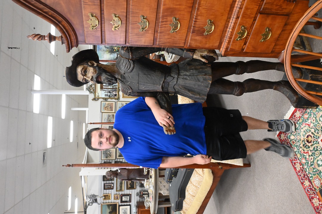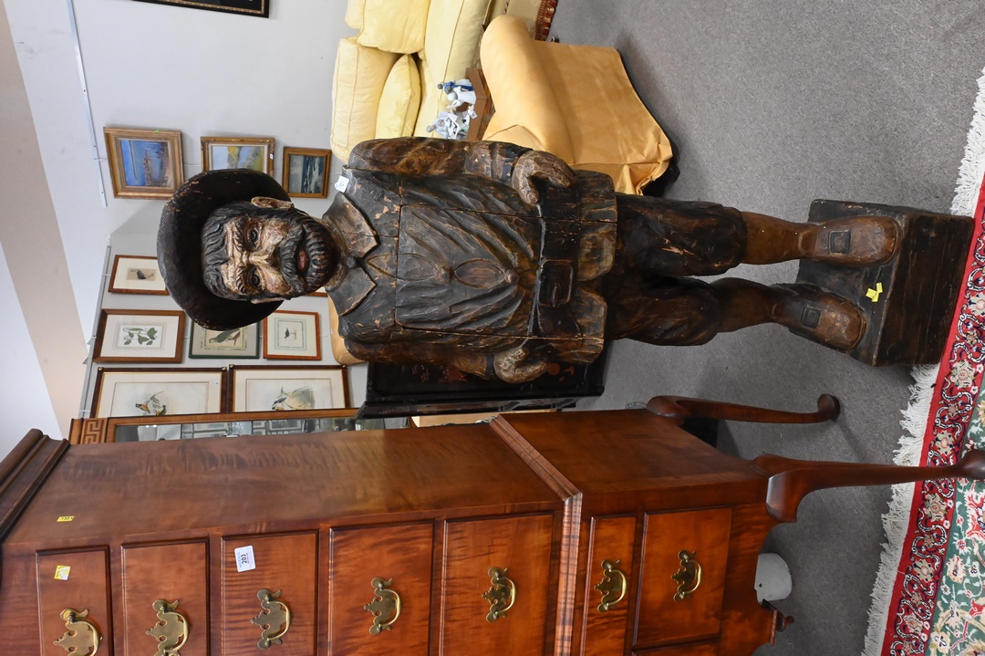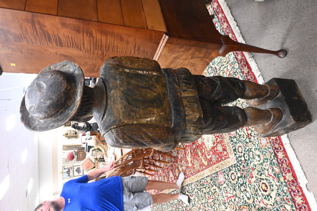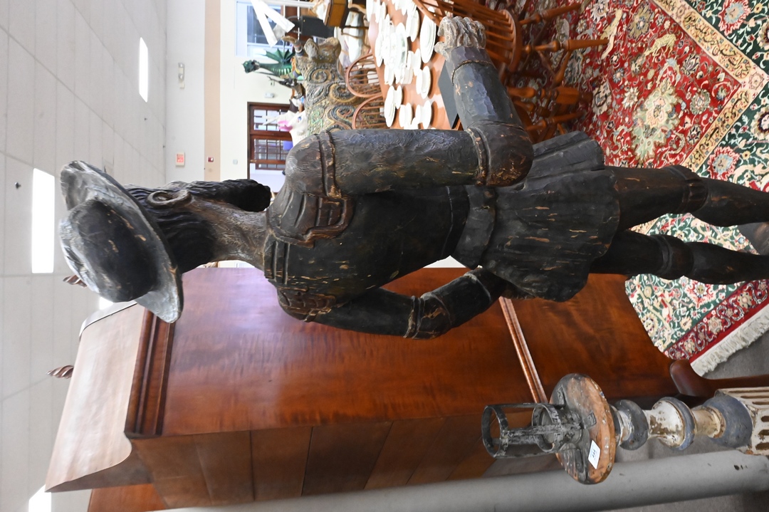 Two Life Size Carved Figures, to include Don Quixote, along with Sancho Panza; each having drop front compartments in torso; heights 76 and 63 inches.