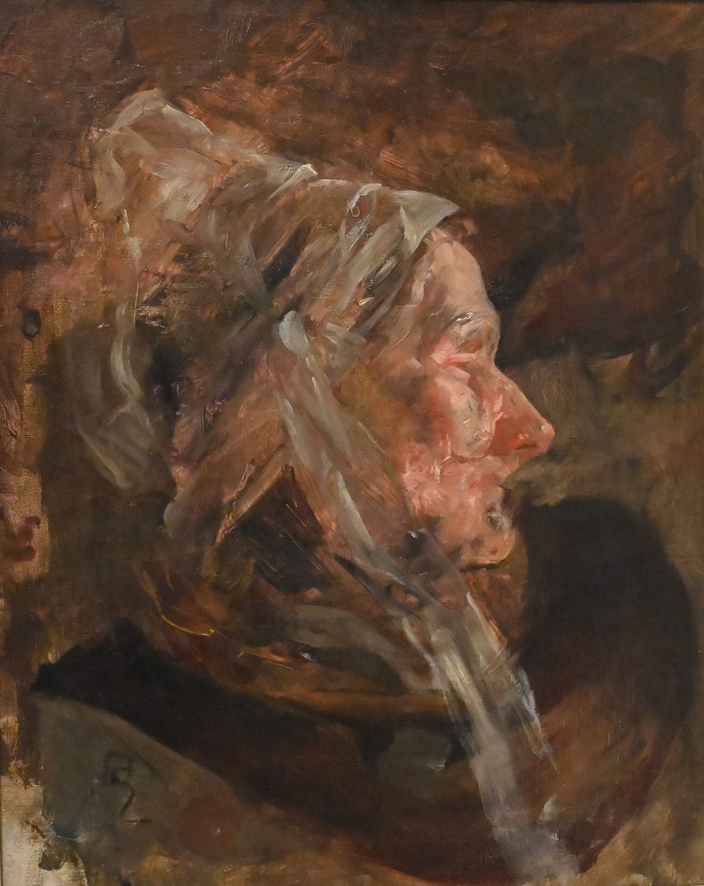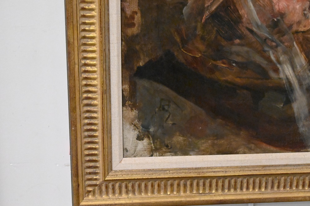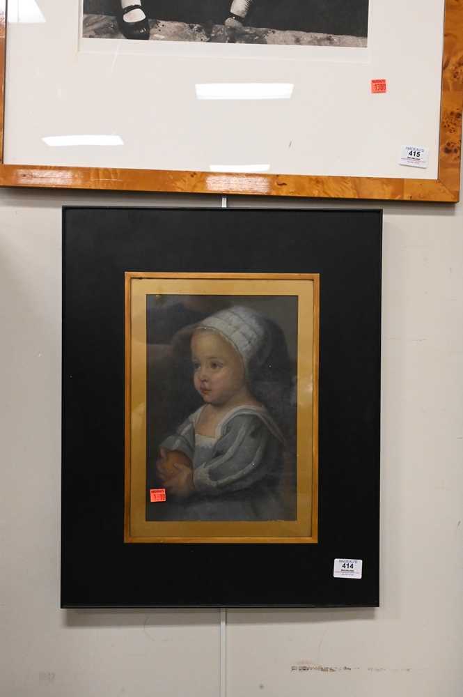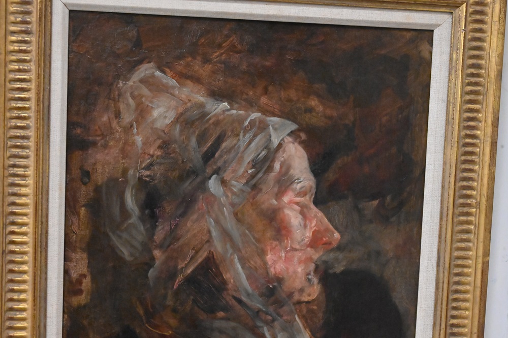 Two Piece Framed Lot, to include oil on canvas laid on board, bust of elderly woman; height 13 inches, 17 inches wide; along with an oil on canvas portrait of a young girl with fruit, height 9 1/2 inches, width 12 1/2 inches; both unsigned.