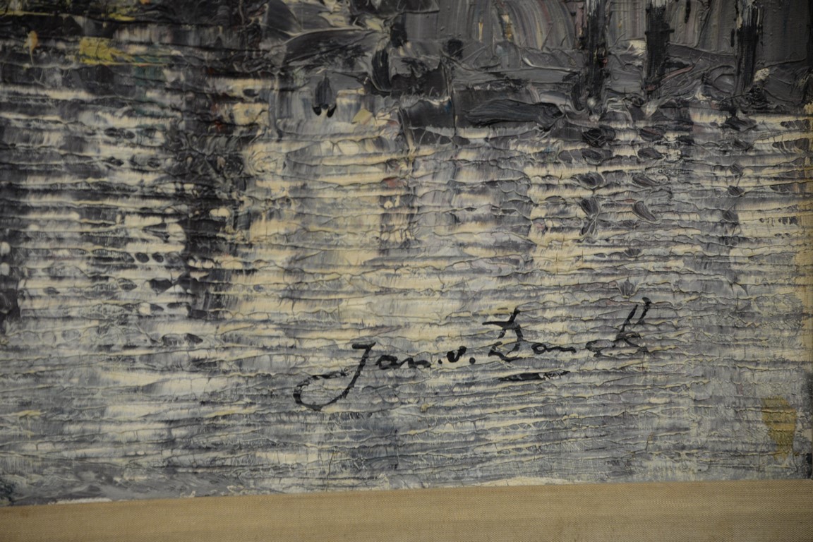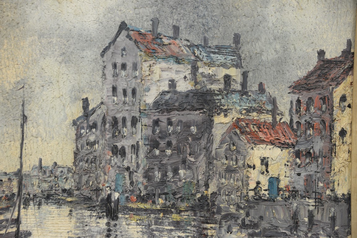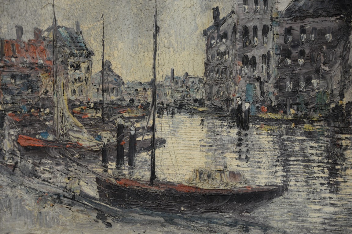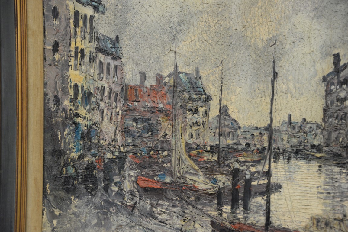 Lot 414A: Oil on canvas, Sailboats Docked in Harbor, signed indistinctly bottom right, 24 x 36.