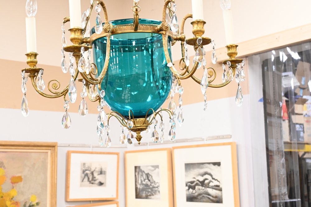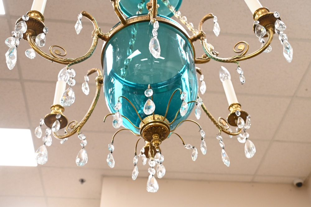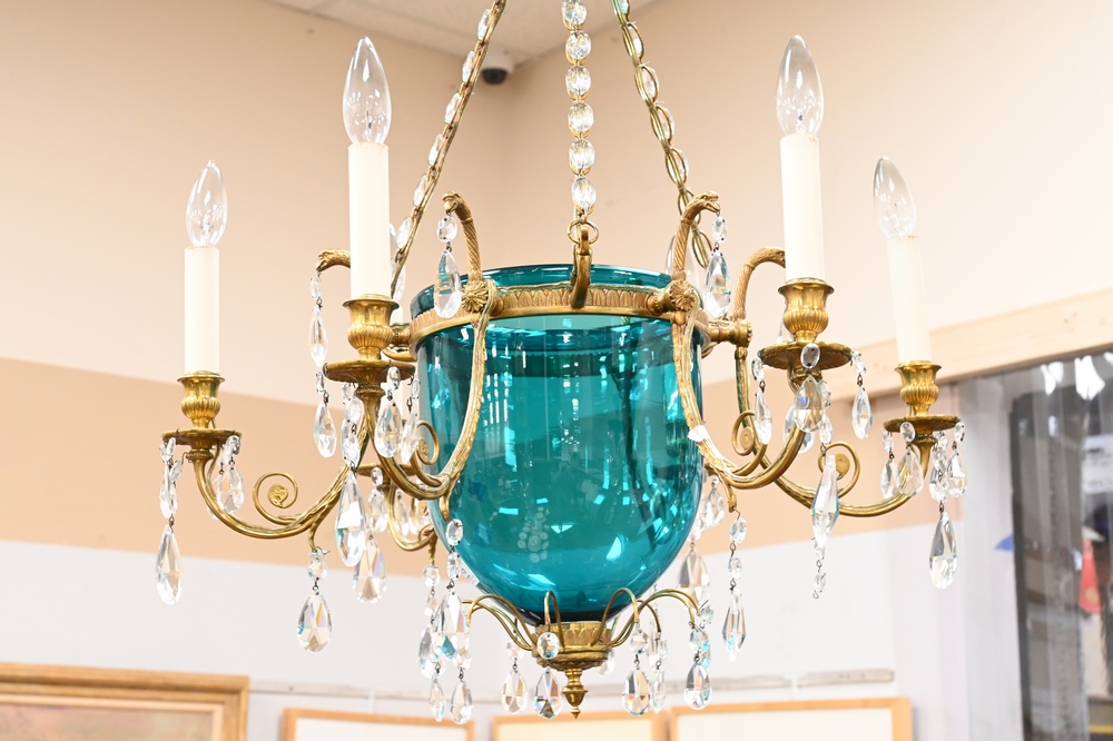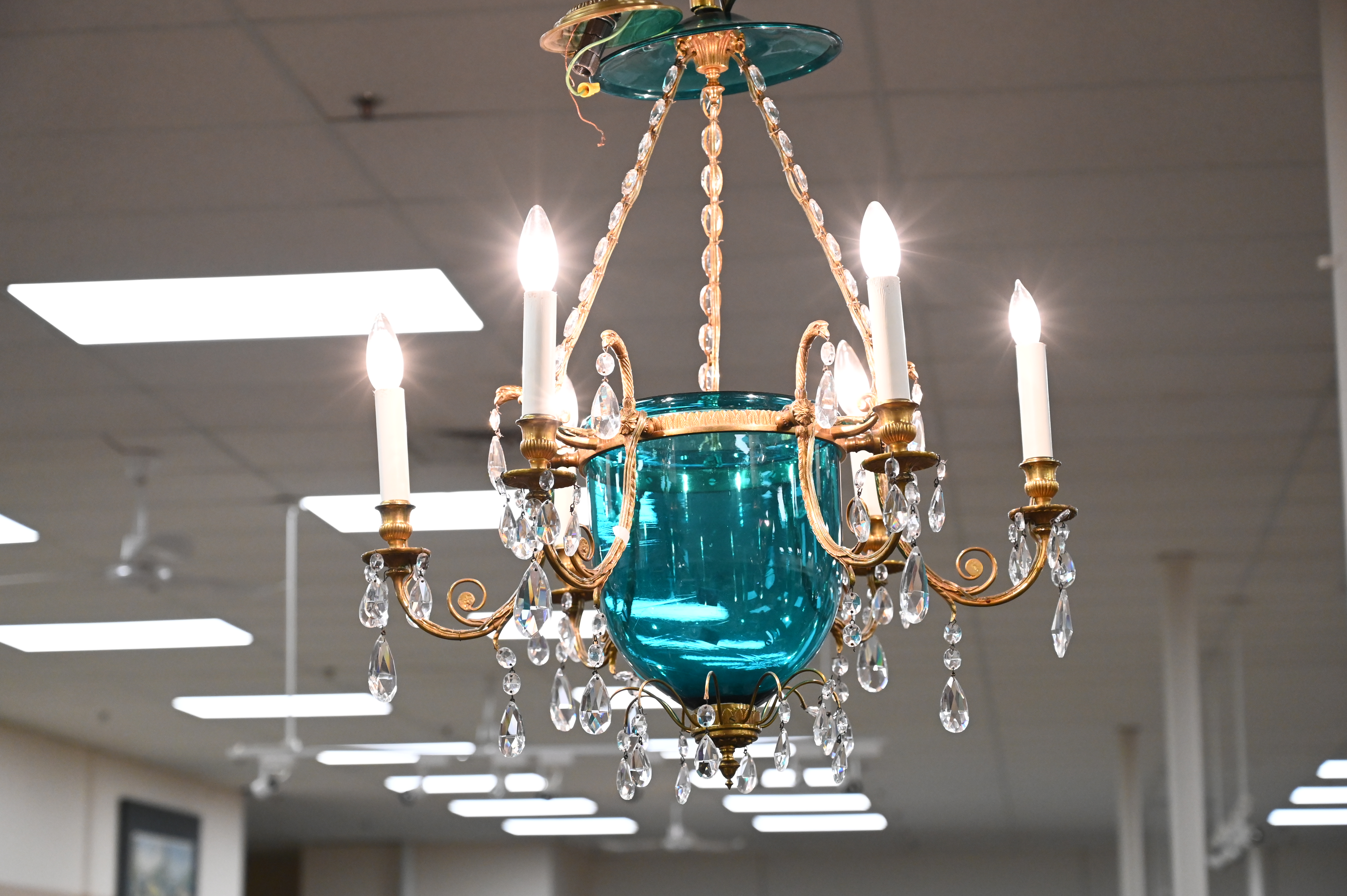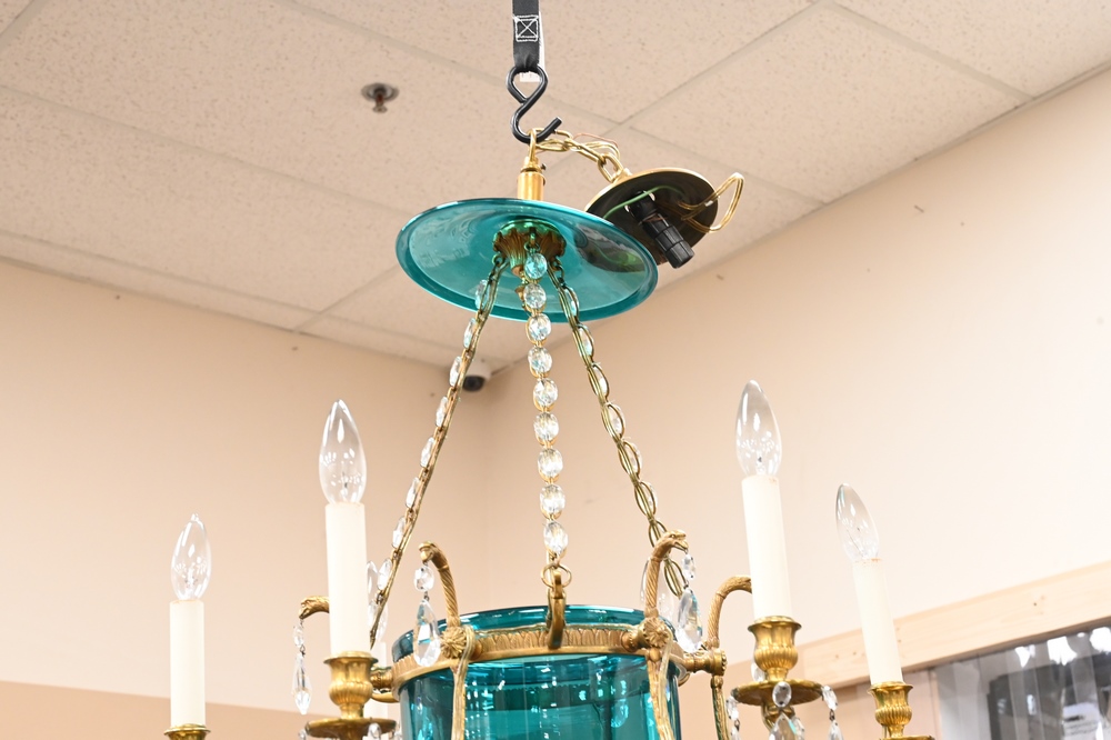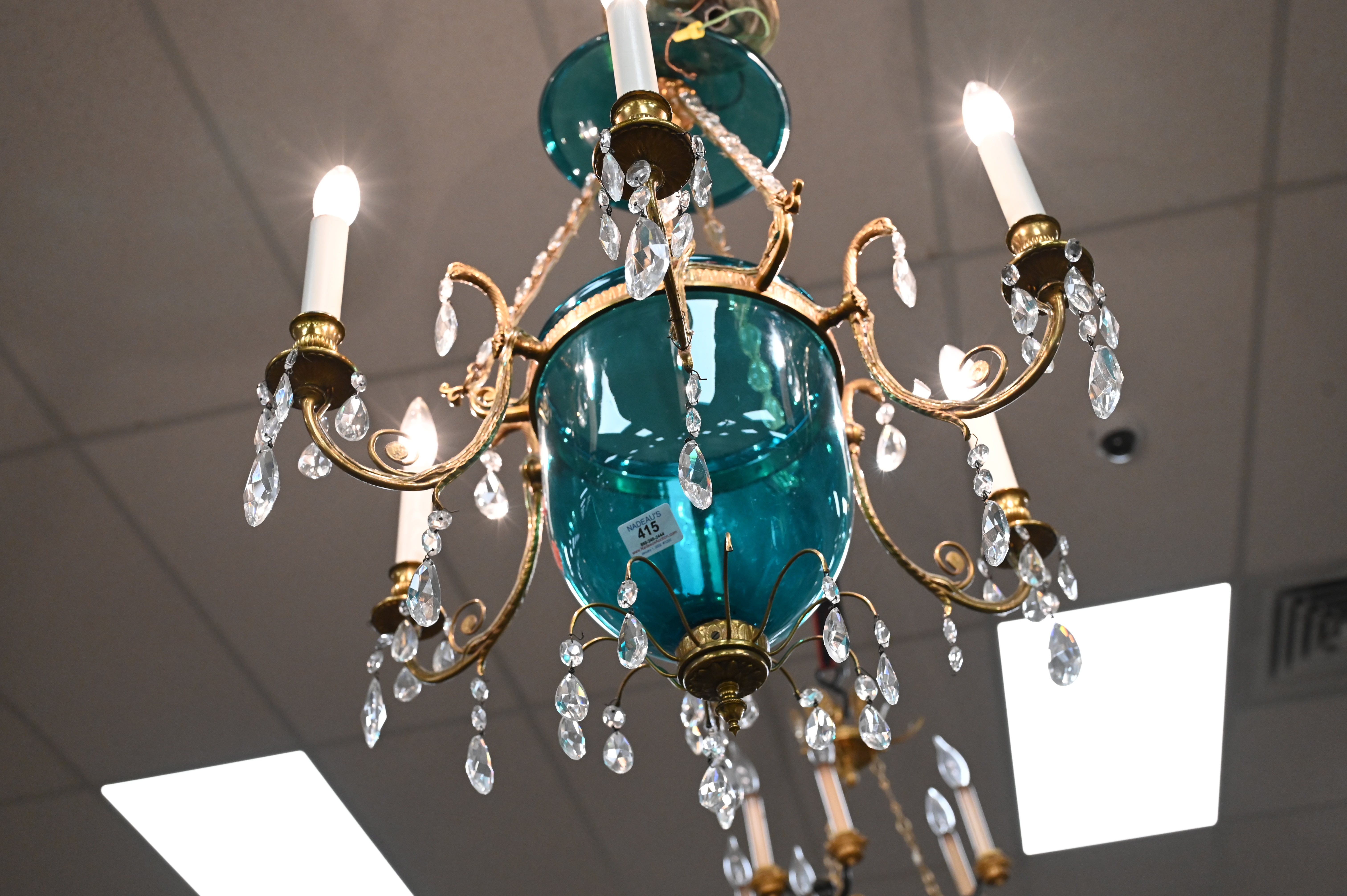 Lot 415: Gilt Bronze and Turquoise Glass Chandelier, having turquoise plate top over crystal mounted supports with turquoise bowl, surrounded…