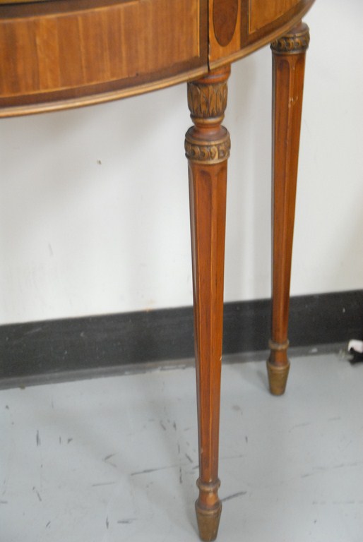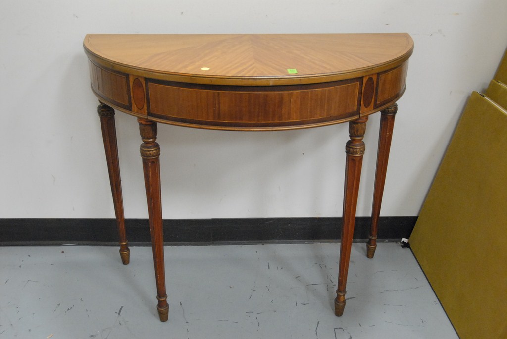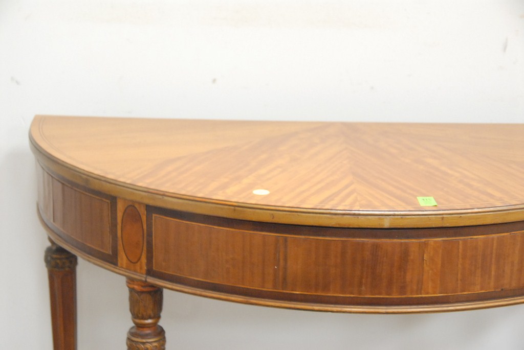 Lot 415: Inlaid satinwood Sheraton style half round table.