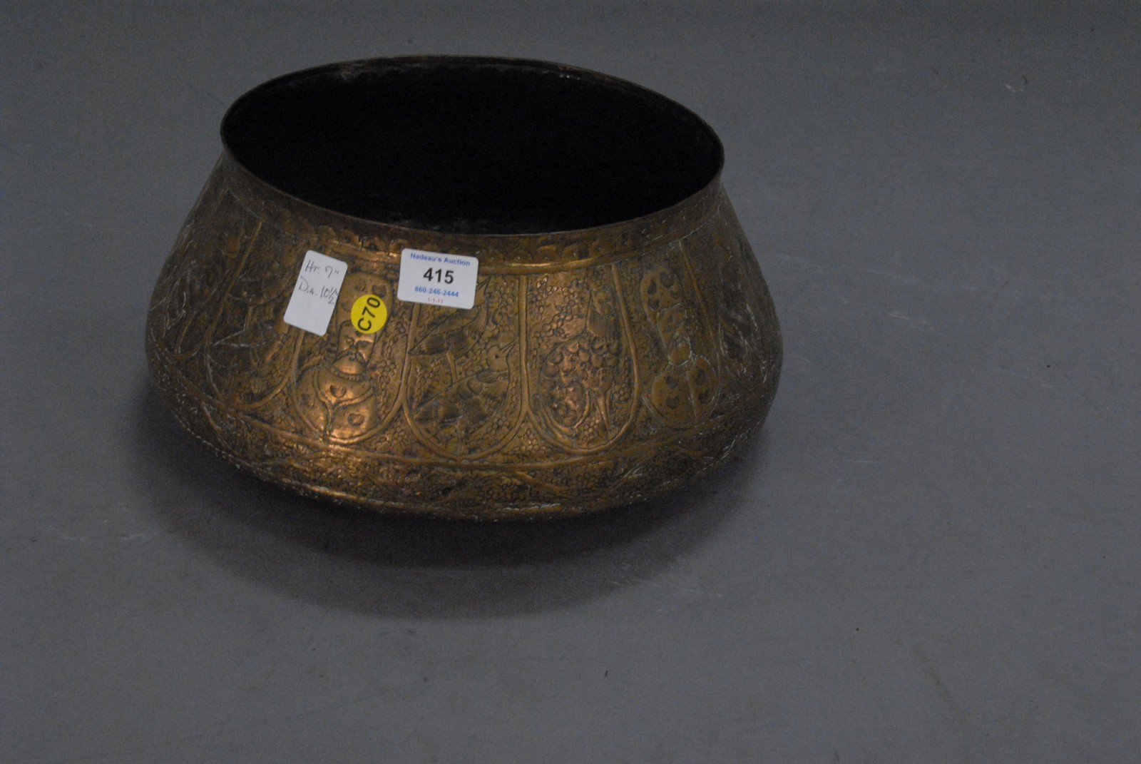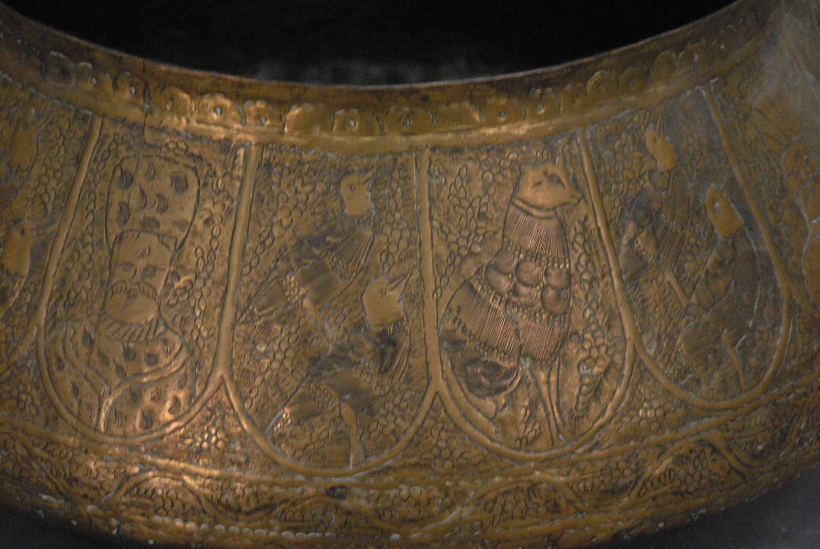 Islamic brass urn decorated with chased men, birds and animals, probably 18th – 19th century.