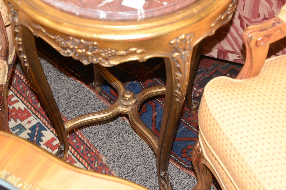 Lot 415: Louis XV Style Giltwood Occasional Table, having round rouge marble top over x-stretcher base, height 28 inches, diameter 21 inches.