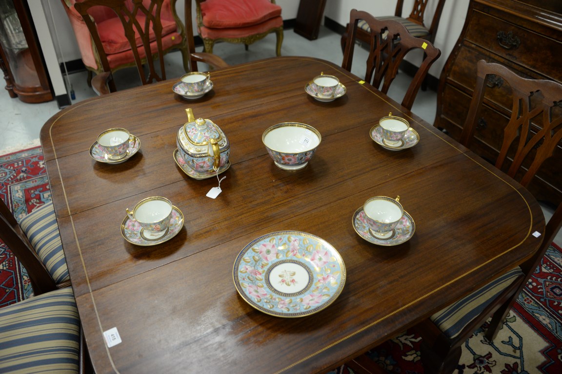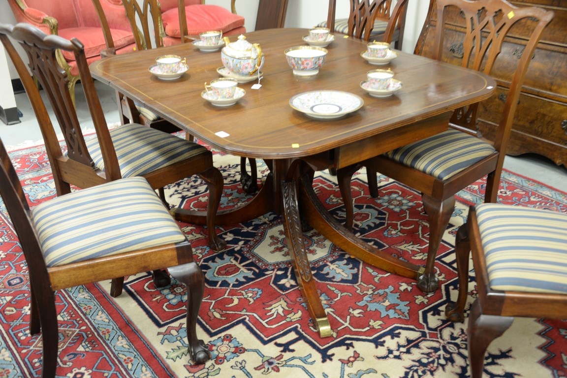 Lot 415: Mahogany Federal style drop leaf table with inlaid top and four 11 inch leaves. open: 44 1/2 x 50 closed: 44 1/2 x 94 in.