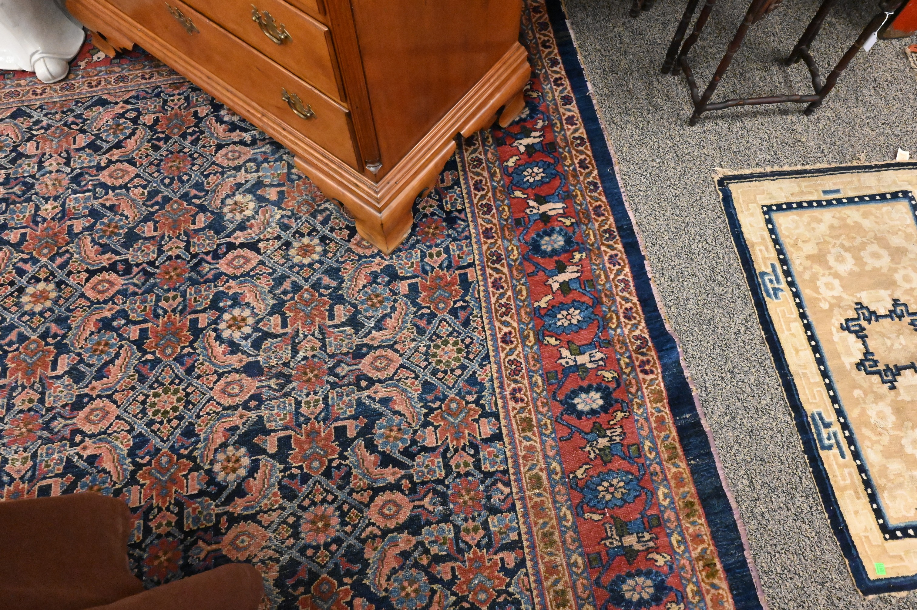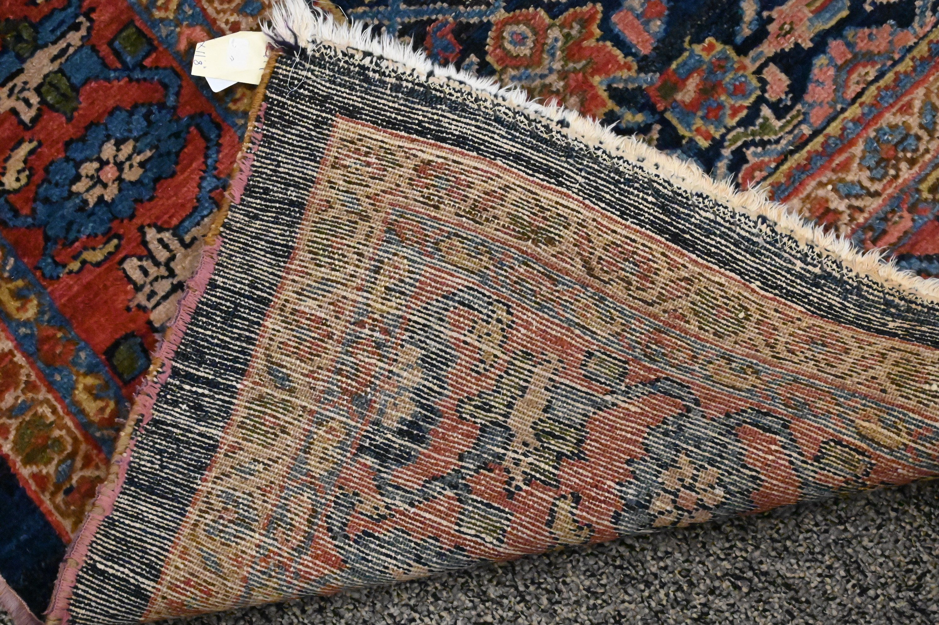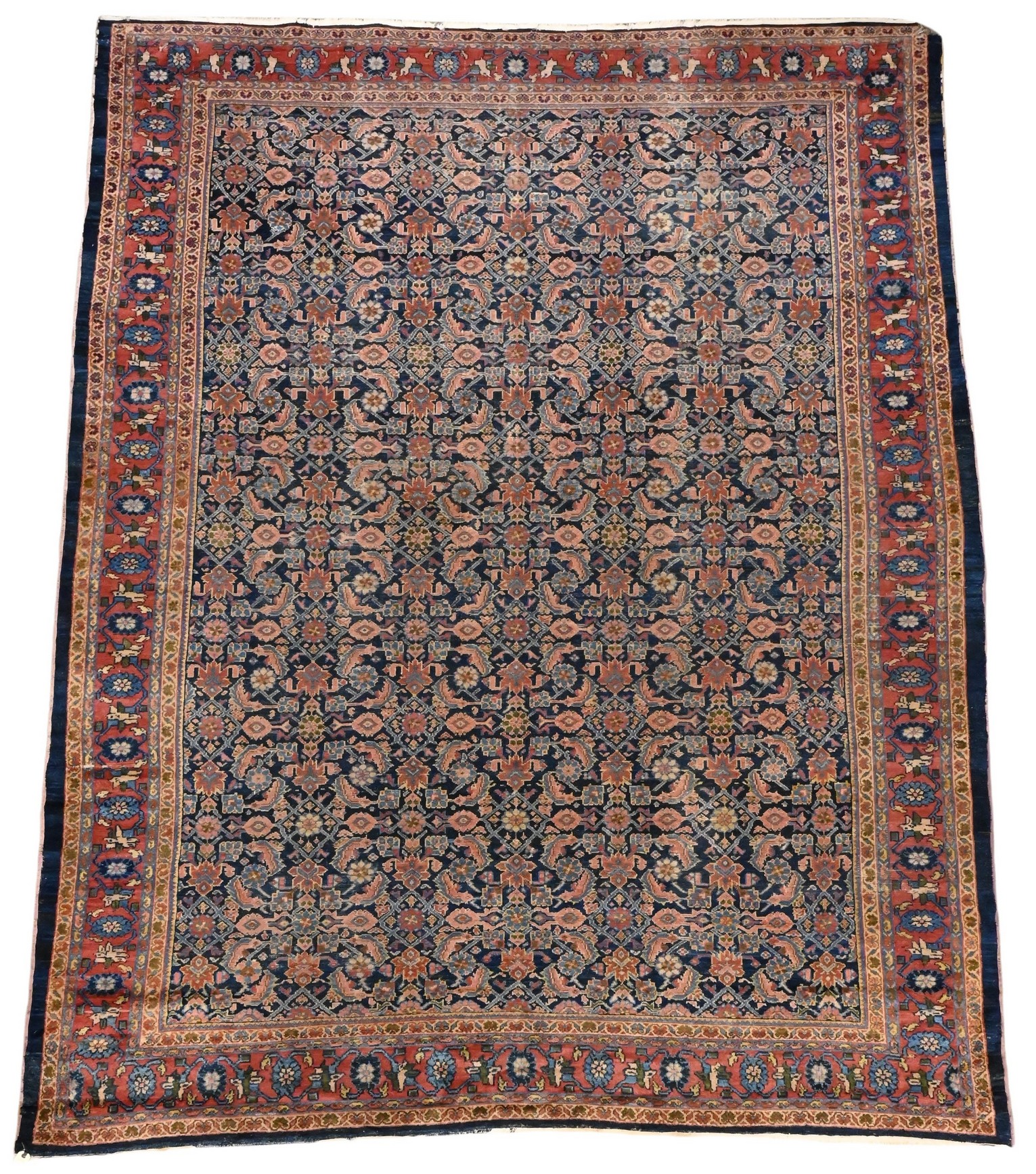 medium blue ground with an allover “herati” pattern within a major pale red colored border of rosettes and geometric trellis, early 20th century