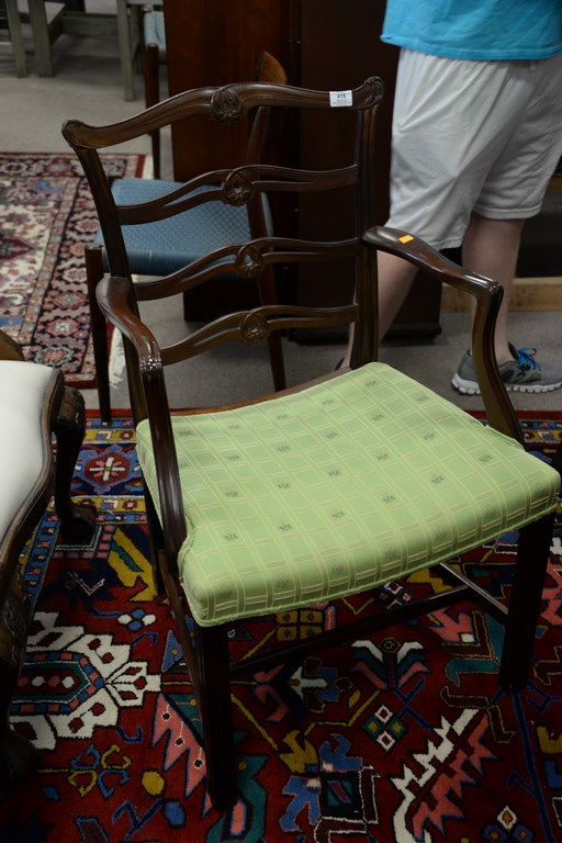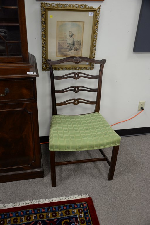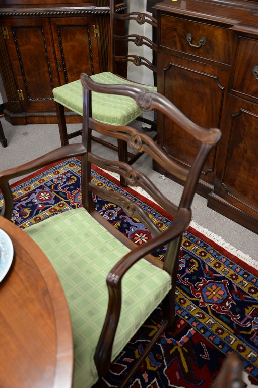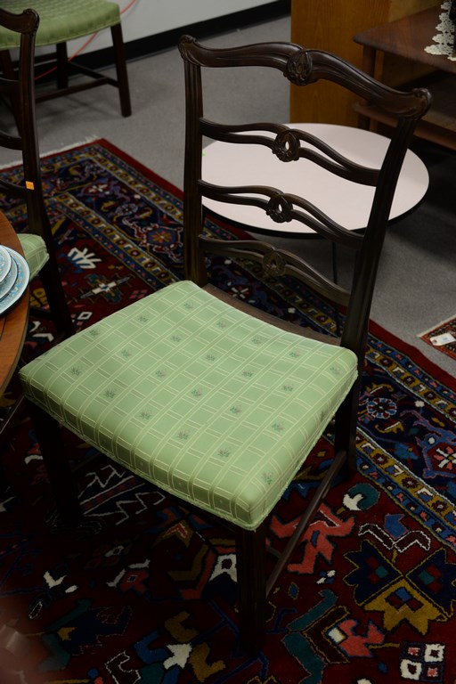 Set of eight custom mahogany dining chairs with clean fully upholstered seats.