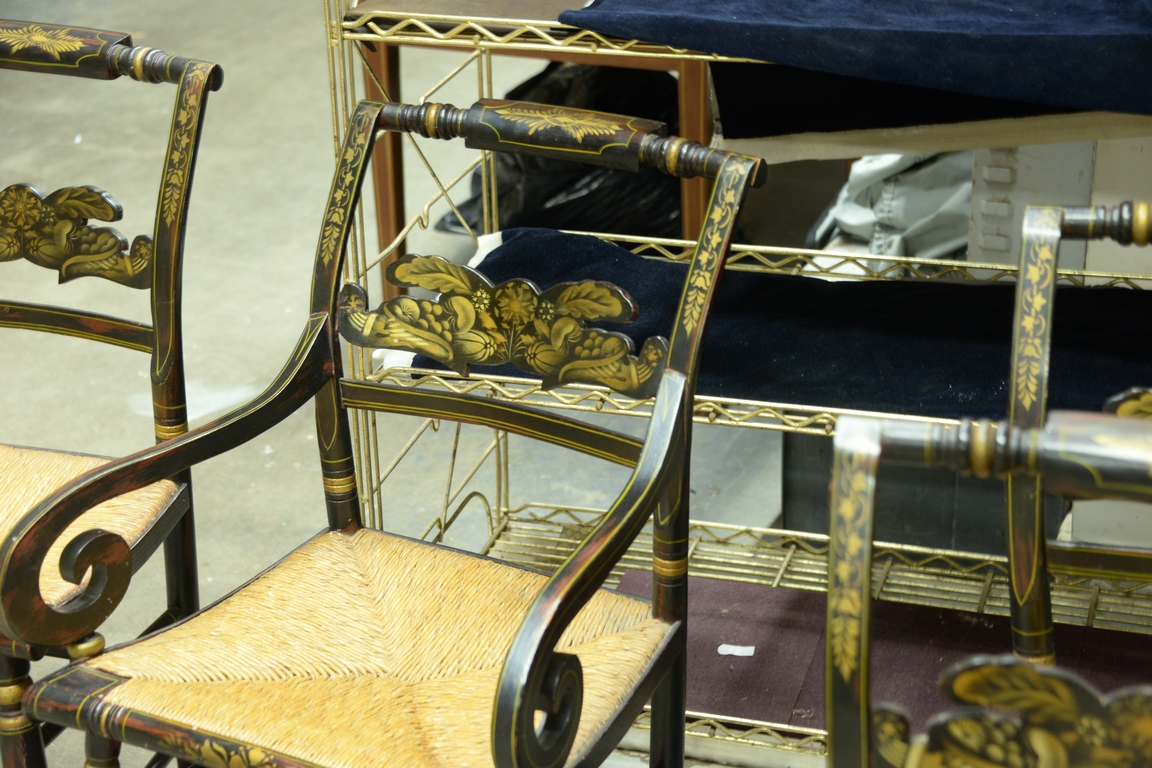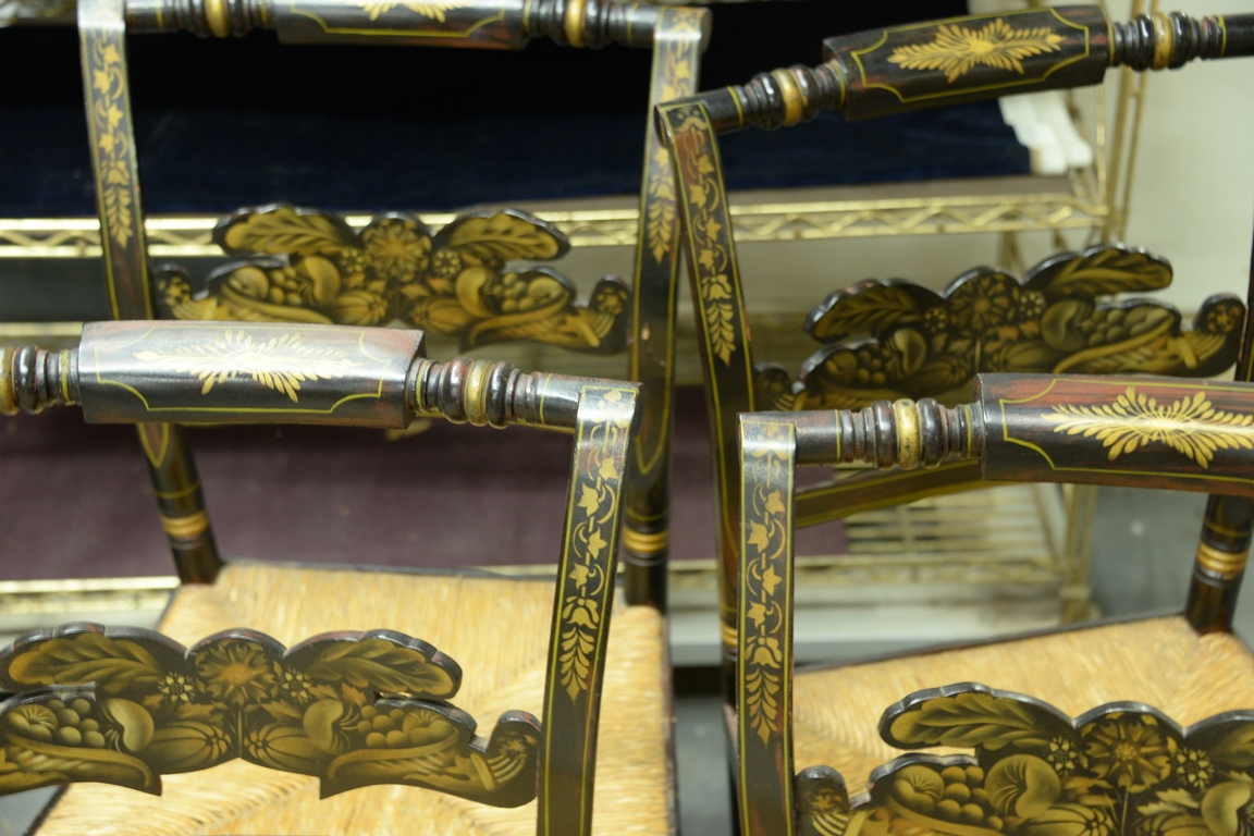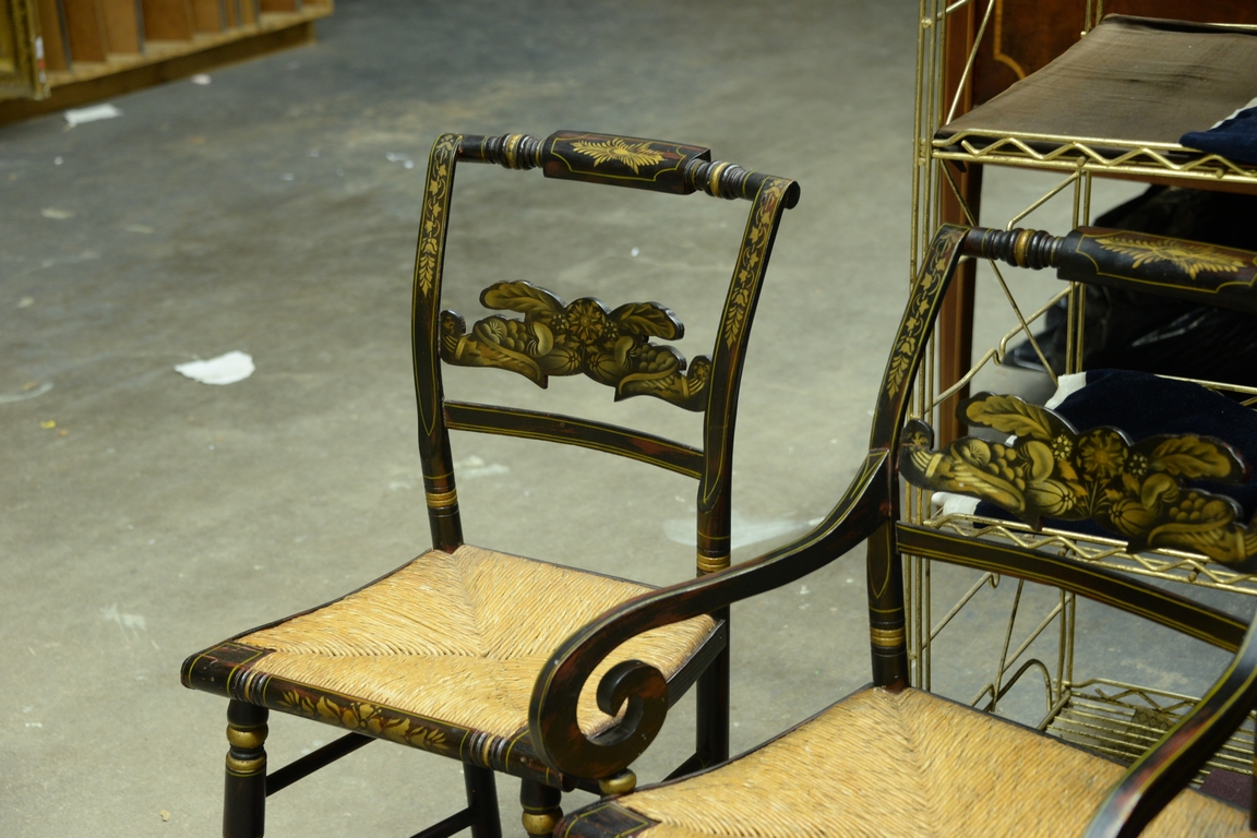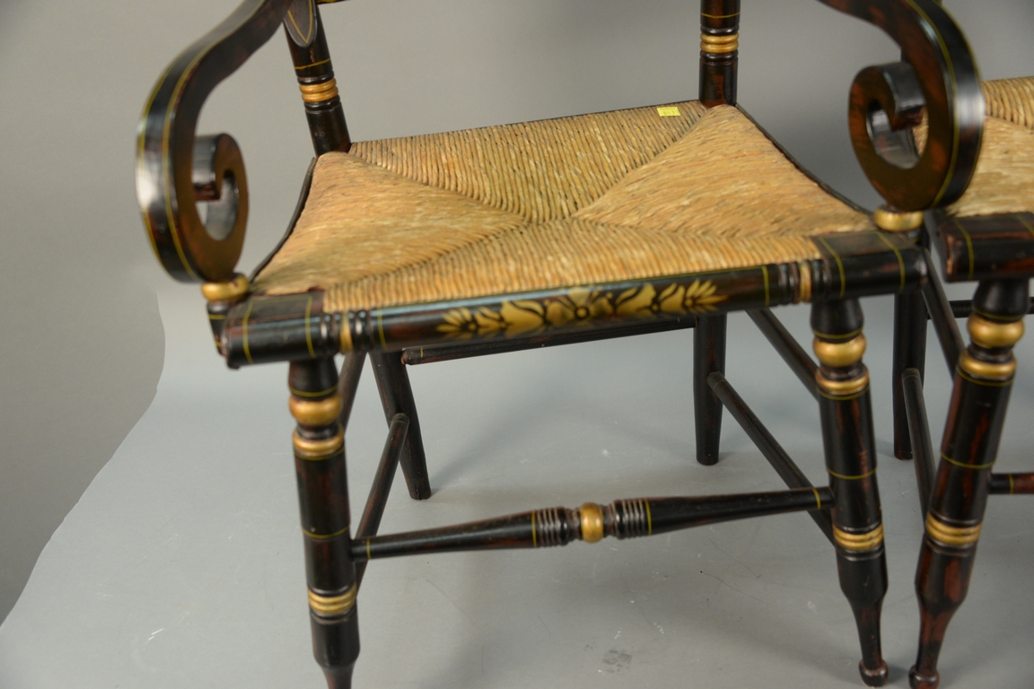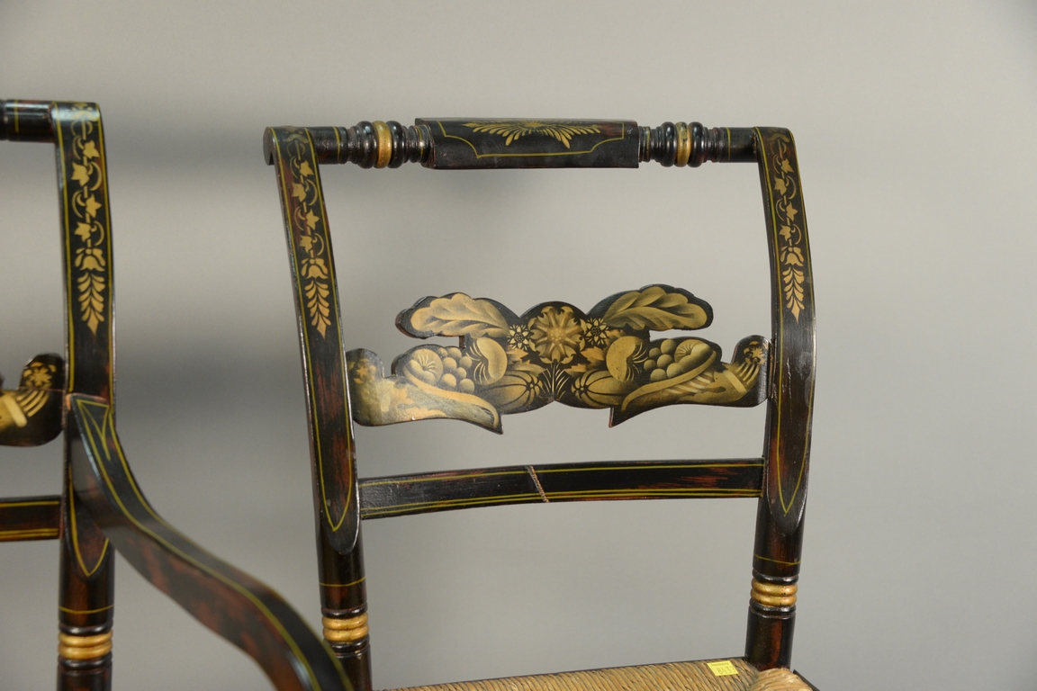 Lot 415: Set of eight Sheraton chairs, all stenciled with carved backs and rush seats includes two arm and six side. ht. 18in., seat ht. 34in.