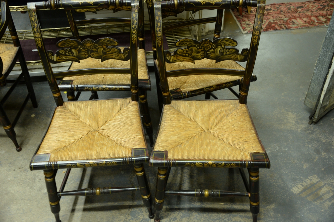 Set of eight Sheraton chairs, all stenciled with carved backs and rush seats includes two arm and six side. ht. 18in., seat ht. 34in.