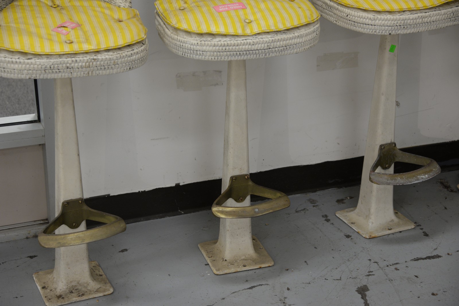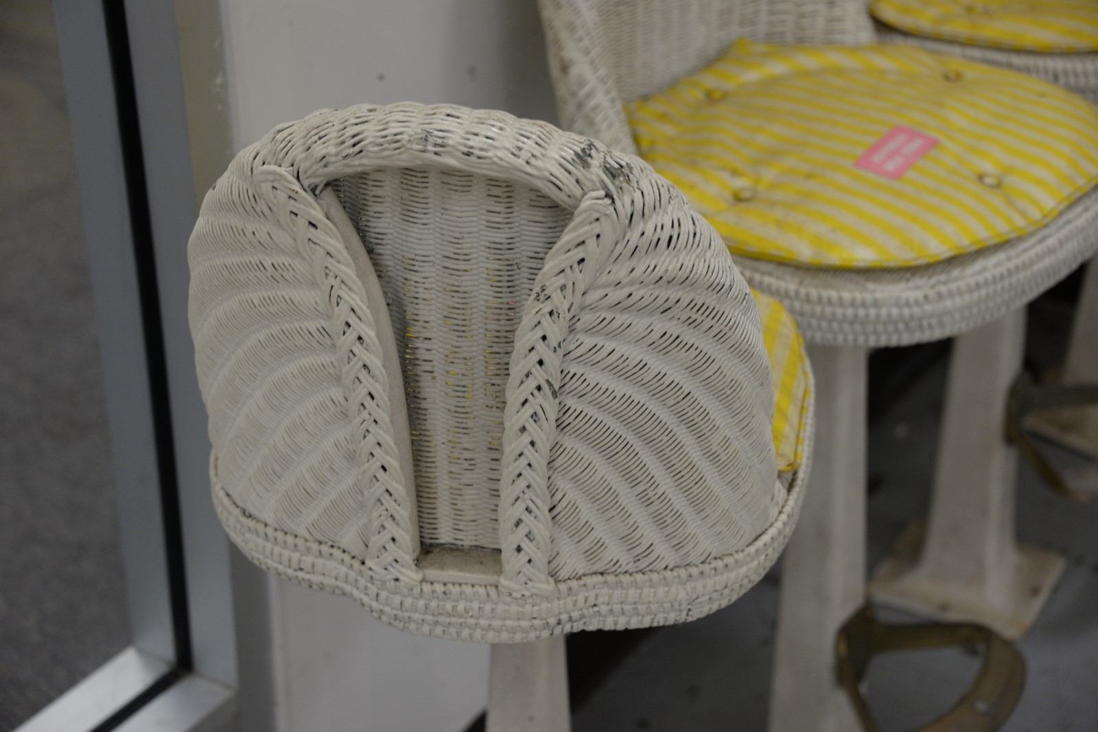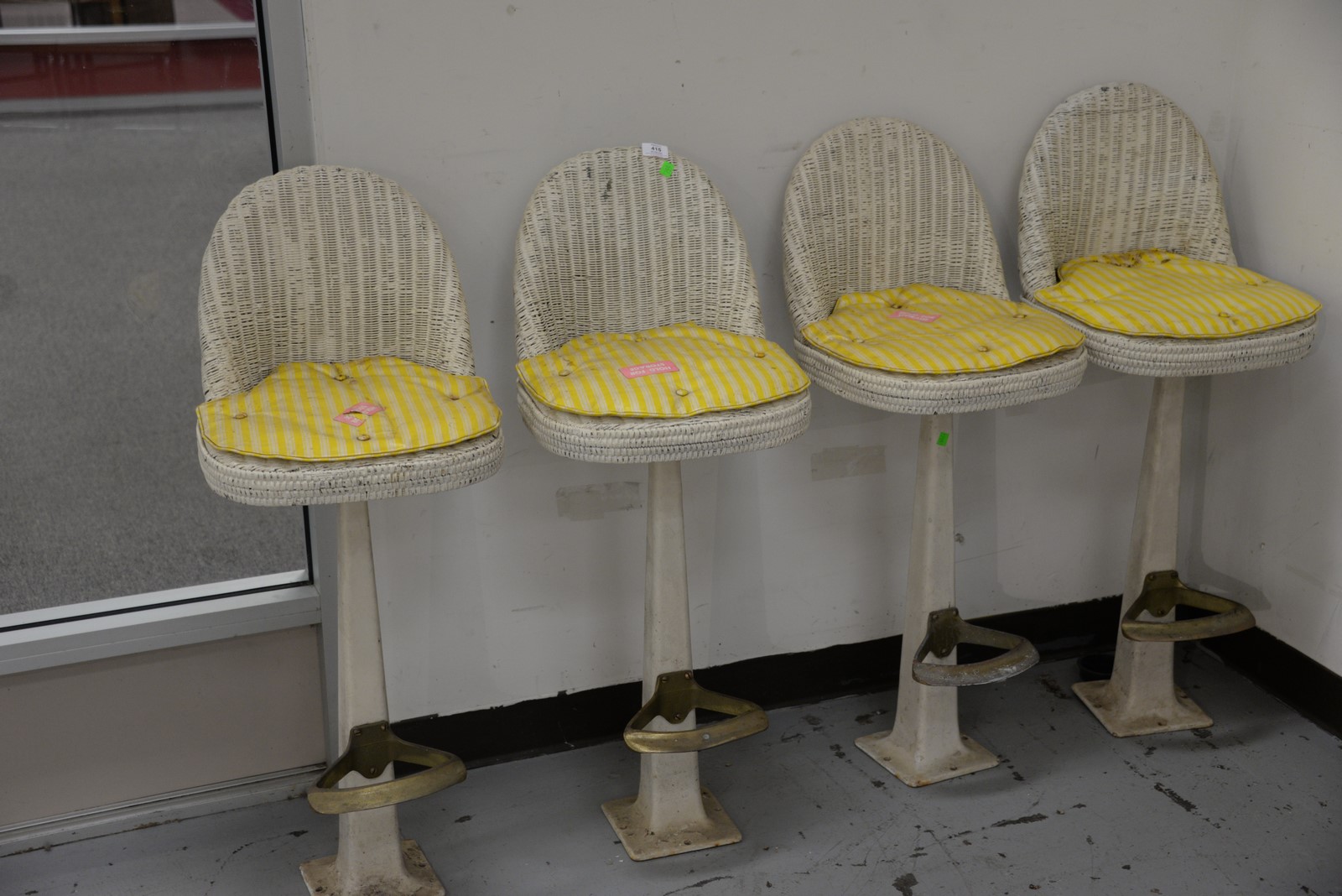 Set of four wicker bar stools with enameled pedestals. seat ht. 27 1/2 in.
