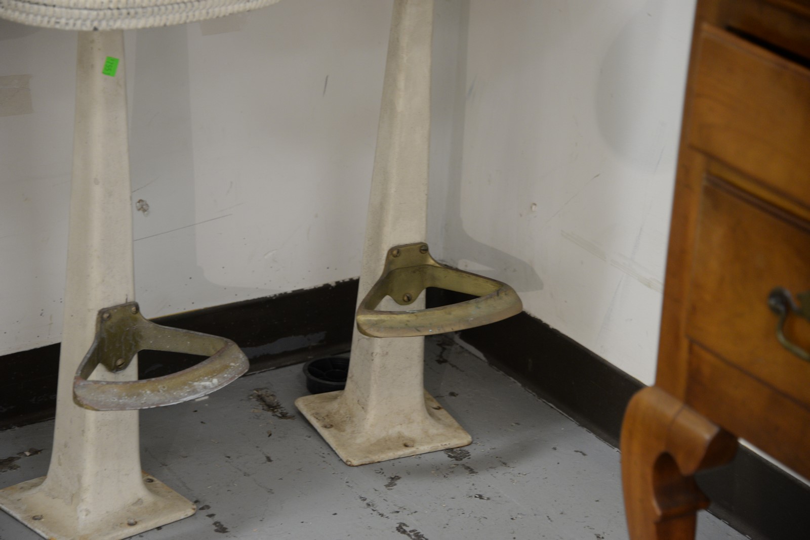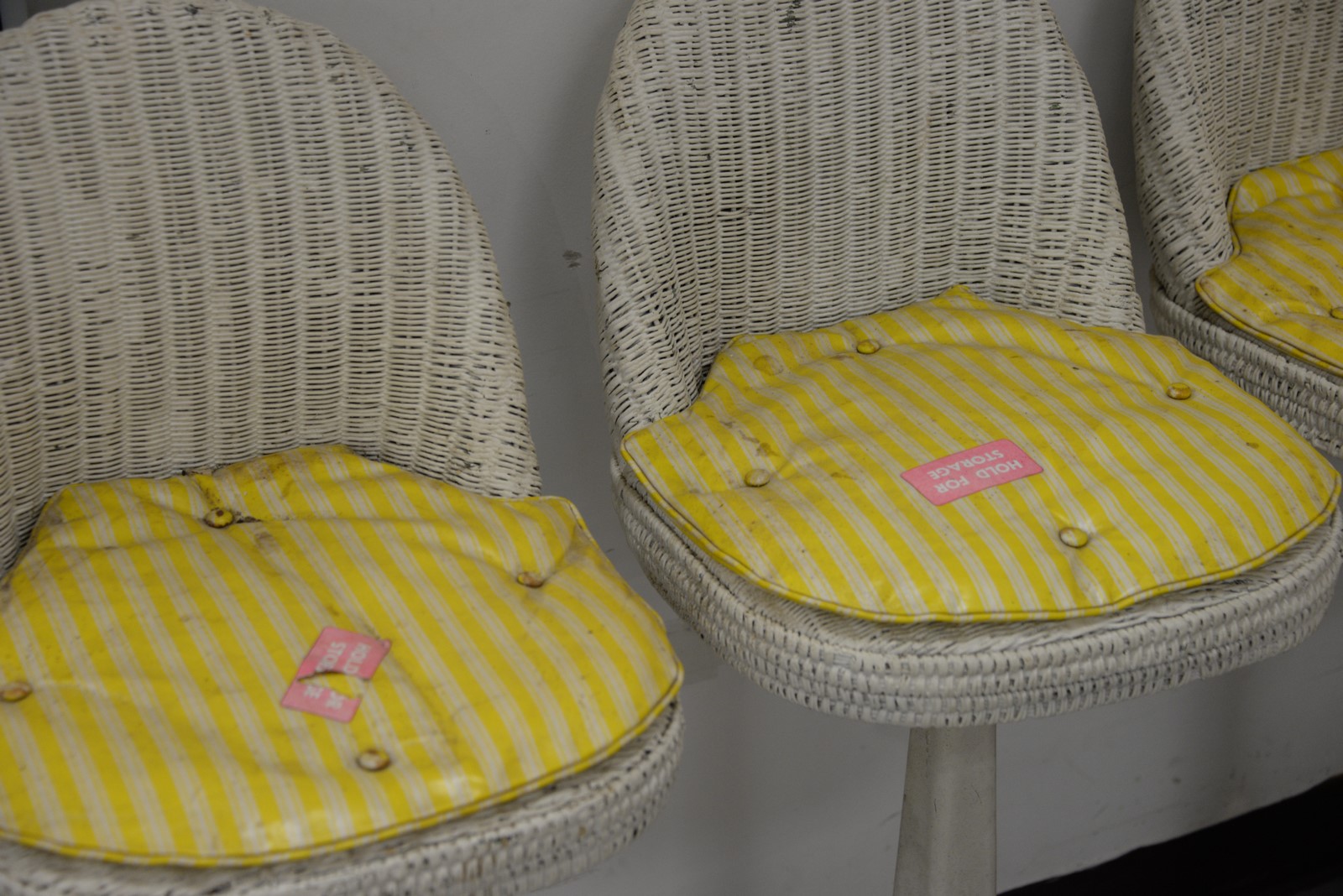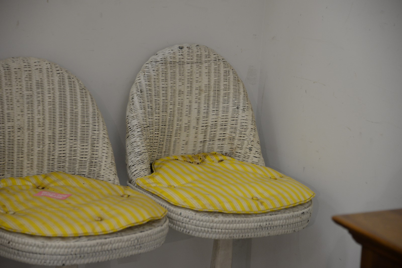 Set of four wicker bar stools with enameled pedestals. seat ht. 27 1/2 in.