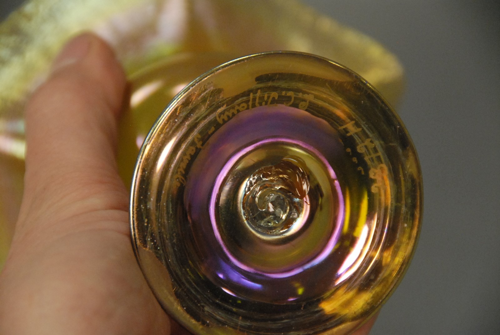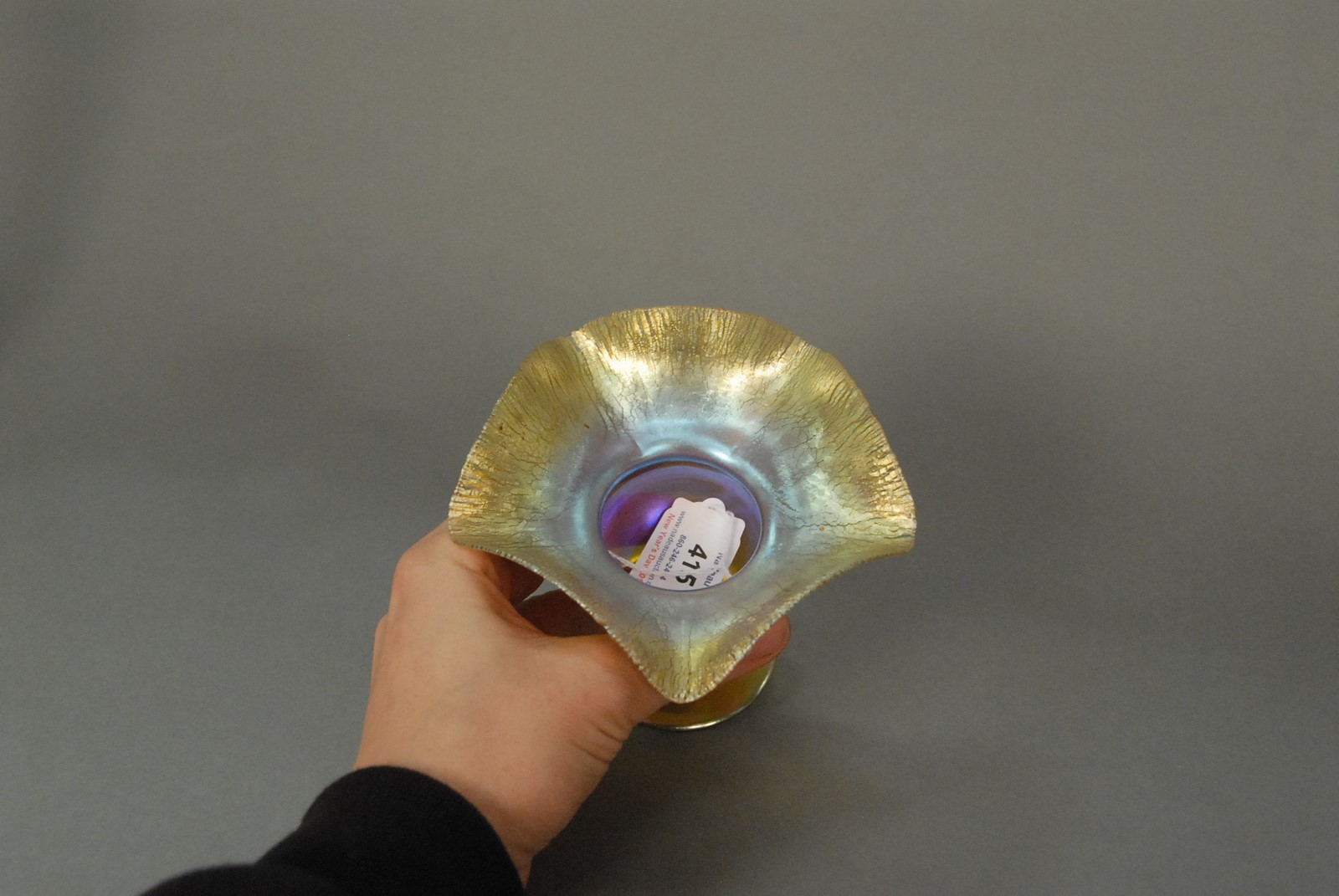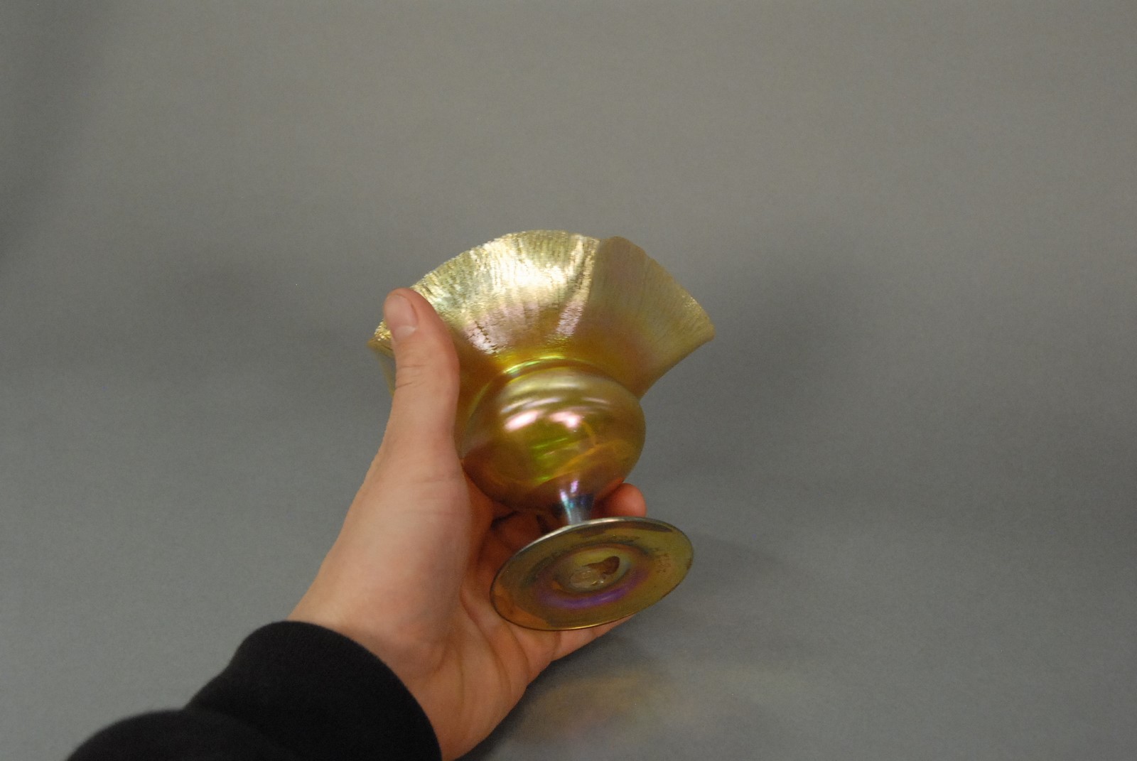 Lot 415: Tiffany gold Favrile glass compote with ruffled top and bulbous bowl on stem with round base, inscribed on bottom L.C. Tiffany Favrile 2812H. ht. 4 1/2 in. dia. 5 1/4 in.