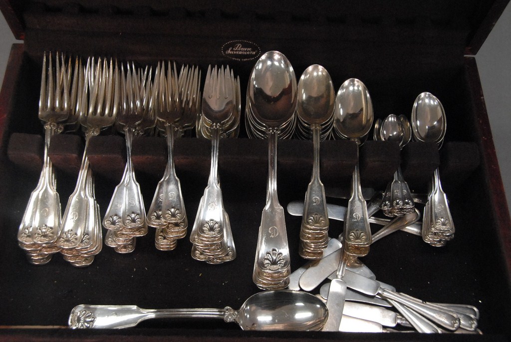 Lot 415: Tiffany Shell and Thread sterling silver flatware set for twelve plus 16 dinner forks, 18 lunch forks, 12 dessert forks, 15 butter …