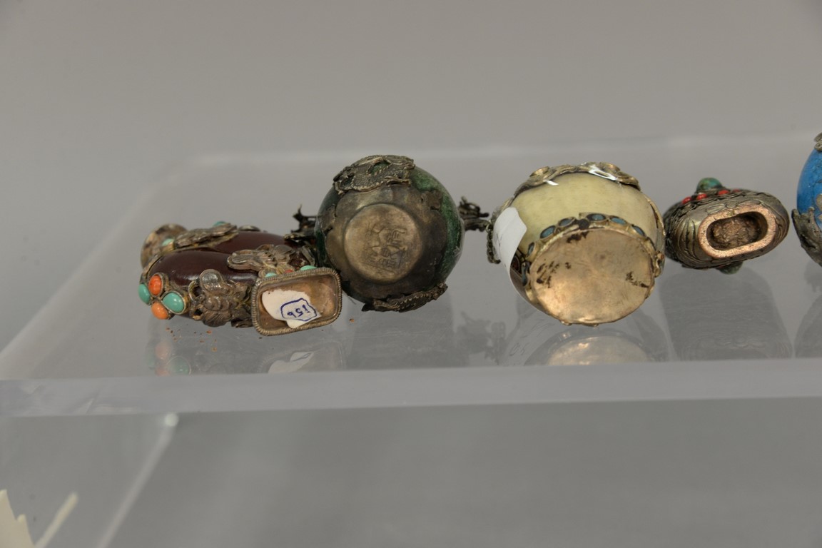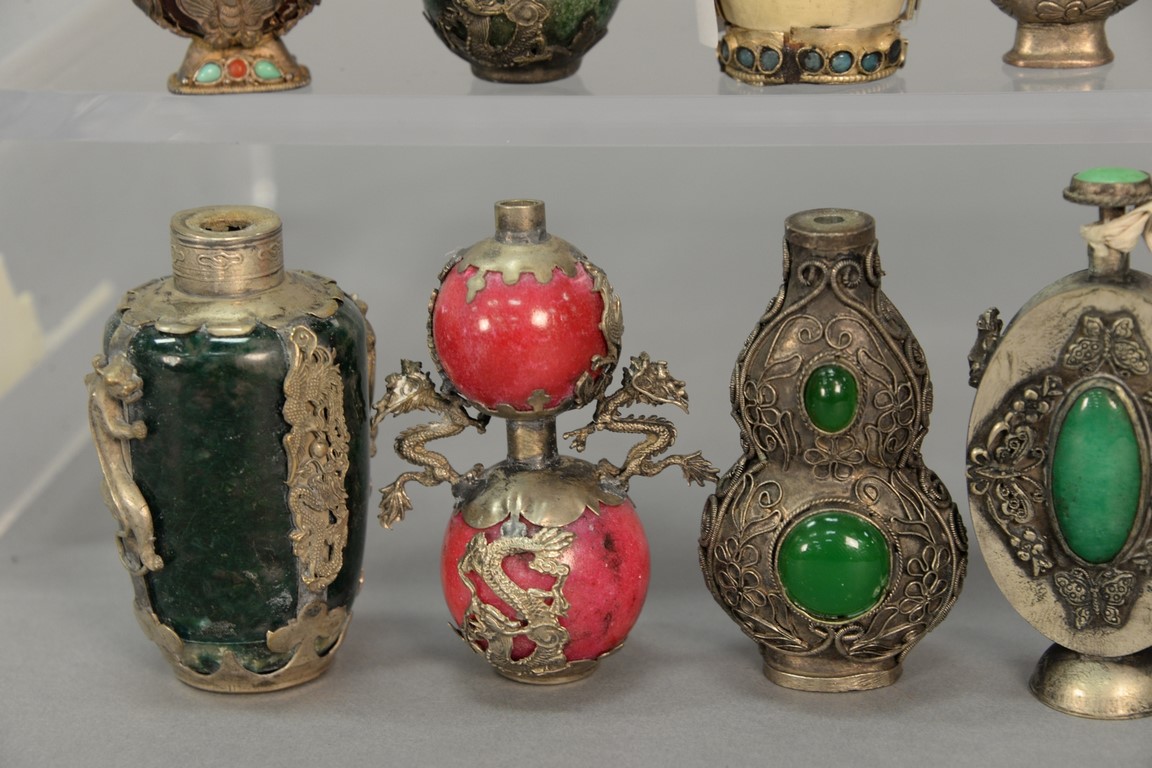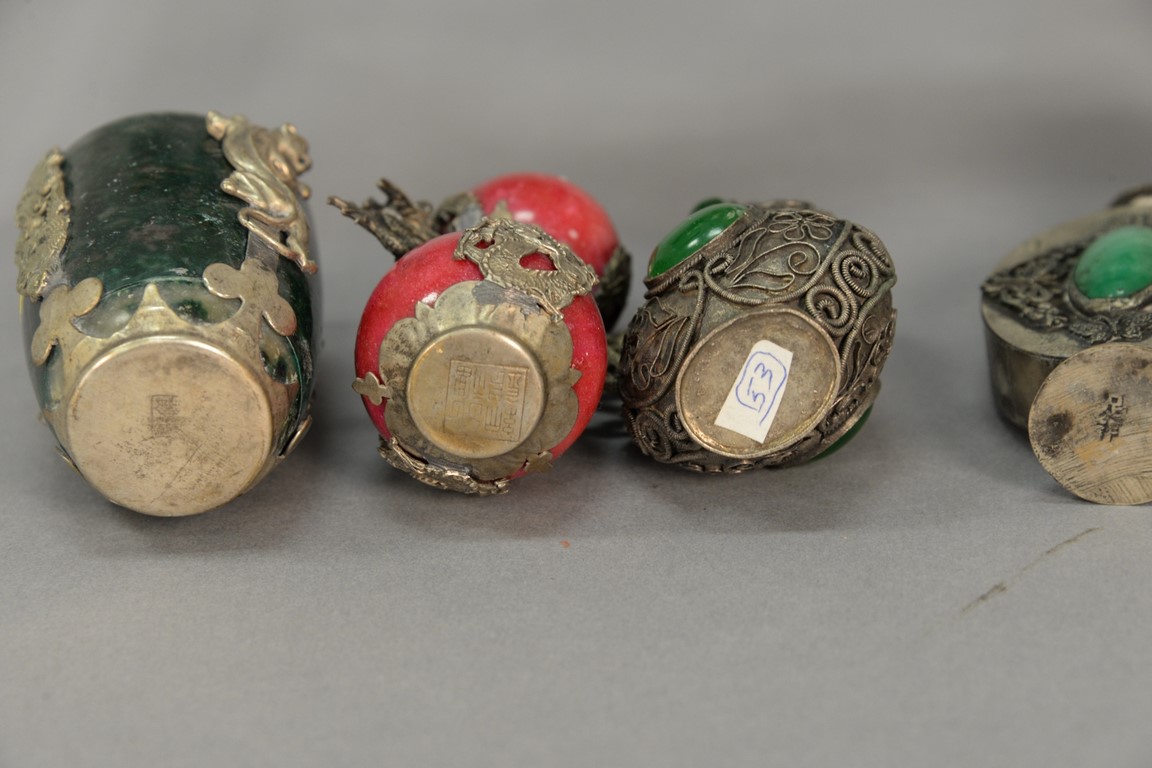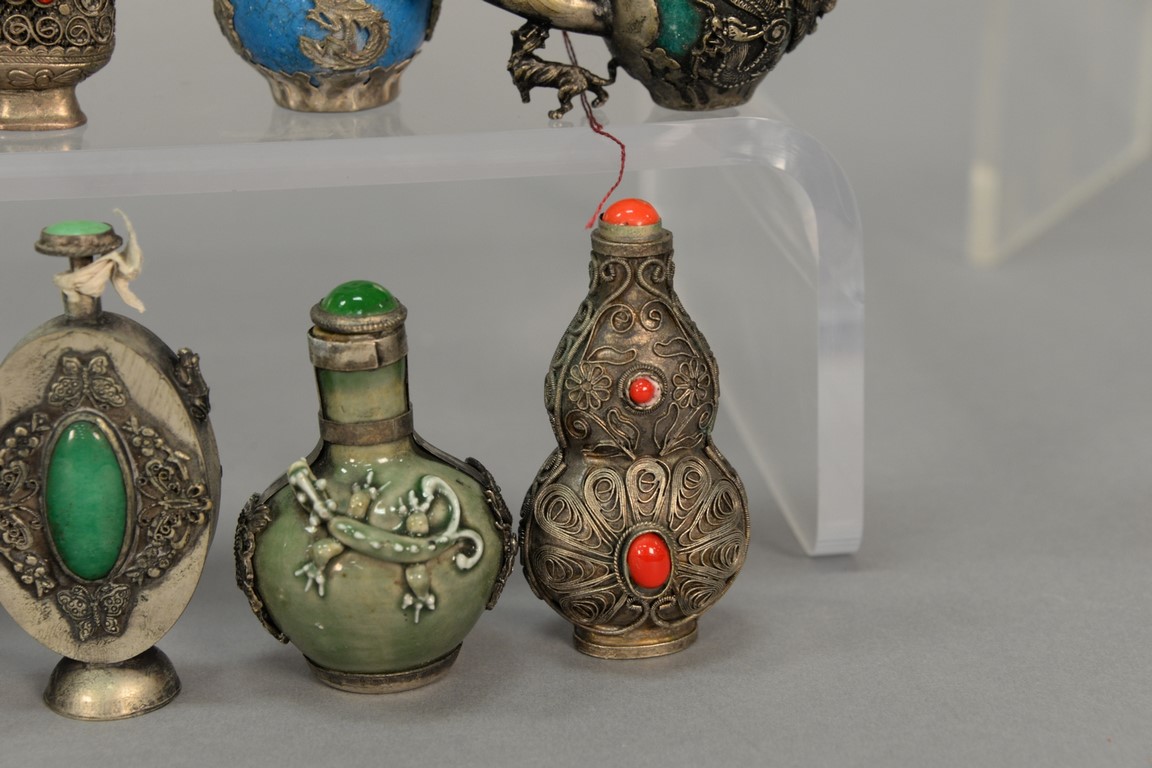Lot 415: Twelve silver and jeweled mounted snuff bottles to include six silver mounted dragon hardstone bottles, six snuff bottles mounted wi…