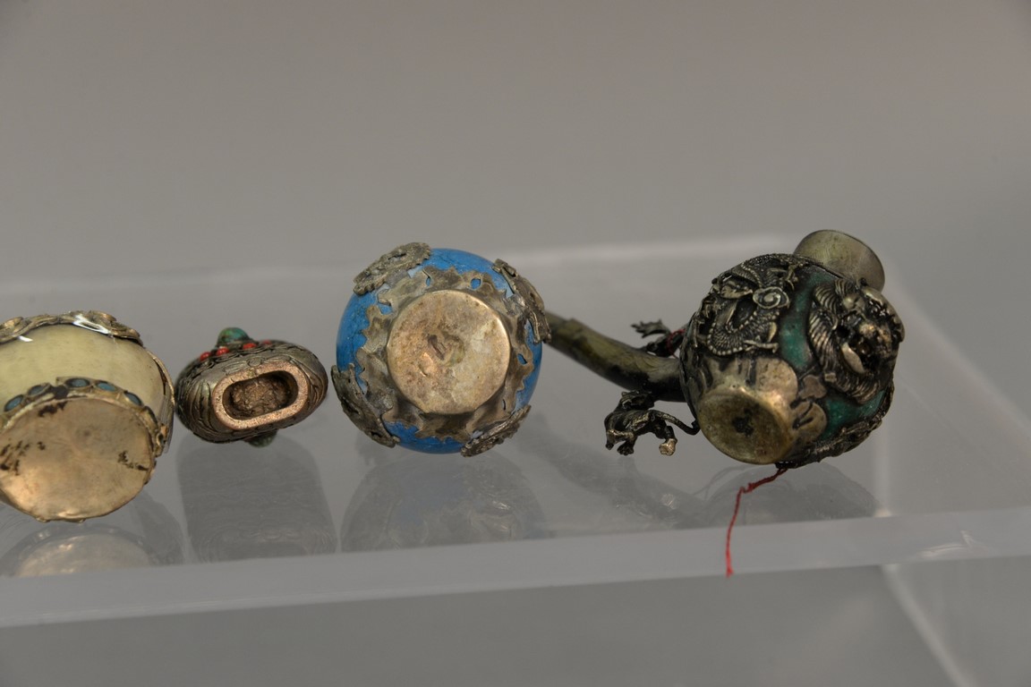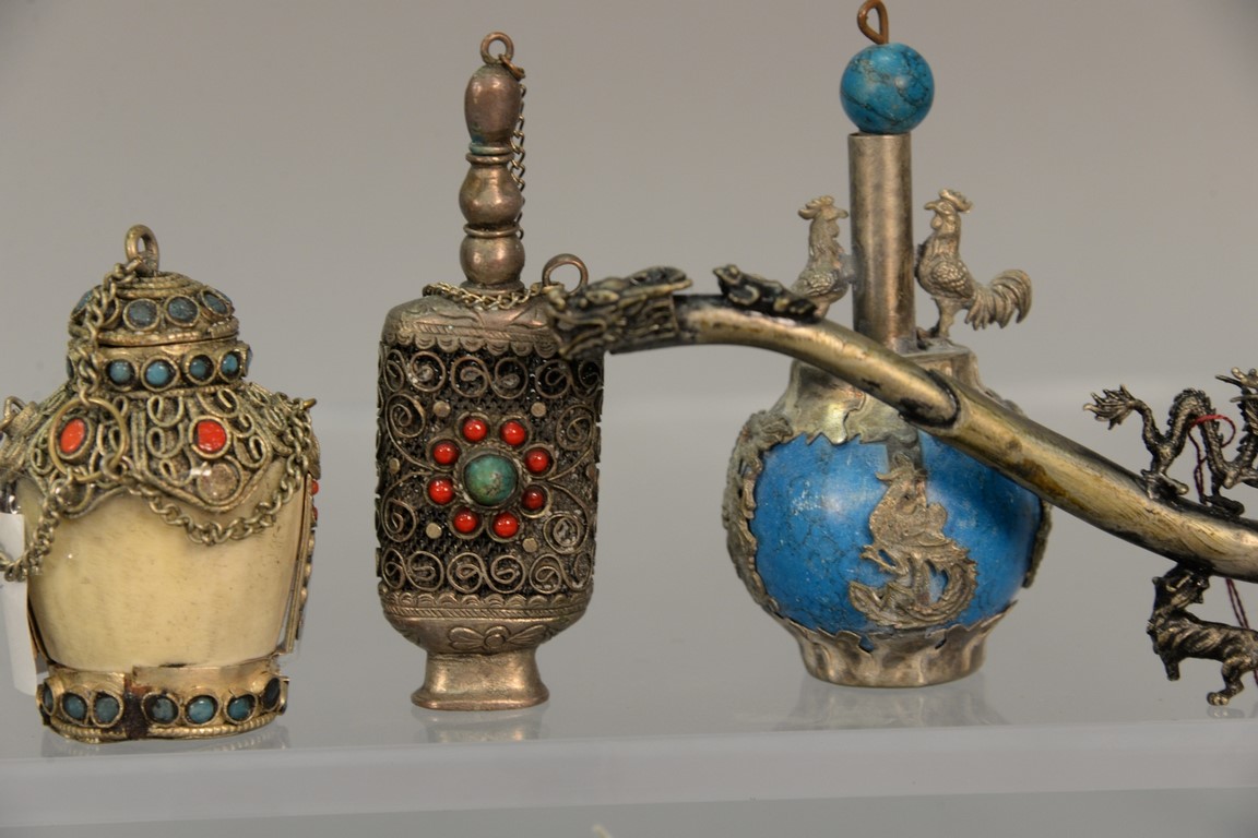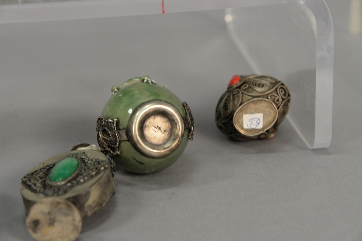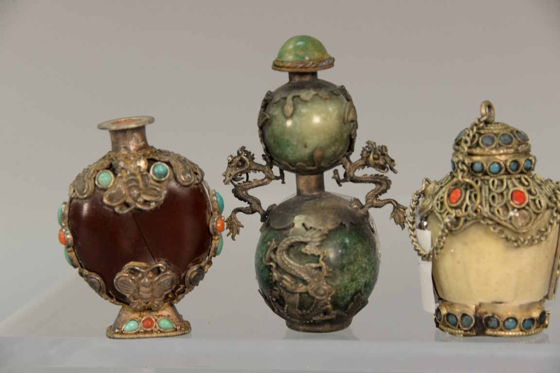 Lot 415: Twelve silver and jeweled mounted snuff bottles to include six silver mounted dragon hardstone bottles, six snuff bottles mounted wi…