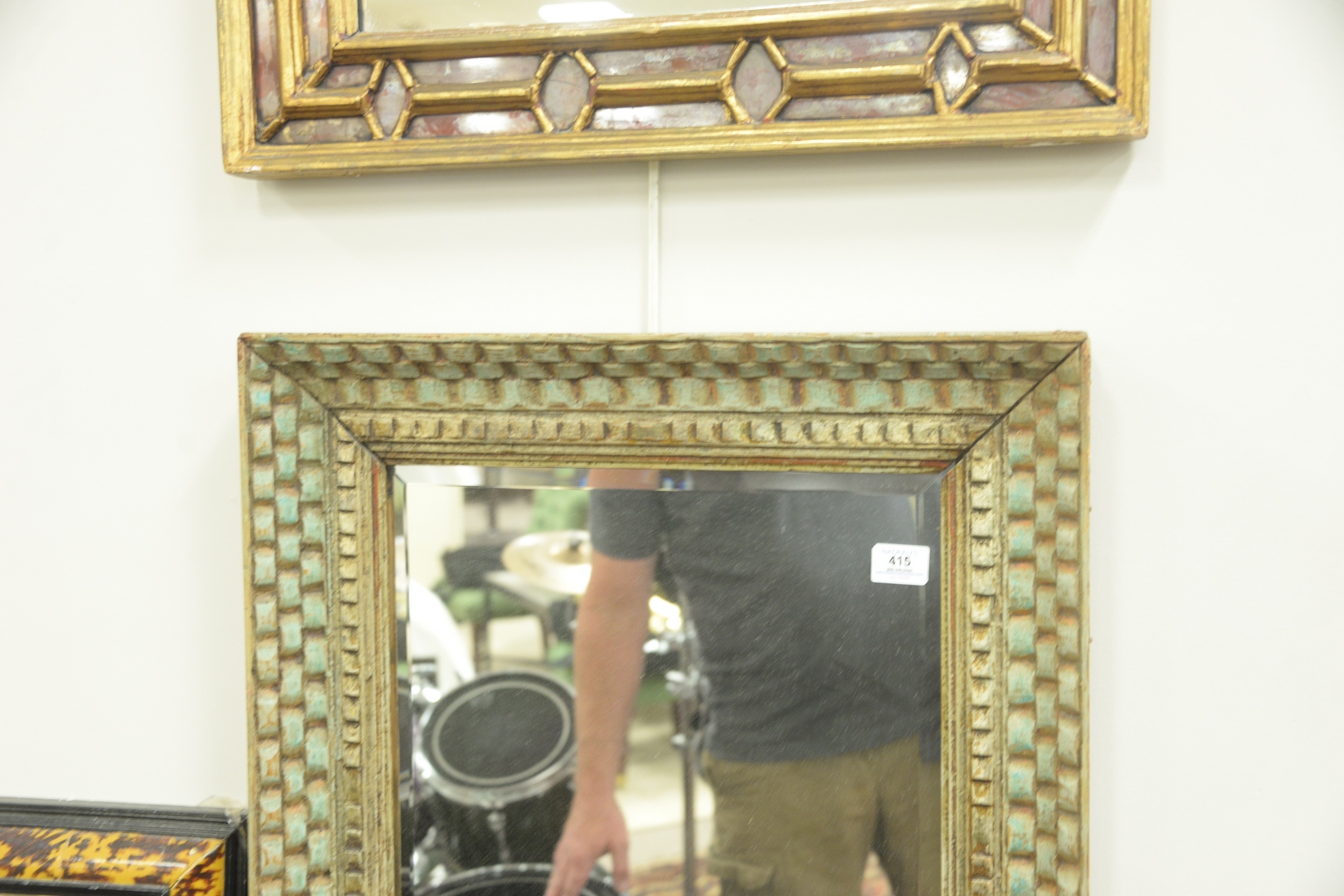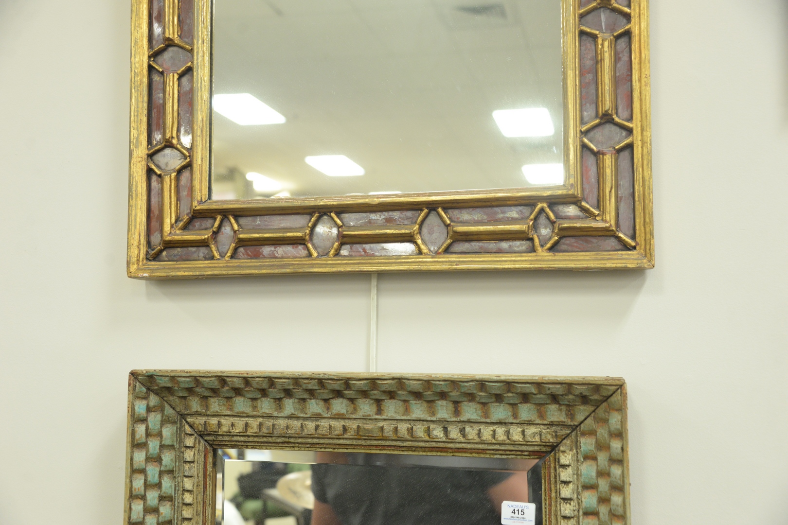 Lot 415: Two Contemporary Mirrors, to include Continental style rectangle mirror with gilt and glass frame, along with a painted, framed mirror, 27 1/2″ x 24″ and 39″ x 26″.