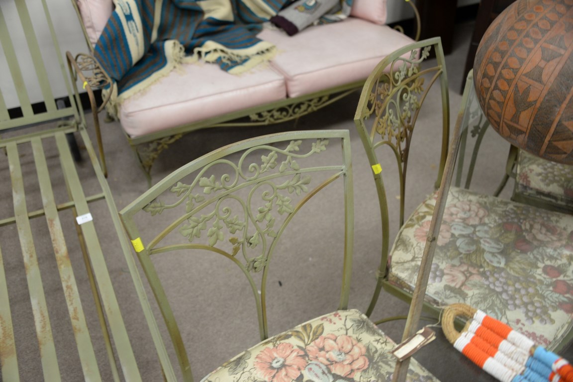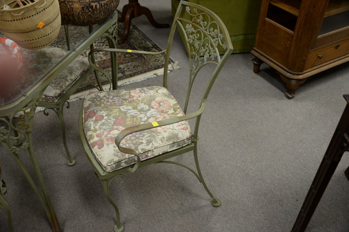 Wrought iron glass top table and six chairs. ht. 29 in. top: 31 x 51
