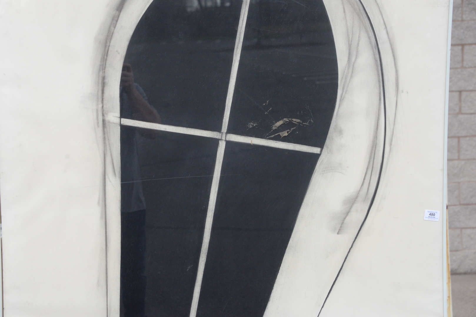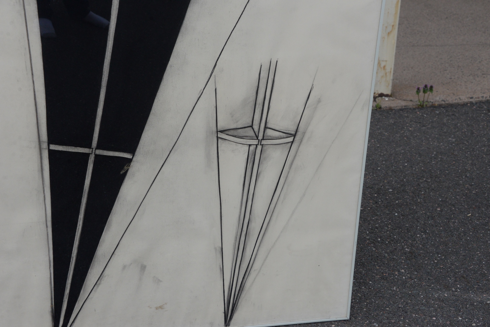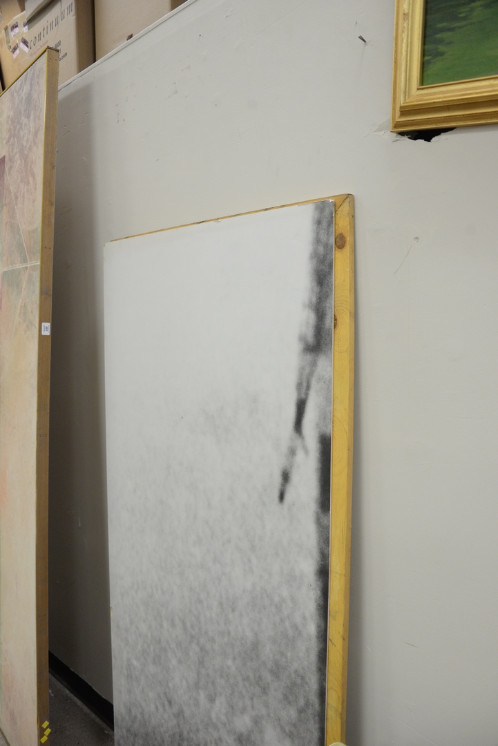 Three Piece Lot to include John Monti American, 20th century, Wedge Points, 1982, acrylic and charcoal on paper, unsigned, 83 x 42 along with Donald Newman American, b. 1955, untitled, two pieces, 1980, photograph and charcoal on paper mounted on foamcore, unsigned, overall 72 x 72, works have unattached from wooden supports.
