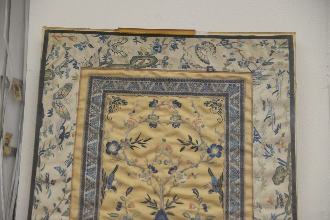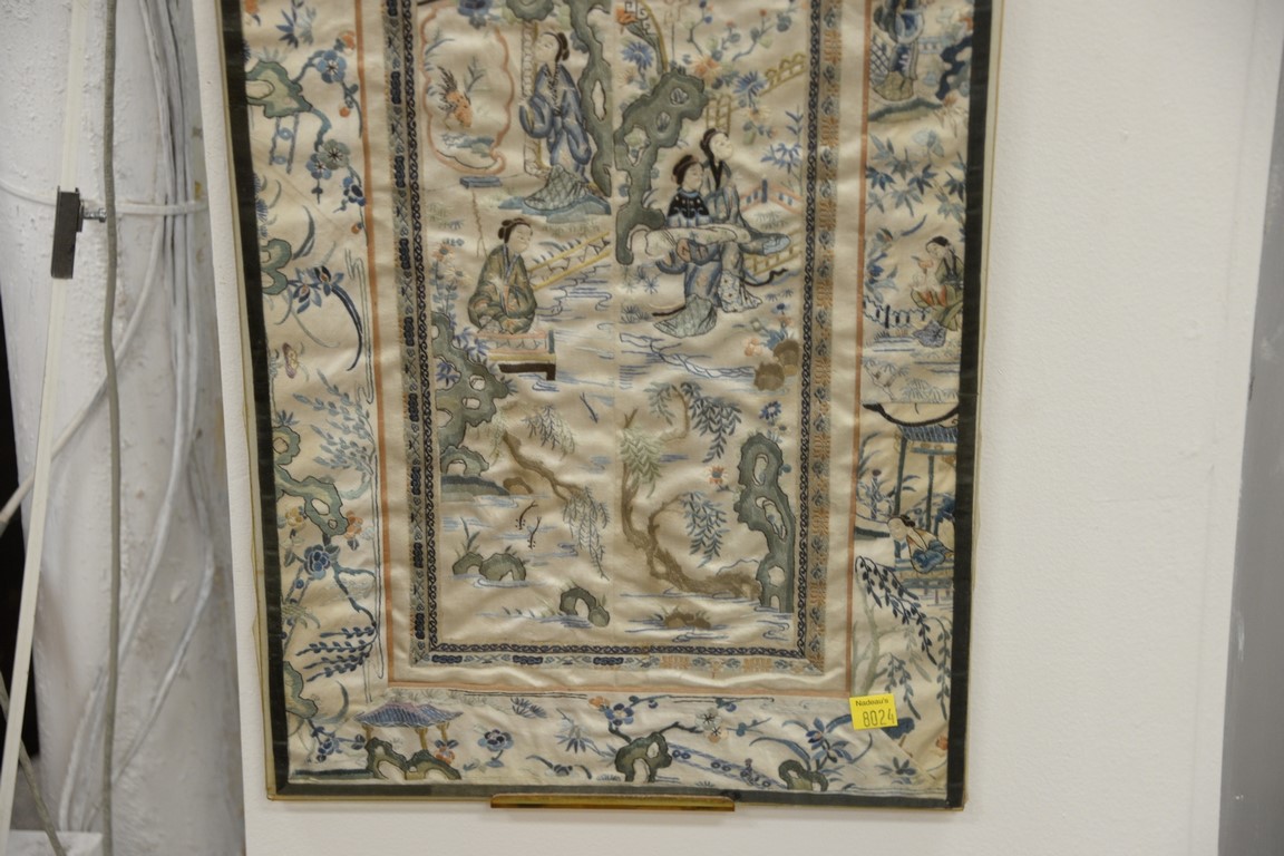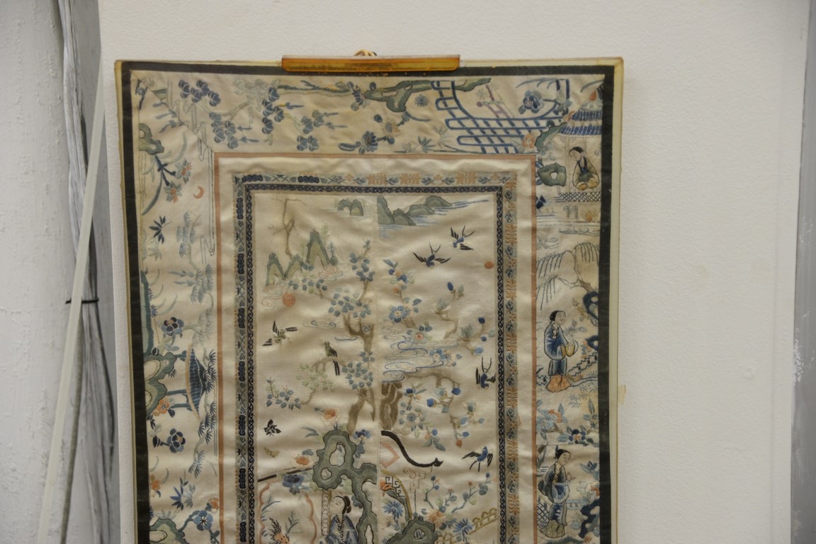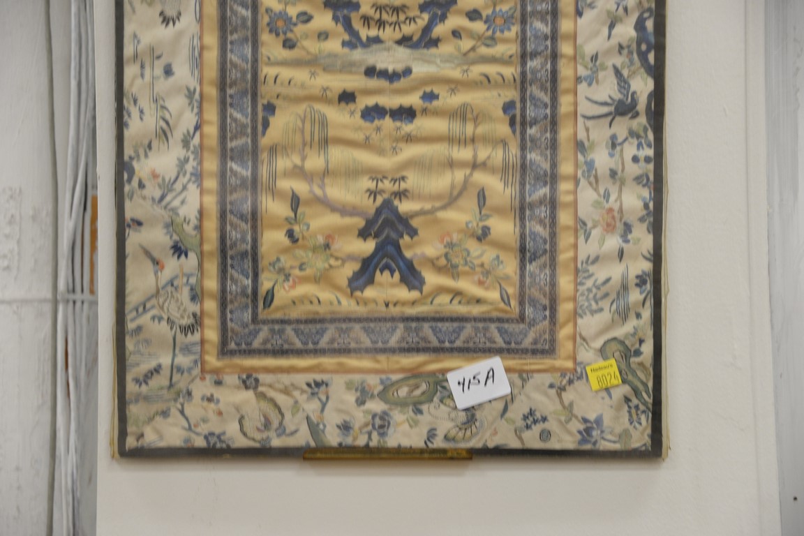 Lot 415A: Two Oriental silk panels including one embroidered blossoming tree and birds and the other a Guanyin in a courtyard with scrolling p…