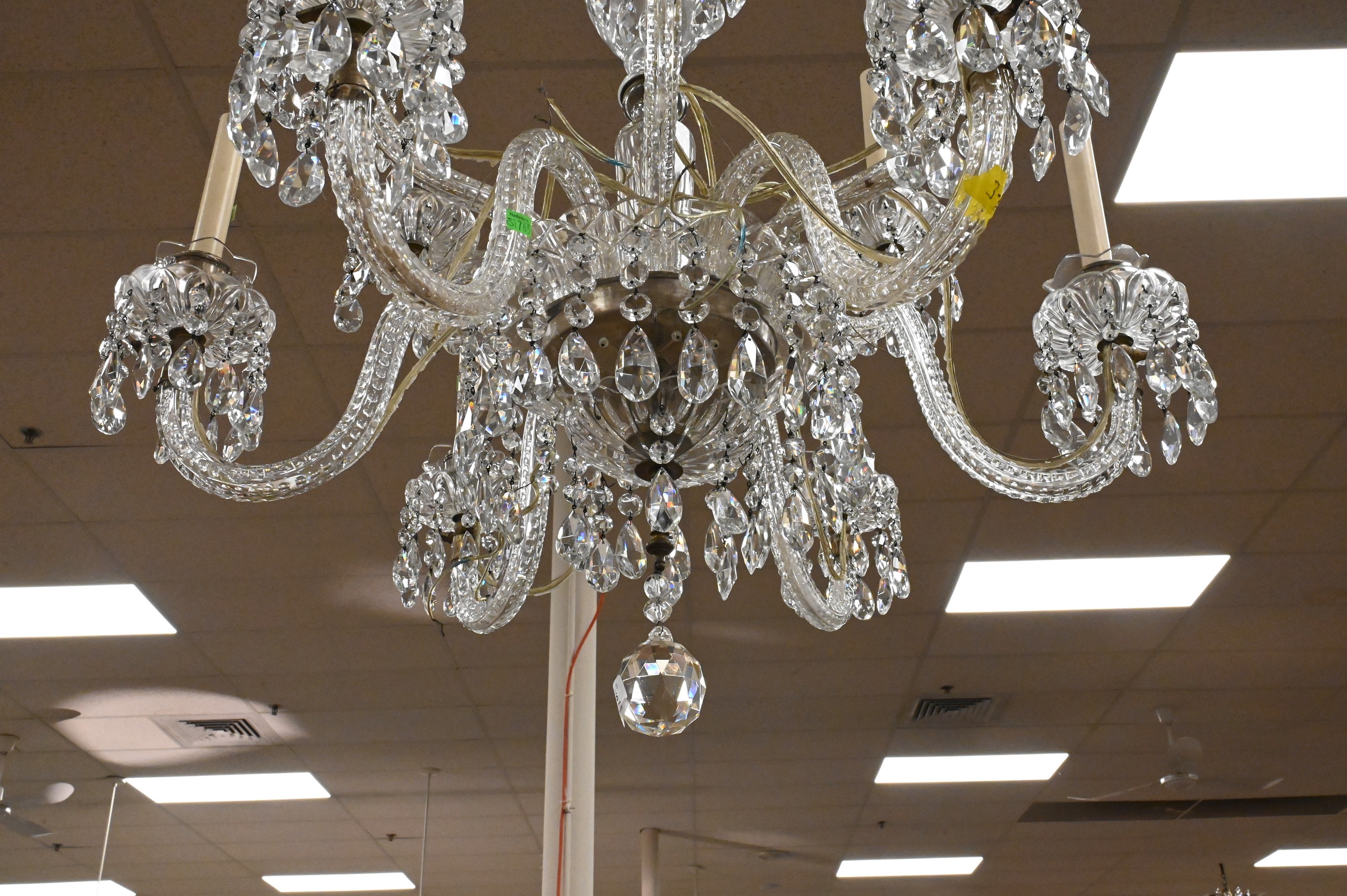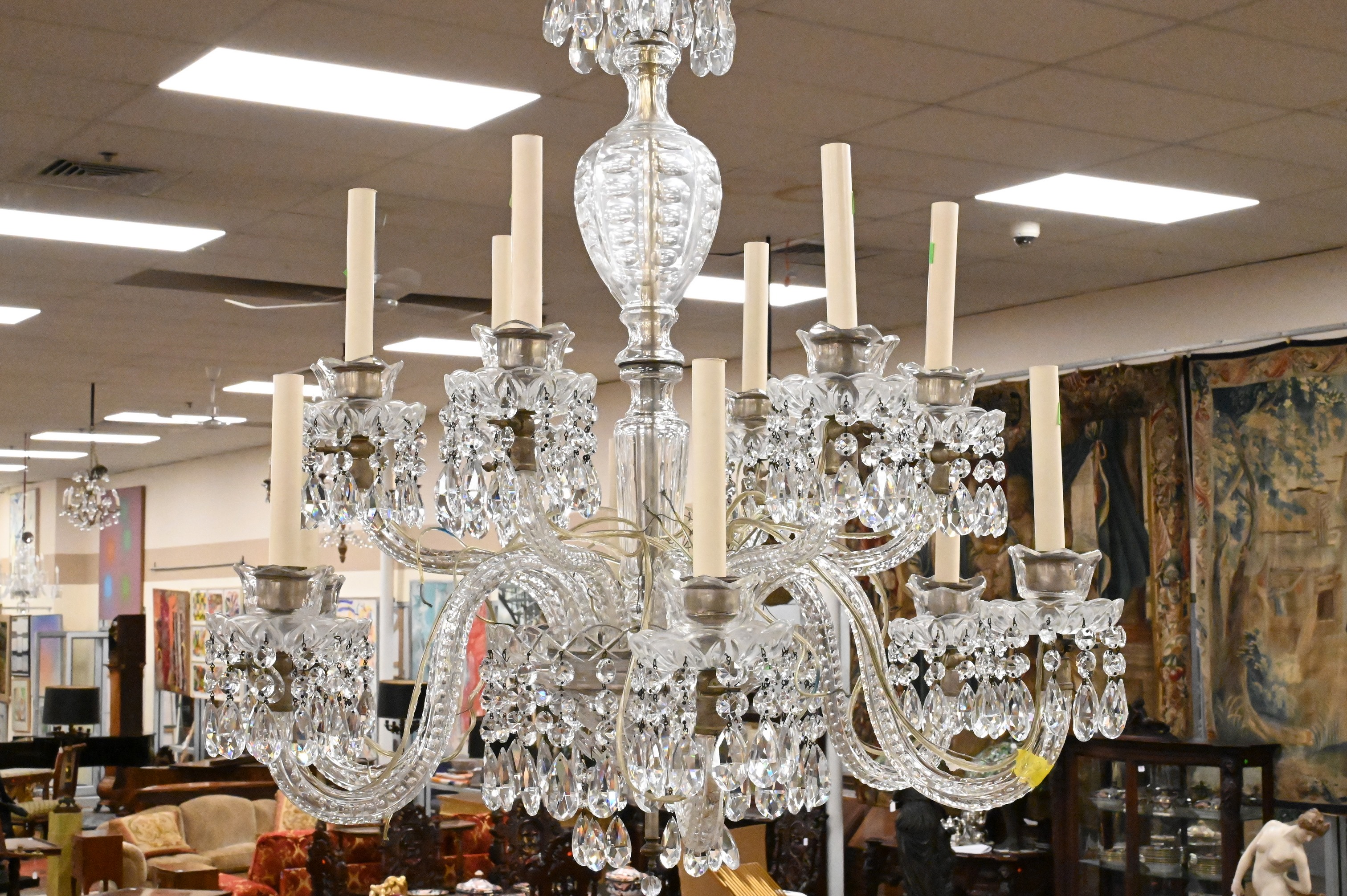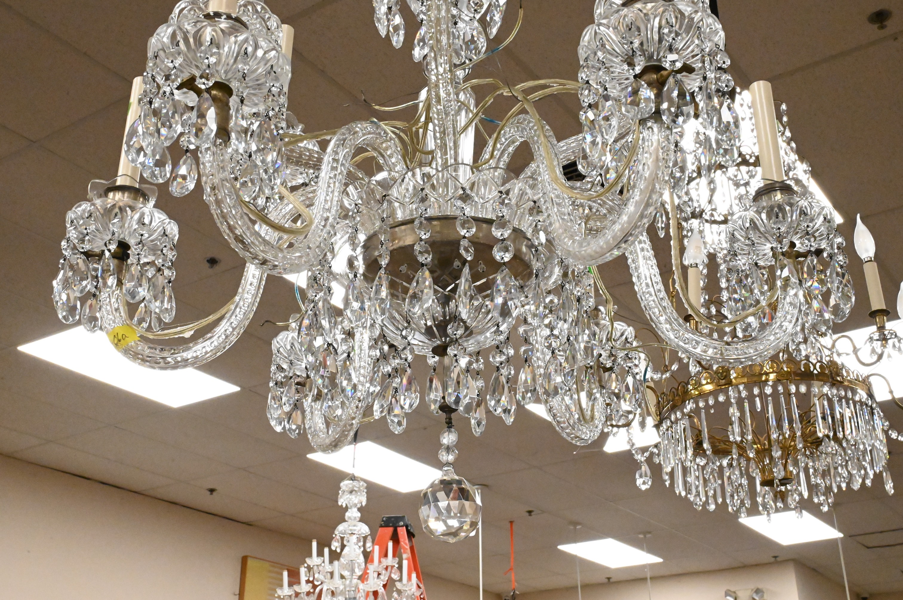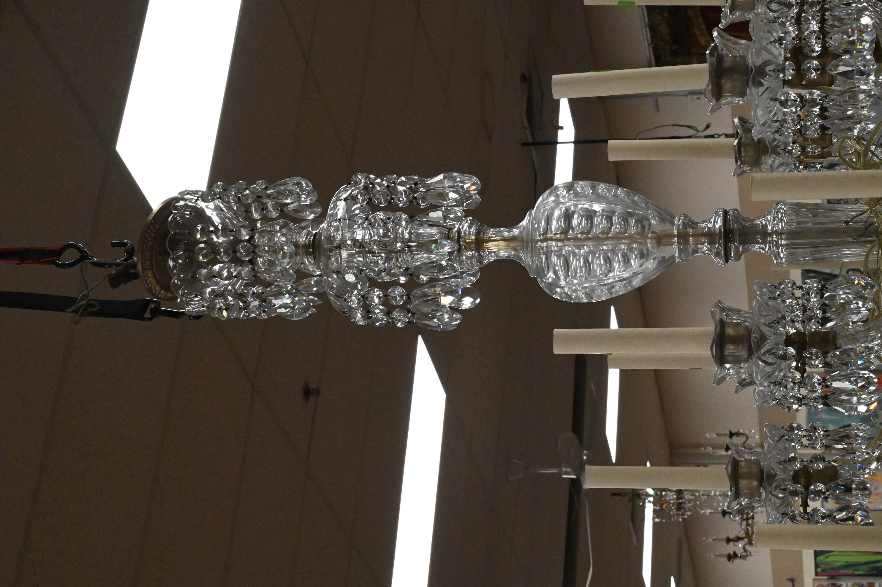 Condition: presents well, made up of different elements, bobeches are pressed glass, arms are from old glass chandelier, a few prisms are chipped/missing