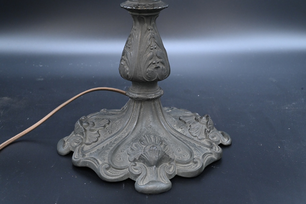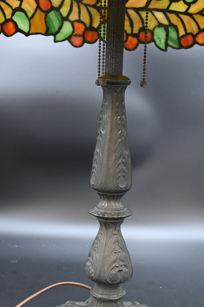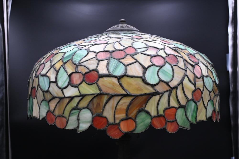 Lot 416: Chicago Mosaic Leaded Glass Table Lamp, cherry tree pattern having red cherries, green leaves and caramel ground, shade diameter 18 …