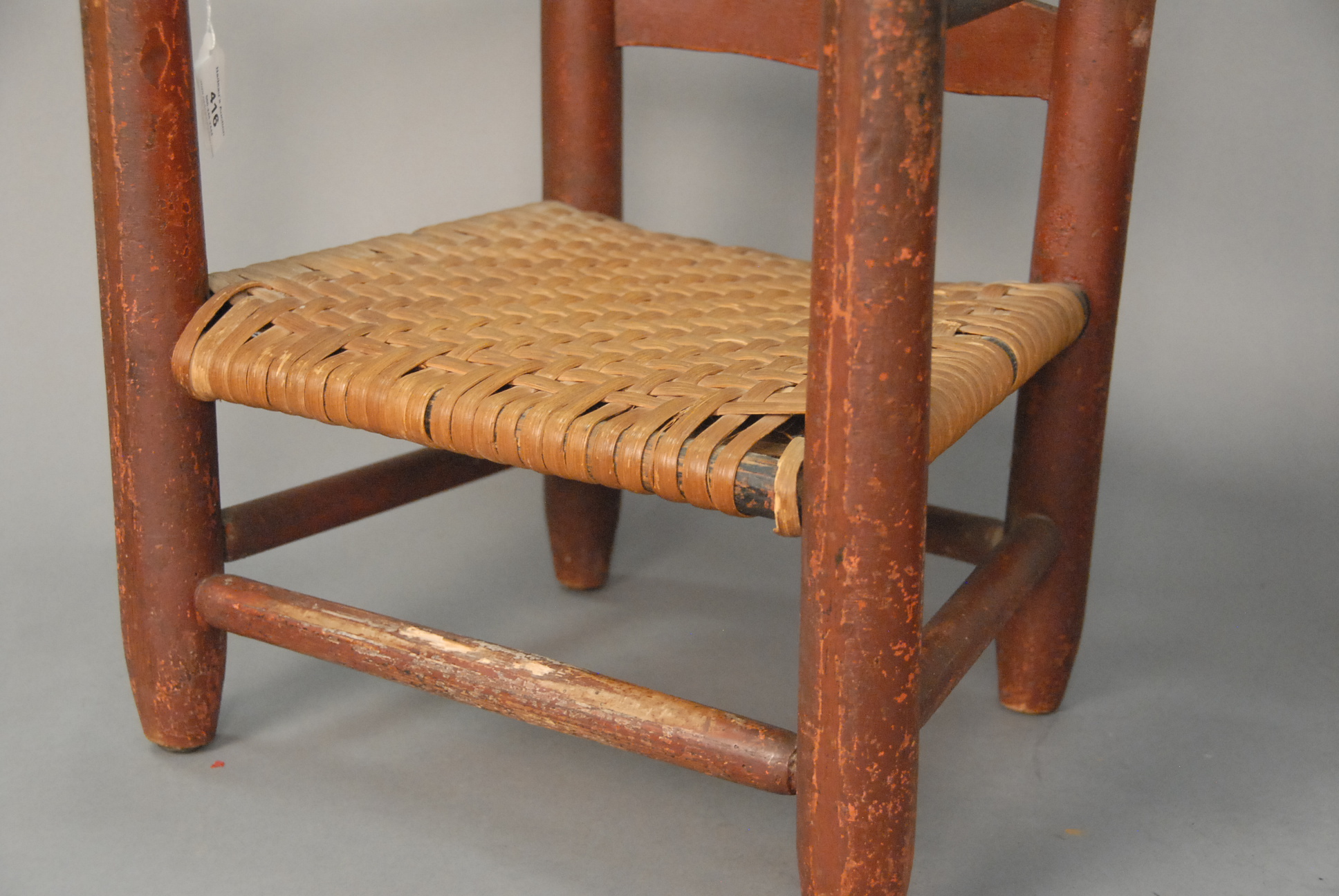 Lot 416: Child’s ladderback armchair, three slat with turned finials and hand rests, in old red paint. seat ht. 7 1/2 in. Provenance: Property from the Estate of Elizabeth and Edward Wallace of The Tracy House in Meriden, Connecticut.